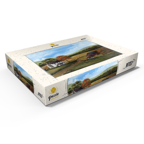 -Eine malerische Herbstlandschaft mit einem bezaubernden weißen Bauernhaus, umgeben von leuchtendem Herbstlaub. In der Nähe befindet sich eine rote Scheune mit der Aufschrift „Kürbisse“, die ein festliches Kürbisfeld beherbergt, auf dem Familien eine Heuwagenfahrt unternehmen können. Sanfte Hügel und ein klarer blauer Himmel vervollständigen die ruhige ländliche Umgebung. Dieses Kunstwerk fängt das Wesen des Herbstes wunderbar ein und weckt Gefühle von Wärme, Ernte und den einfachen Freuden der Jahreszeit.