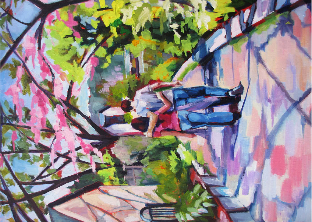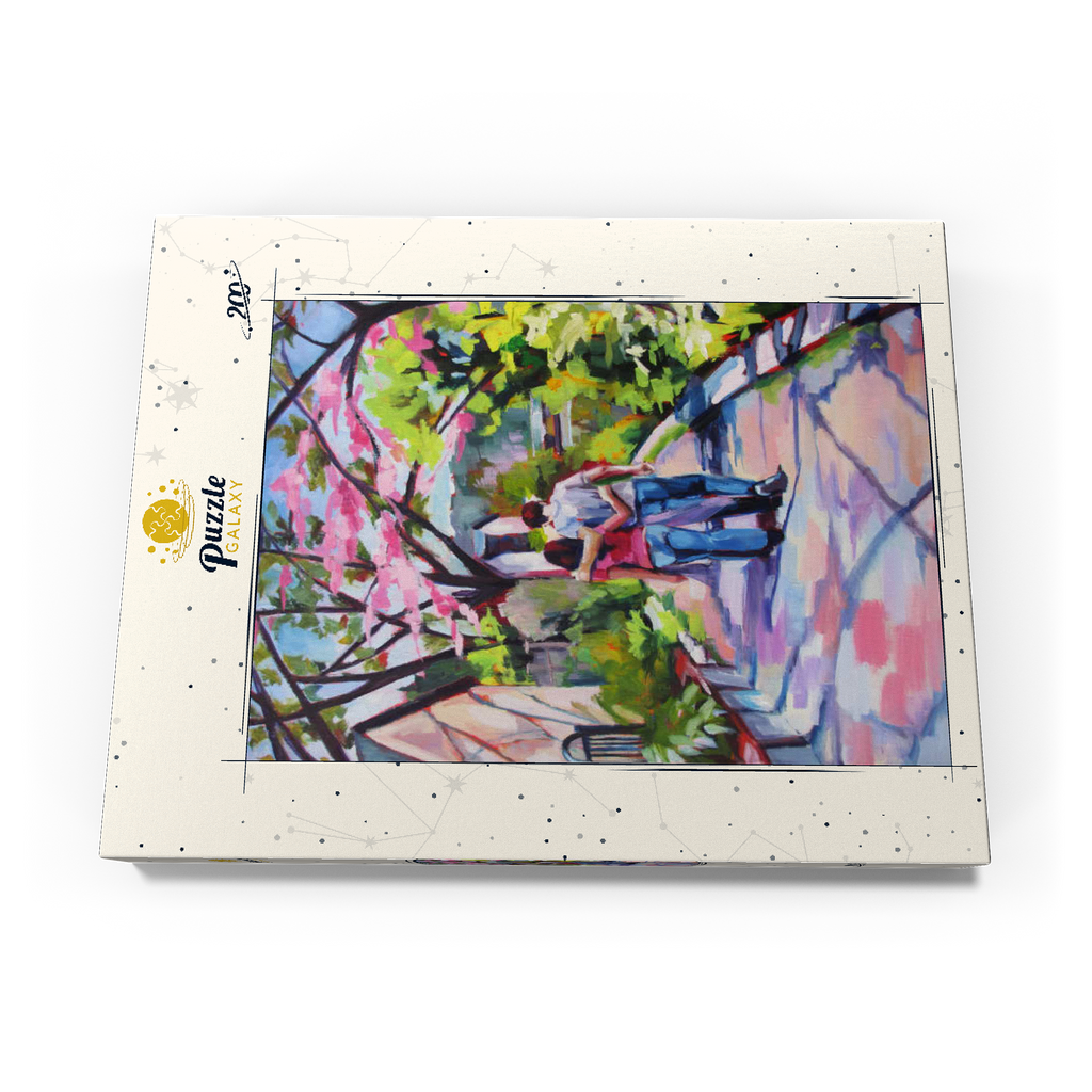 Dieses herzerwärmende Gemälde zeigt einen heiteren Moment, in dem ein Paar Arm in Arm einen farbenfrohen, von der Natur umgebenen Weg entlanggeht. Leuchtend rosafarbene Blüten schmücken die Bäume und bilden einen schönen Kontrast zu dem leuchtenden Grün des Laubes. Die lockeren, ausdrucksstarken Pinselstriche und die kräftige Verwendung von Farben erzeugen ein impressionistisches Gefühl und unterstreichen die romantische, ruhige Atmosphäre. Das Sonnenlicht dringt durch die Bäume und wirft ein schummriges Licht auf den Weg, das die Freude und den Frieden eines Frühlingsspaziergangs unterstreicht.