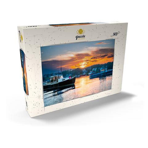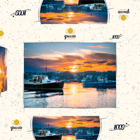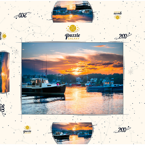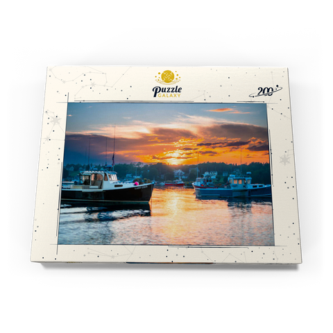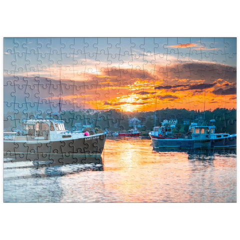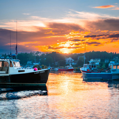Diese malerische Szene fängt die Schönheit eines Küstenhafens bei Sonnenuntergang ein, mit leuchtenden Orange-, Rosa- und Blautönen, die sich auf dem ruhigen Wasser spiegeln. Fischerboote ruhen sanft auf der Oberfläche, ihre Silhouetten werden durch den glühenden Himmel hervorgehoben. Im Hintergrund vervollständigen charmante Häuser am Wasser und üppiges Grün die heitere maritime Umgebung. Die friedliche Atmosphäre verkörpert den Charme eines ruhigen Abends am Meer.