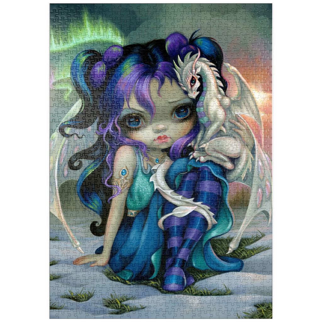 Setze mit dem Puzzle -Frost Dragonling- ein Winterwunderland zusammen! Dieses bezaubernde Puzzle zeigt eine schöne Drachenfee und ihren kleinen Drachenbeschützer. Halten Sie die frostige Szene mit den im Dämmerlicht schimmernden Nordlichtern und den Andeutungen des Frühlings fest, die durch den Schnee schimmern. Ein zauberhaftes Puzzle für Liebhaber von Fantasy-Kunst und Drachen-Enthusiasten.