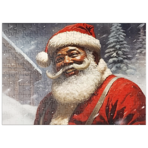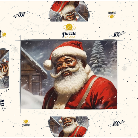 Ein herzerwärmendes Porträt des Weihnachtsmanns mit einem strahlenden, freudigen Lächeln, seinem charakteristischen roten Anzug und dem flauschigen weißen Bart, der Weihnachtsstimmung ausstrahlt. Hinter ihm vervollständigen eine gemütliche, schneebedeckte Hütte und vereiste Evergreens die idyllische Winterlandschaft. Der herabfallende Schnee verleiht dem Ganzen einen magischen Touch und fängt das Wesen der Weihnachtsfreude und den warmen Geist der Weihnachtszeit ein.