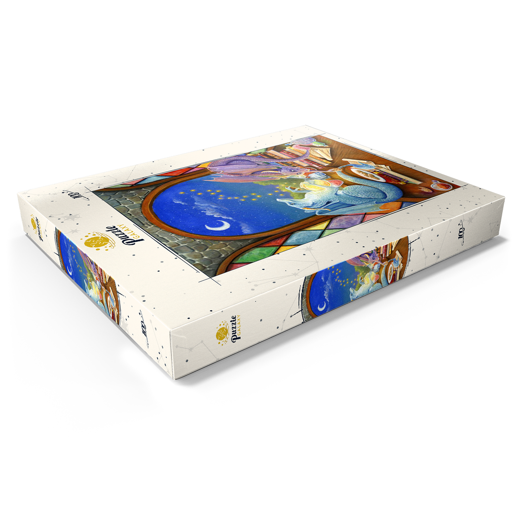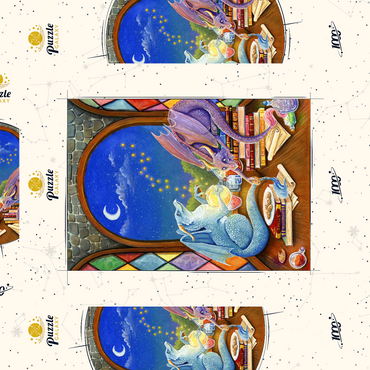 Treten Sie ein in eine skurrile Welt der Magie mit diesem bezaubernden Fantasy-Kunstwerk, das zwei verspielte Drachen in einem mystischen Arbeitszimmer zeigt. Ein blau schimmernder Drache hält zärtlich eine glühende Kugel, die unter dem Sternenhimmel einen himmlischen Zauberspruch beschwört. Daneben taucht ein königlicher lila Drache spielerisch einen Keks in einen wirbelnden Trank, umgeben von alten Zauberbüchern, Tränken und magischen Artefakten. Die Szene wird von leuchtenden Buntglasfenstern eingerahmt, die die traumhafte Atmosphäre noch verstärken. Diese sehr detaillierte und fantasievolle Illustration fängt das Wunder der Fabelwesen und den Charme der Fantasy-Geschichten ein und ist damit eine perfekte Ergänzung für jede Fantasy-Kunstsammlung.