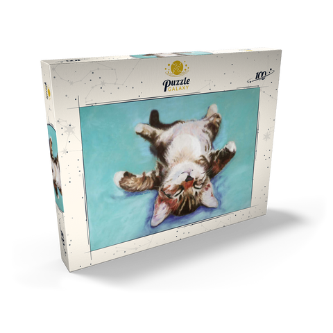 Dieses bezaubernde Kunstwerk zeigt ein ruhiges Kätzchen, das auf dem Rücken liegt und sich vor einem sanften türkisfarbenen Hintergrund entspannt. Die zarten Pinselstriche heben das flauschige Fell und die entspannte Haltung des Kätzchens hervor und fangen einen Moment purer Ruhe perfekt ein. Die Pastellfarben und die sanfte Komposition strahlen Wärme und Behaglichkeit aus und machen dieses Werk zu einer liebenswerten Hommage an die verspielte Unschuld von Katzen.