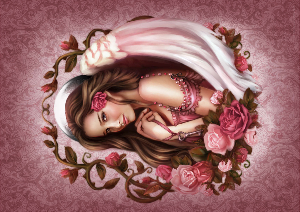 Der Rosenengel von Brigid Ashwood verkörpert Liebe, Schönheit und sanfte Hingabe. Eingerahmt von zarten elfenbeinfarbenen Flügeln und blühenden Rosen blickt sie mit einem warmen, wissenden Lächeln. An ihrer Hand hängt ein zarter Schlüssel, der verborgene Geheimnisse und die Geheimnisse des Herzens symbolisiert. Mit sanften Rosatönen, fließenden Details und aufwendigen Verzierungen strahlt dieses bezaubernde Stück Romantik, Anmut und zeitlose Eleganz aus.