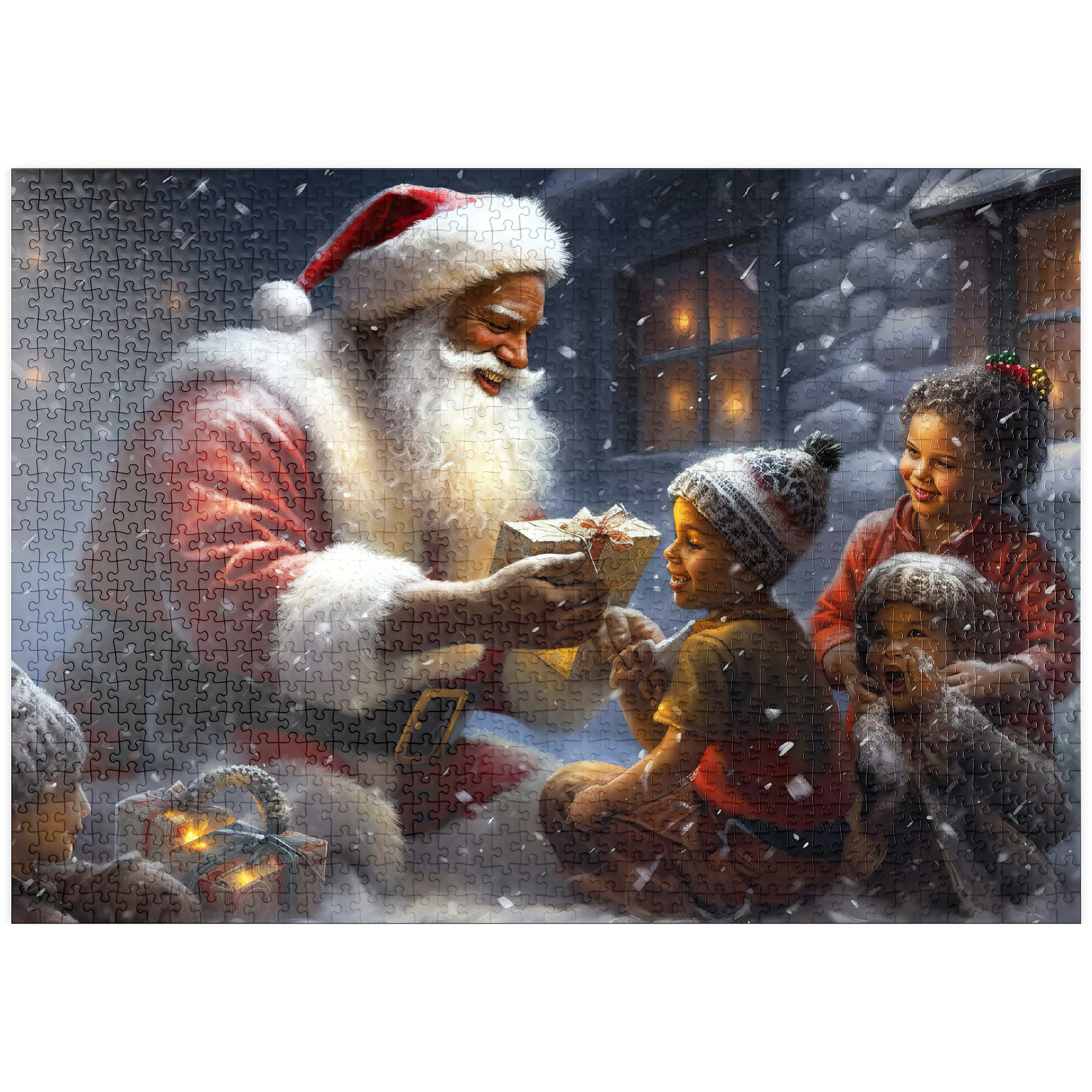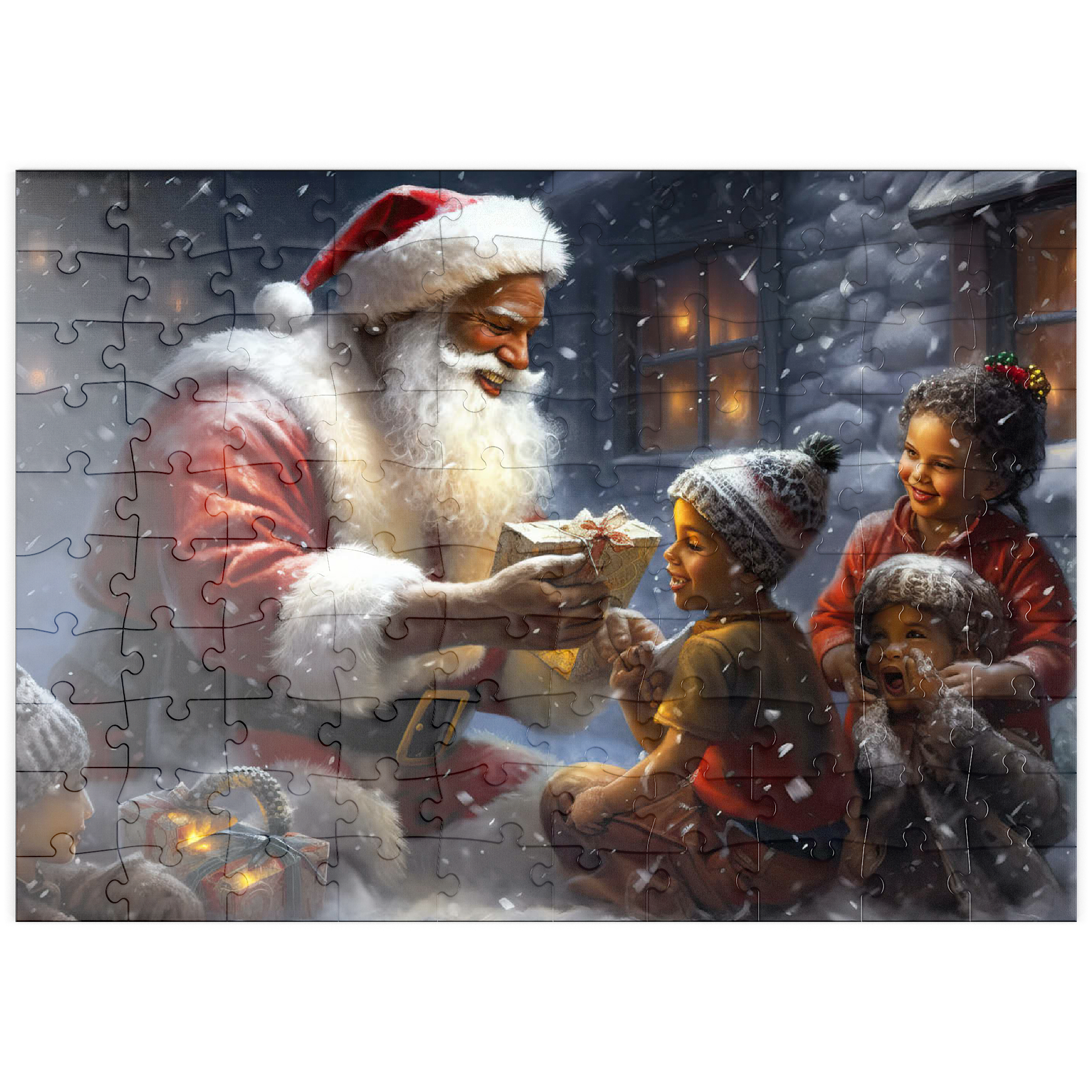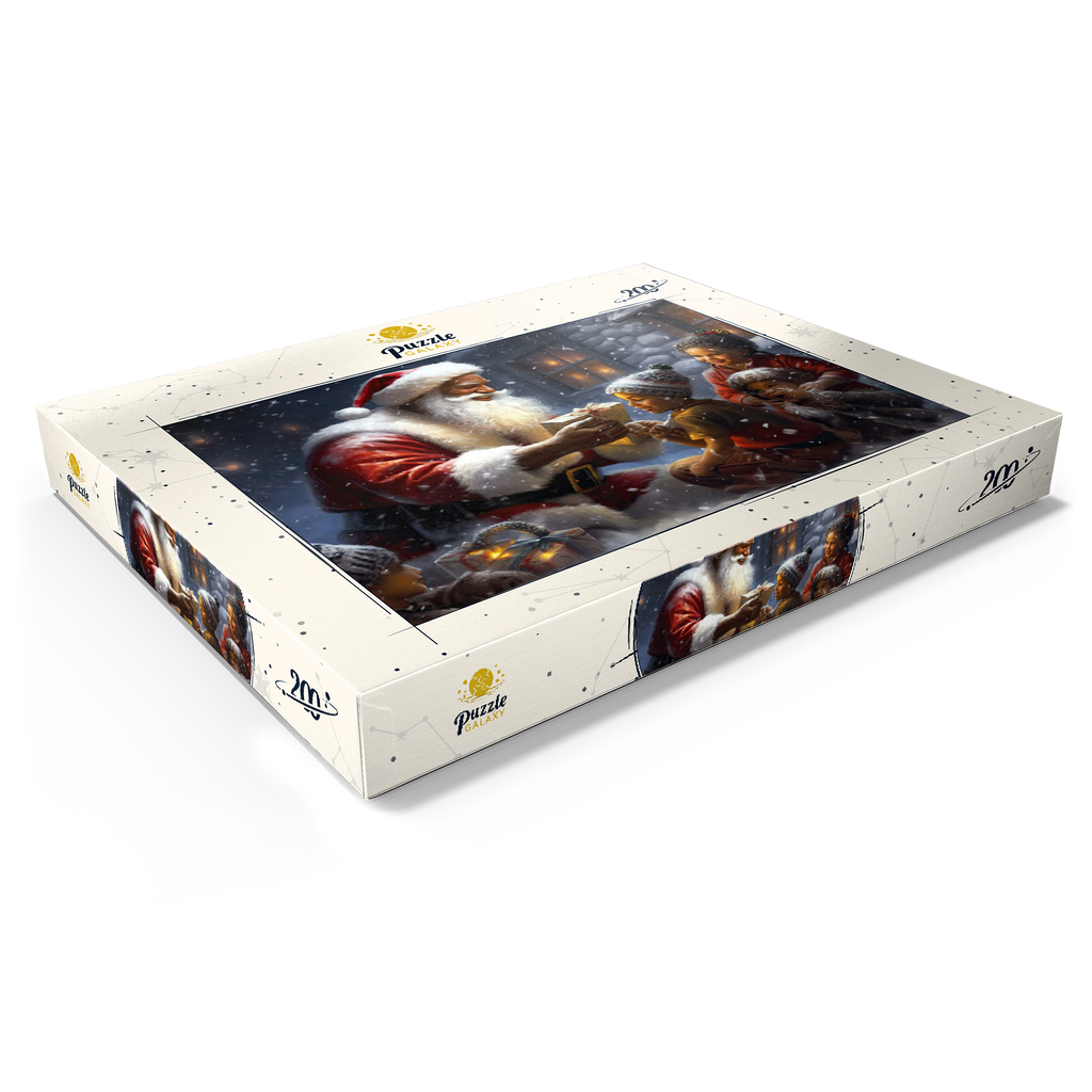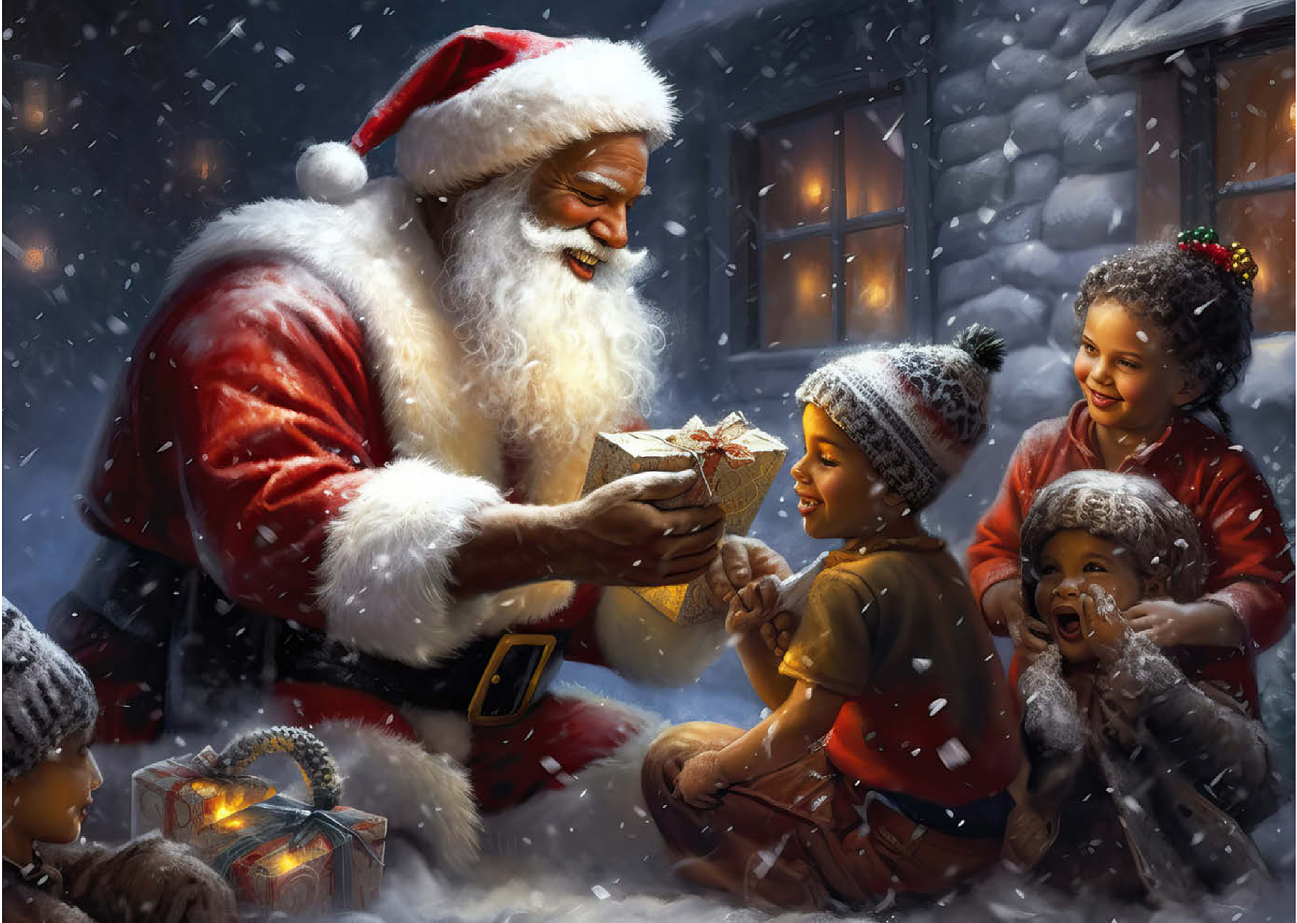Eine herzerwärmende Weihnachtsszene mit dem Weihnachtsmann, der im Schnee kniet und einem aufgeregten Kind freudig ein eingepacktes Geschenk überreicht. Der gemütliche Schein eines schneebedeckten Hauses im Hintergrund verstärkt die festliche Atmosphäre. Die Kinder, warm gekleidet mit Mützen und Schals, sind voller Staunen und Freude und verkörpern den Zauber von Weihnachten. Der sanft fallende Schnee und die warme Beleuchtung tragen zu der bezaubernden und freudigen Stimmung der Weihnachtszeit bei.