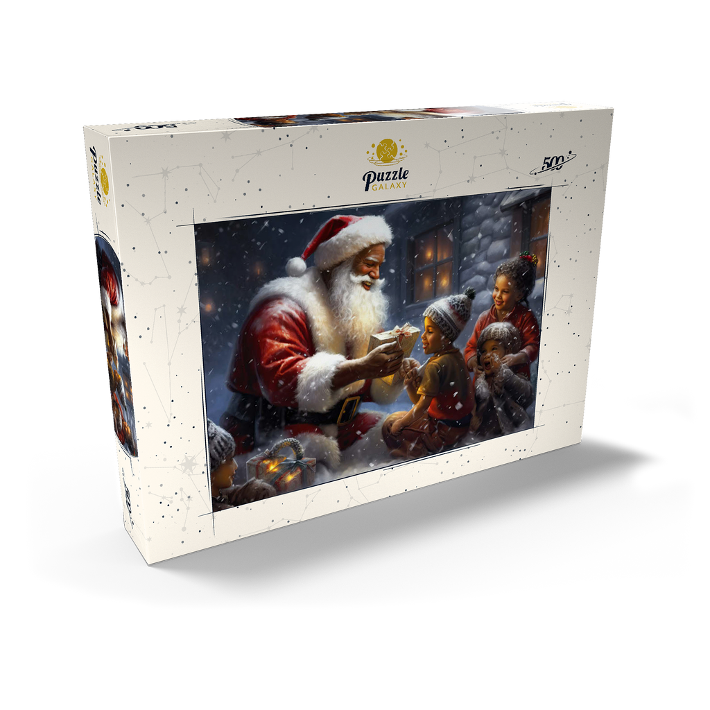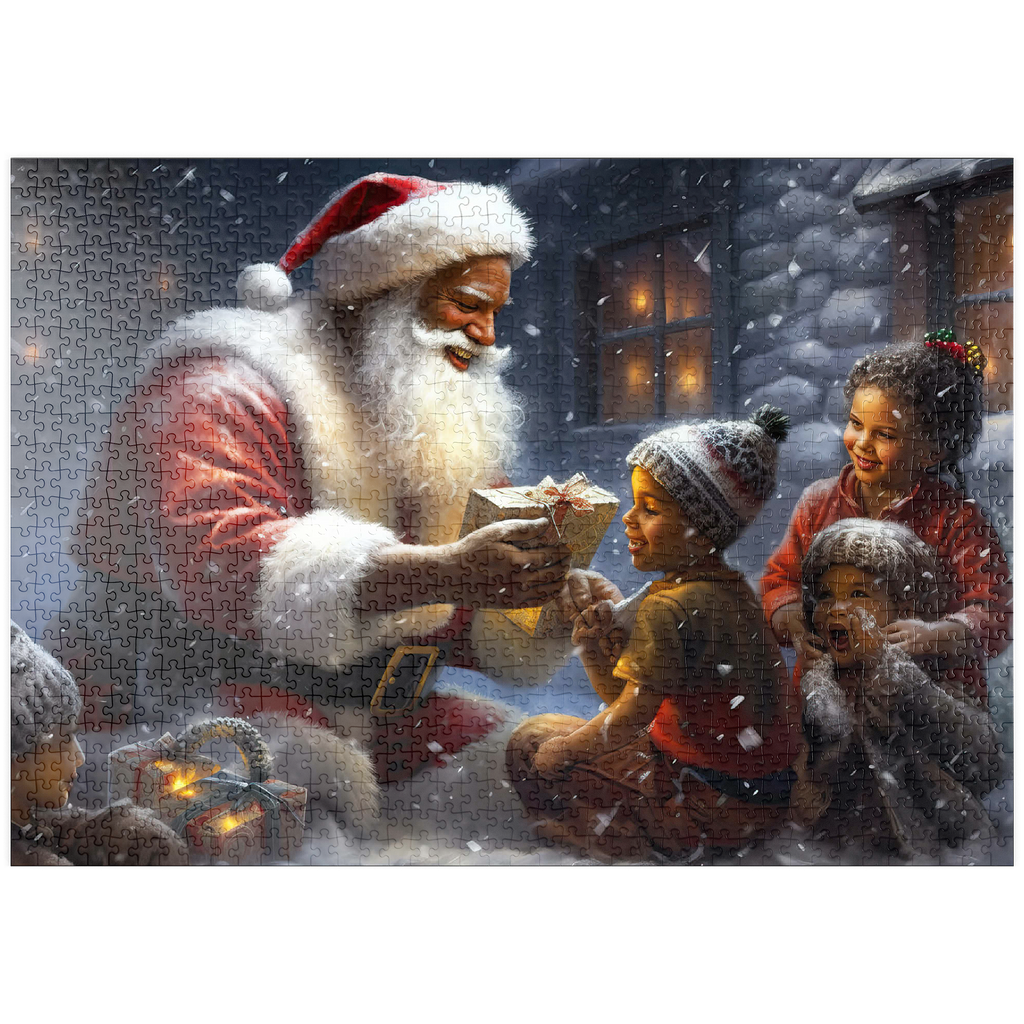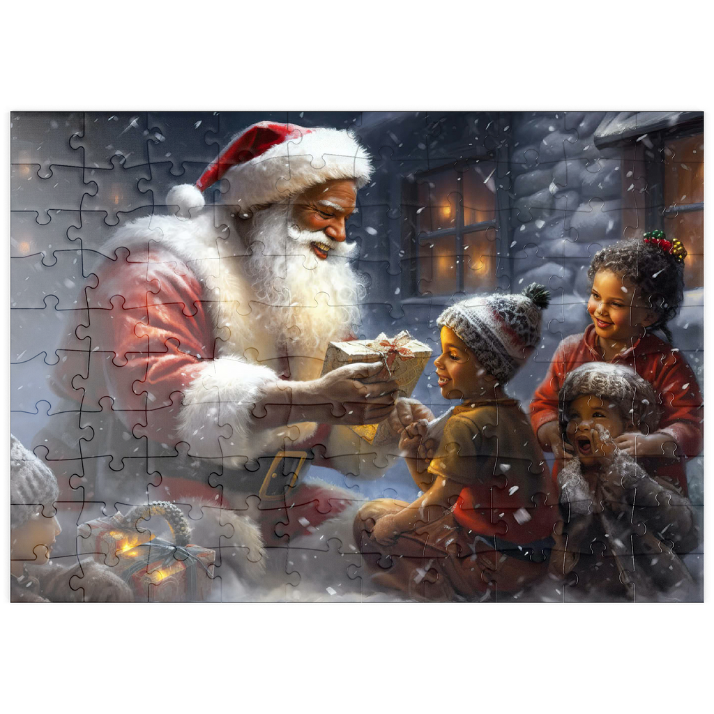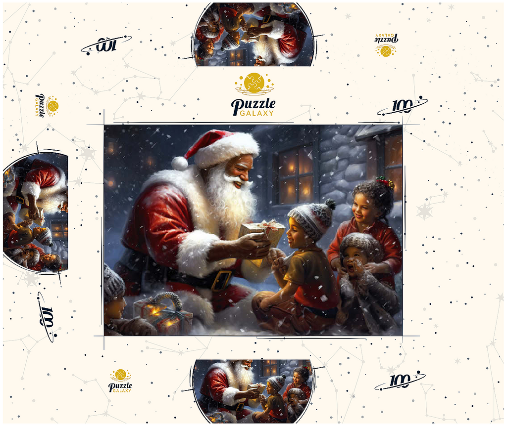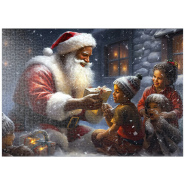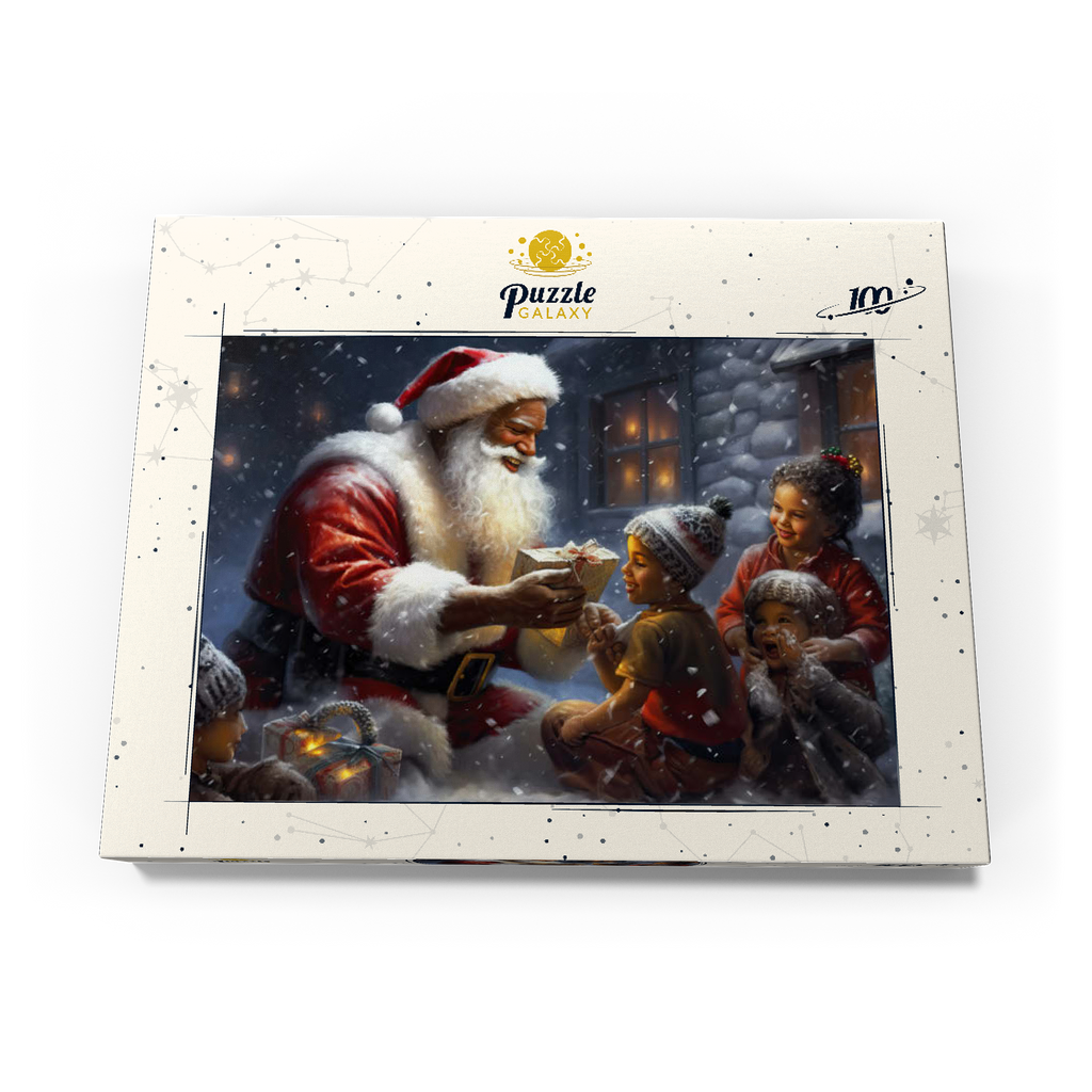 Eine herzerwärmende Weihnachtsszene mit dem Weihnachtsmann, der im Schnee kniet und einem aufgeregten Kind freudig ein eingepacktes Geschenk überreicht. Der gemütliche Schein eines schneebedeckten Hauses im Hintergrund verstärkt die festliche Atmosphäre. Die Kinder, warm gekleidet mit Mützen und Schals, sind voller Staunen und Freude und verkörpern den Zauber von Weihnachten. Der sanft fallende Schnee und die warme Beleuchtung tragen zu der bezaubernden und freudigen Stimmung der Weihnachtszeit bei.