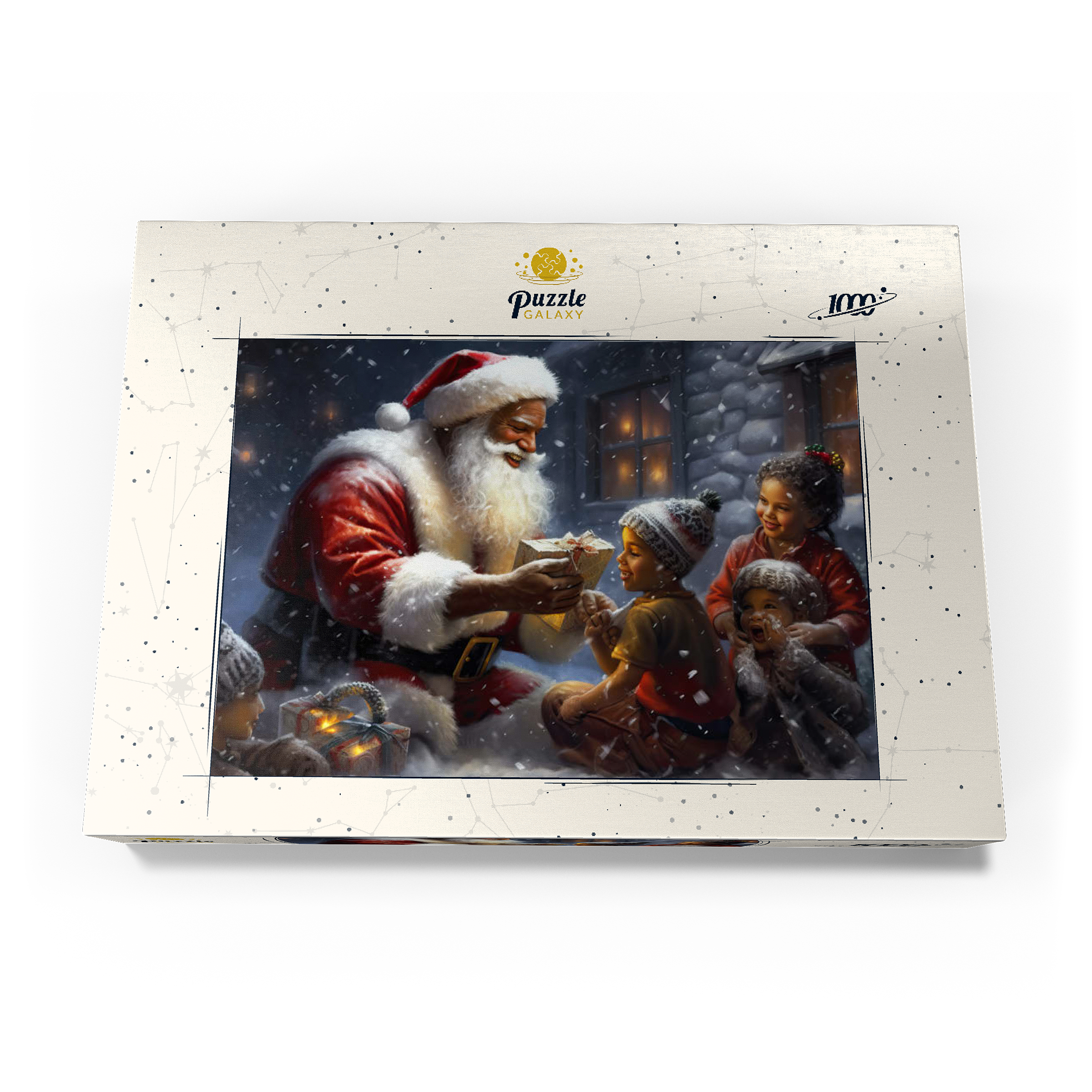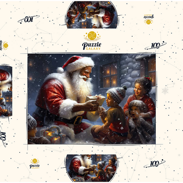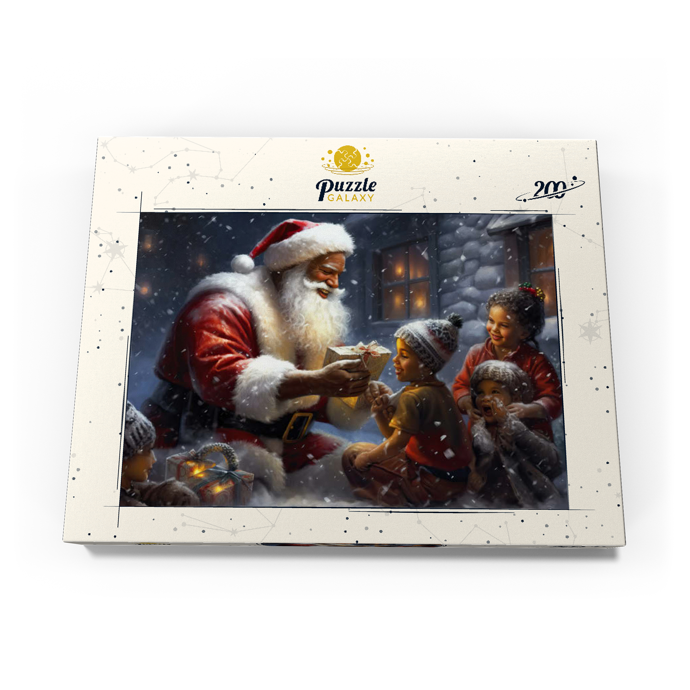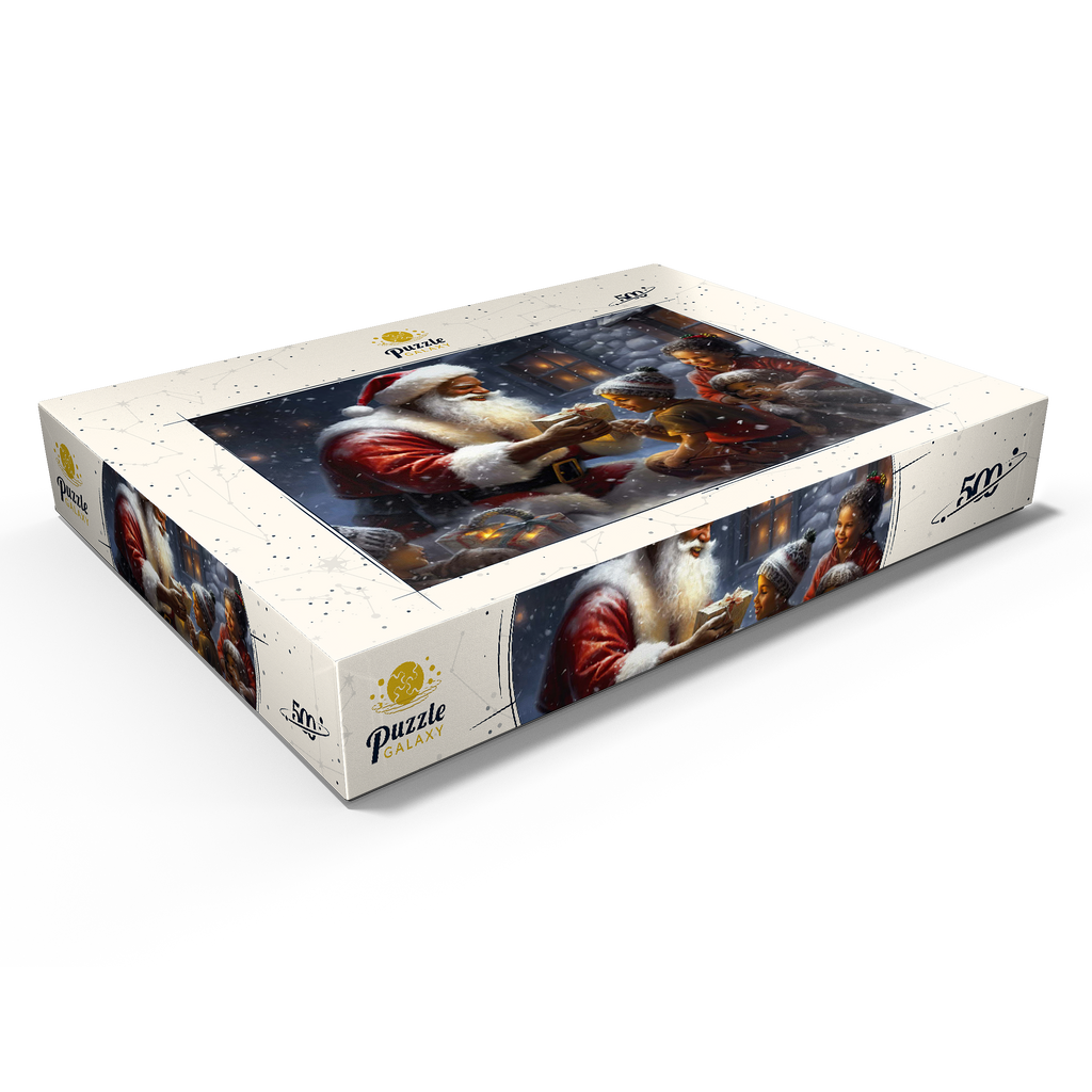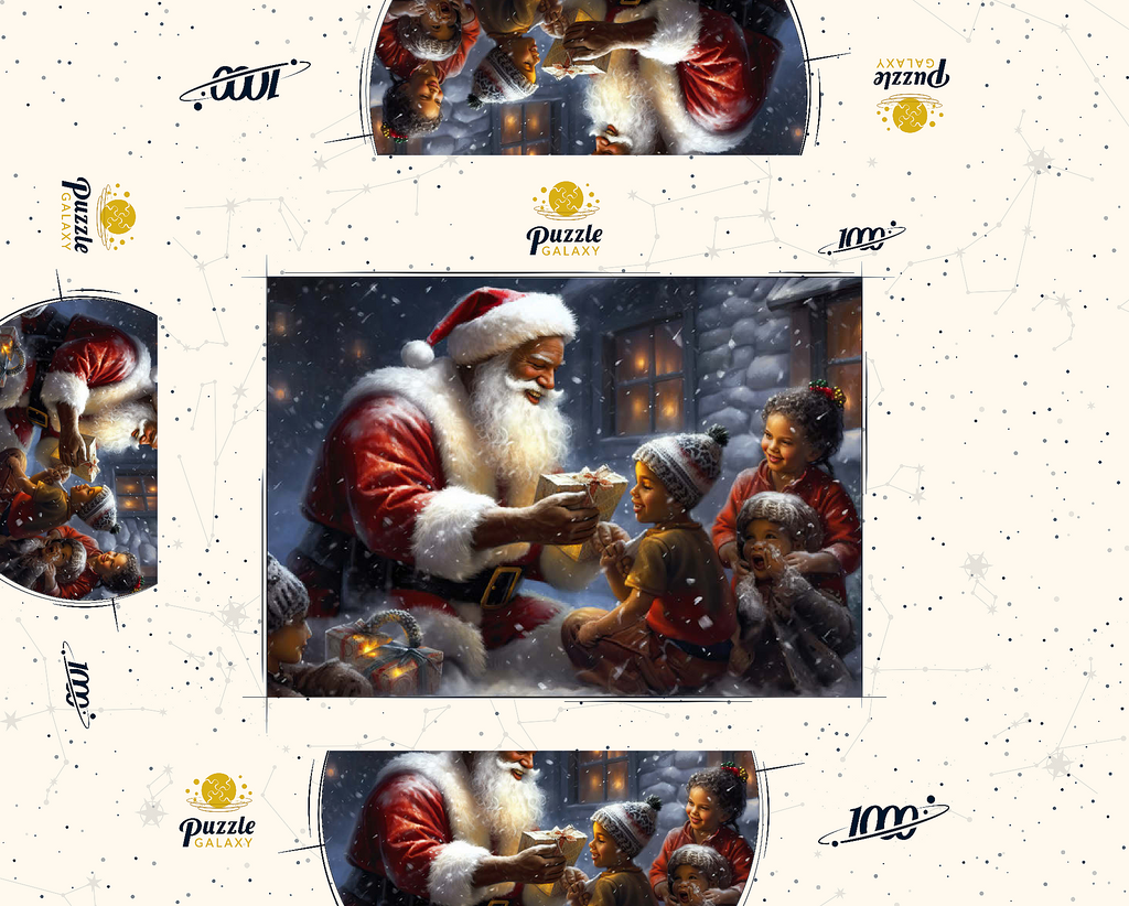 Eine herzerwärmende Weihnachtsszene mit dem Weihnachtsmann, der im Schnee kniet und einem aufgeregten Kind freudig ein eingepacktes Geschenk überreicht. Der gemütliche Schein eines schneebedeckten Hauses im Hintergrund verstärkt die festliche Atmosphäre. Die Kinder, warm gekleidet mit Mützen und Schals, sind voller Staunen und Freude und verkörpern den Zauber von Weihnachten. Der sanft fallende Schnee und die warme Beleuchtung tragen zu der bezaubernden und freudigen Stimmung der Weihnachtszeit bei.