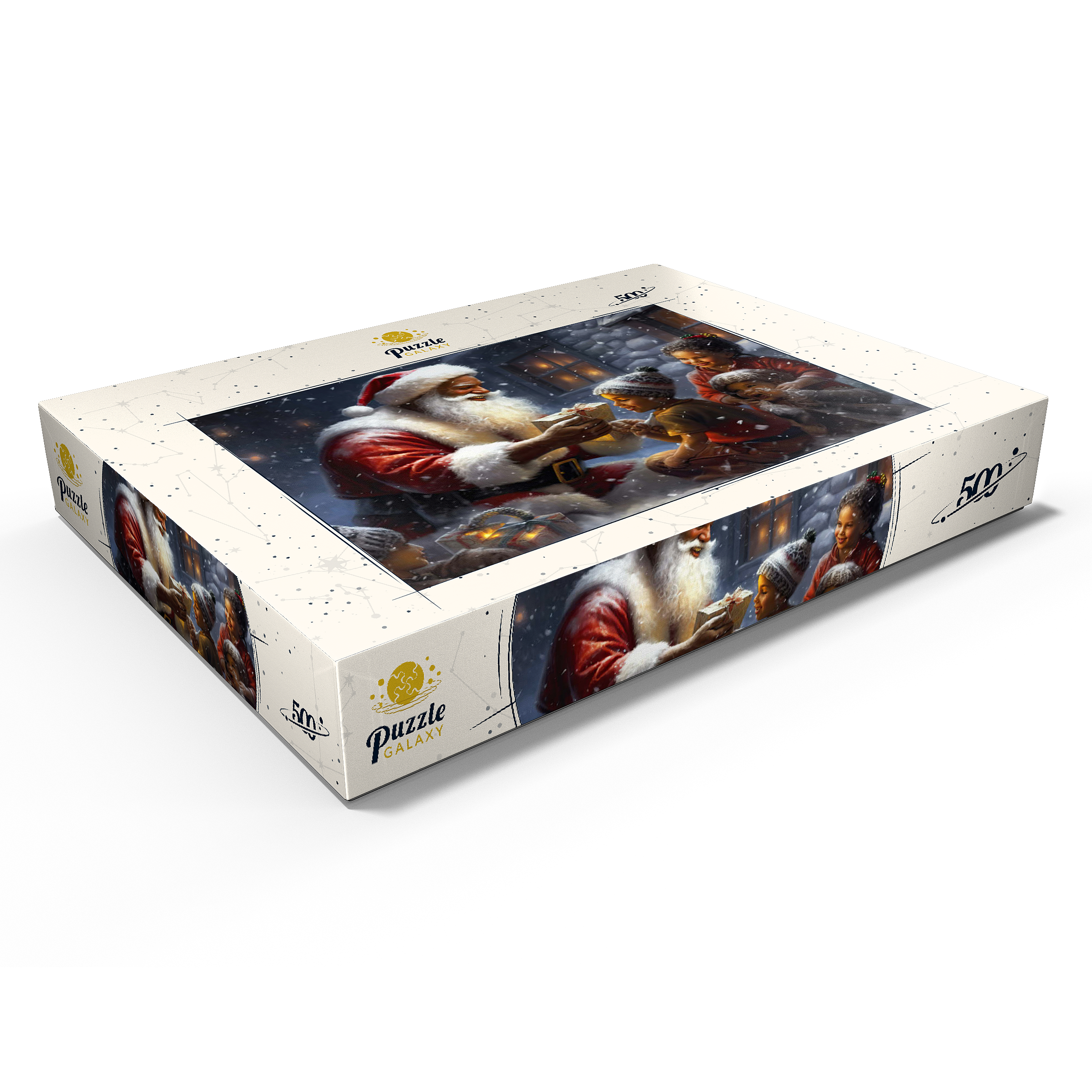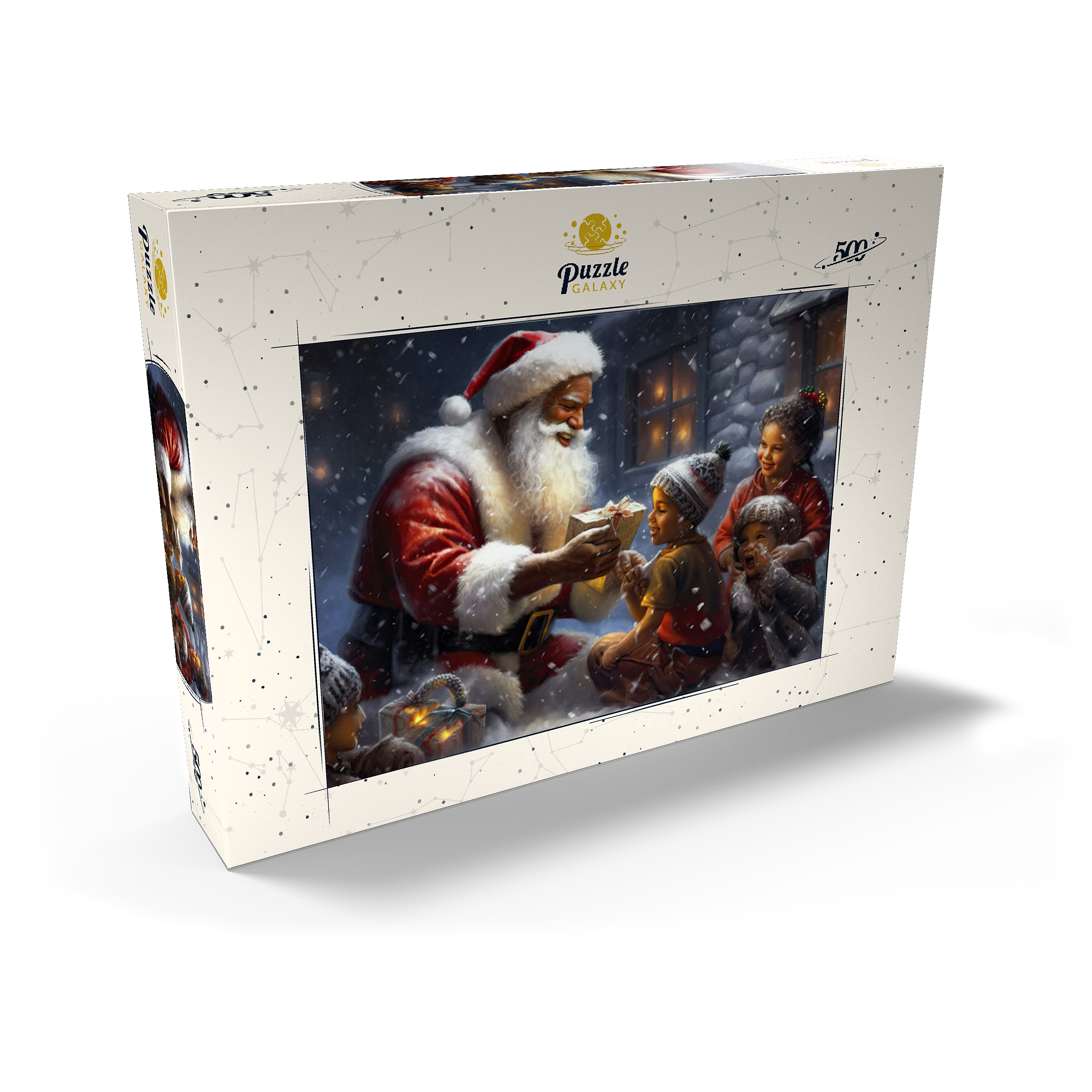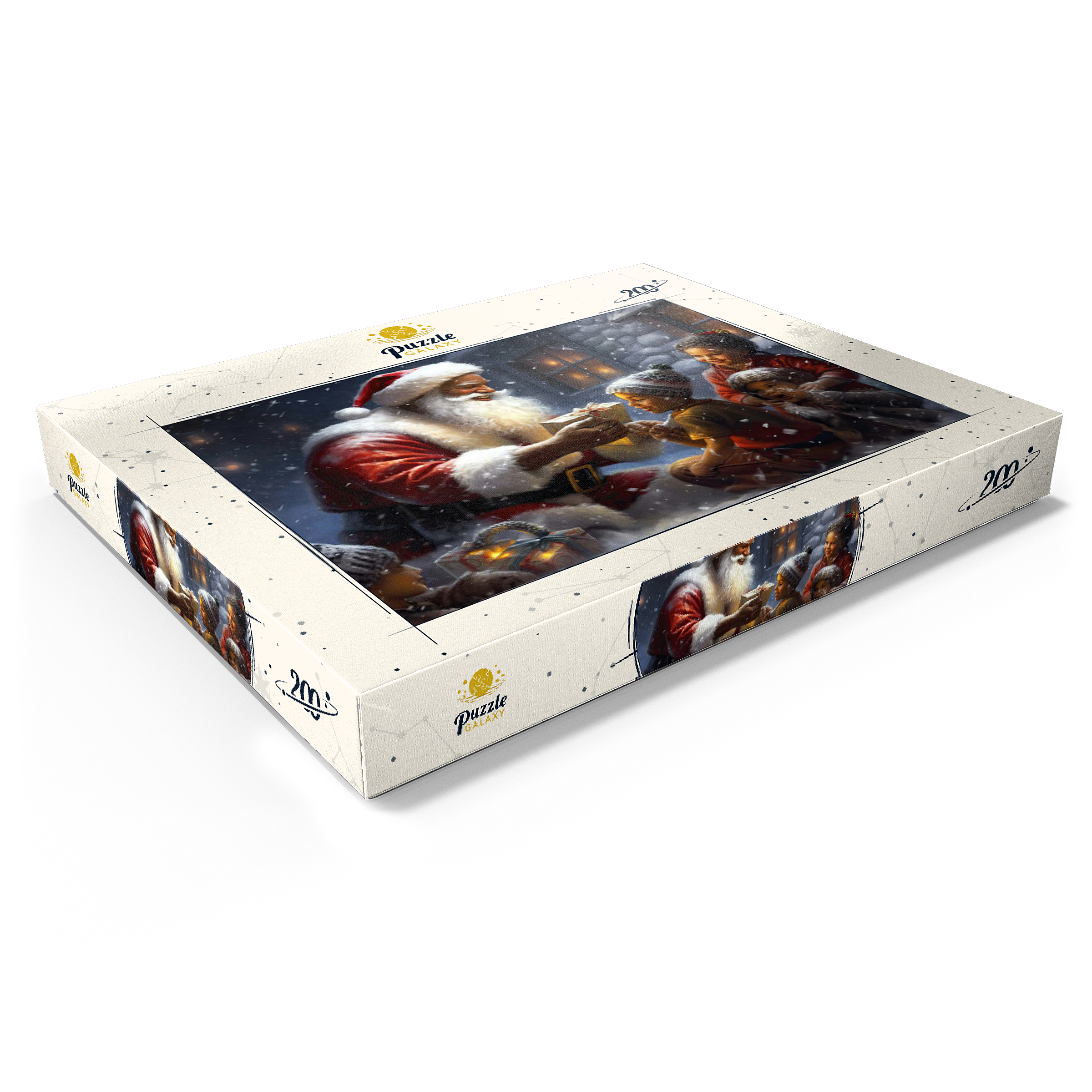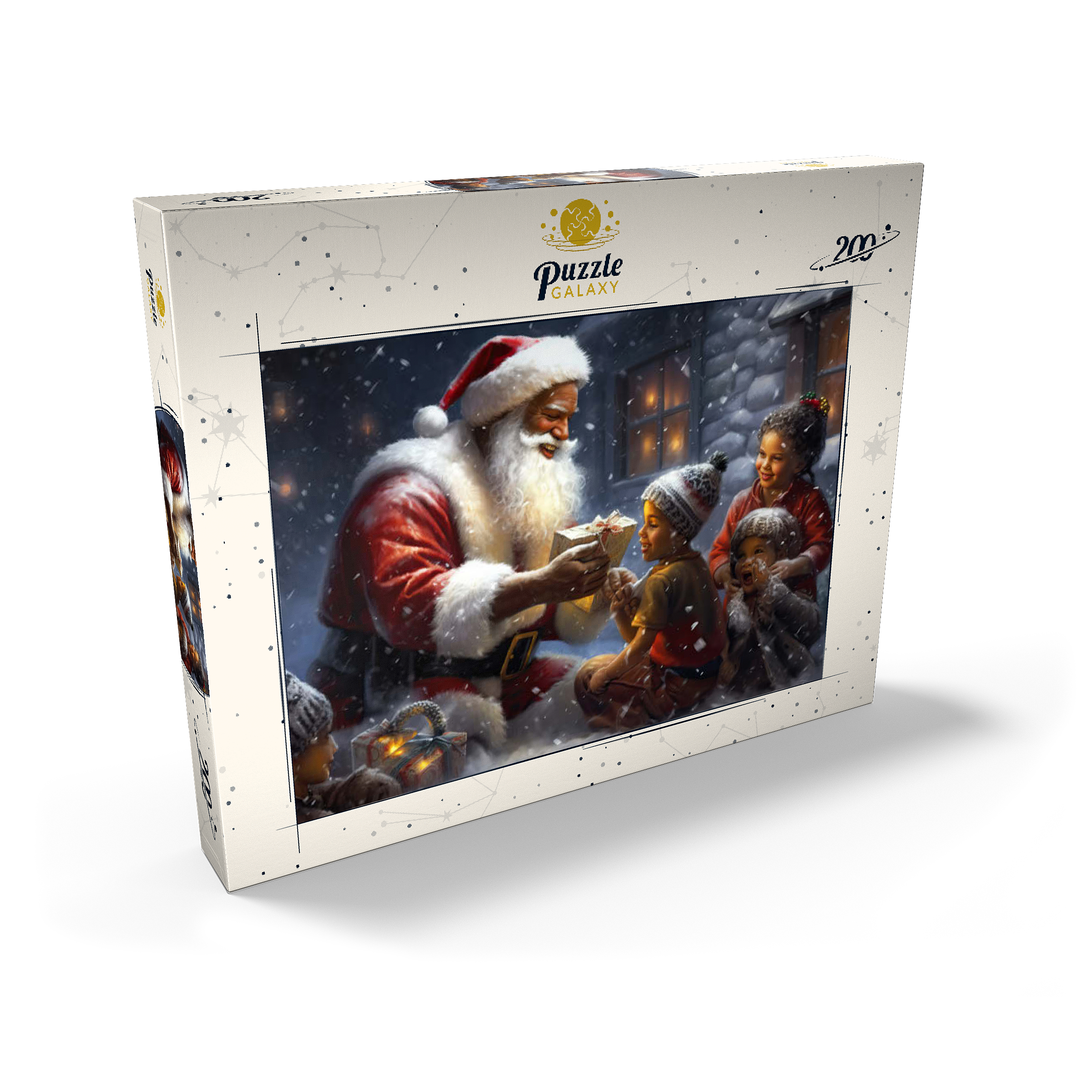 Eine herzerwärmende Weihnachtsszene mit dem Weihnachtsmann, der im Schnee kniet und einem aufgeregten Kind freudig ein eingepacktes Geschenk überreicht. Der gemütliche Schein eines schneebedeckten Hauses im Hintergrund verstärkt die festliche Atmosphäre. Die Kinder, warm gekleidet mit Mützen und Schals, sind voller Staunen und Freude und verkörpern den Zauber von Weihnachten. Der sanft fallende Schnee und die warme Beleuchtung tragen zu der bezaubernden und freudigen Stimmung der Weihnachtszeit bei.