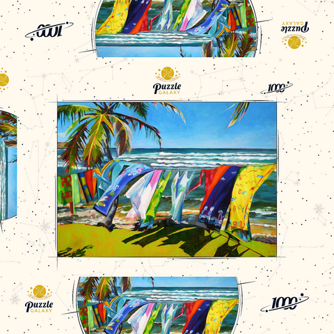 Dieses lebhafte Gemälde zeigt farbenfrohe Stoffe, die sich in der tropischen Brise wiegen, vor einem ruhigen Hintergrund aus Meer und sich wiegenden Palmen. Die leuchtenden Blau-, Grün-, Gelb- und Rottöne der Kleidungsstücke bilden einen starken Kontrast zu den ruhigen Wellen und dem Sandstrand. Die kräftigen Pinselstriche des Künstlers und die dynamische Komposition fangen die Essenz eines sorglosen, sonnenverwöhnten Tages am Meer ein und rufen Gefühle der Entspannung und Freude hervor. Dieses Werk zelebriert den tropischen Charme und entführt den Betrachter in ein lebhaftes Küstenparadies.