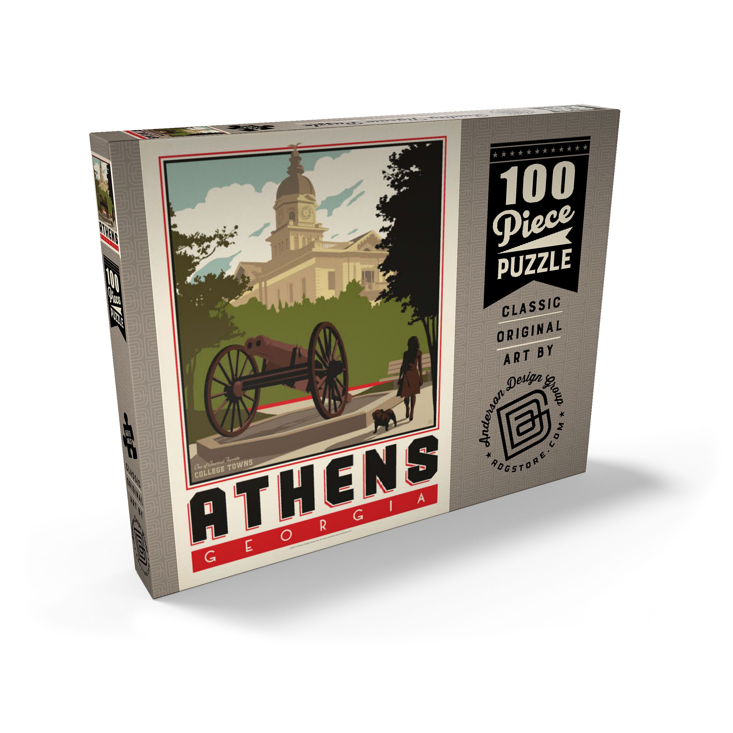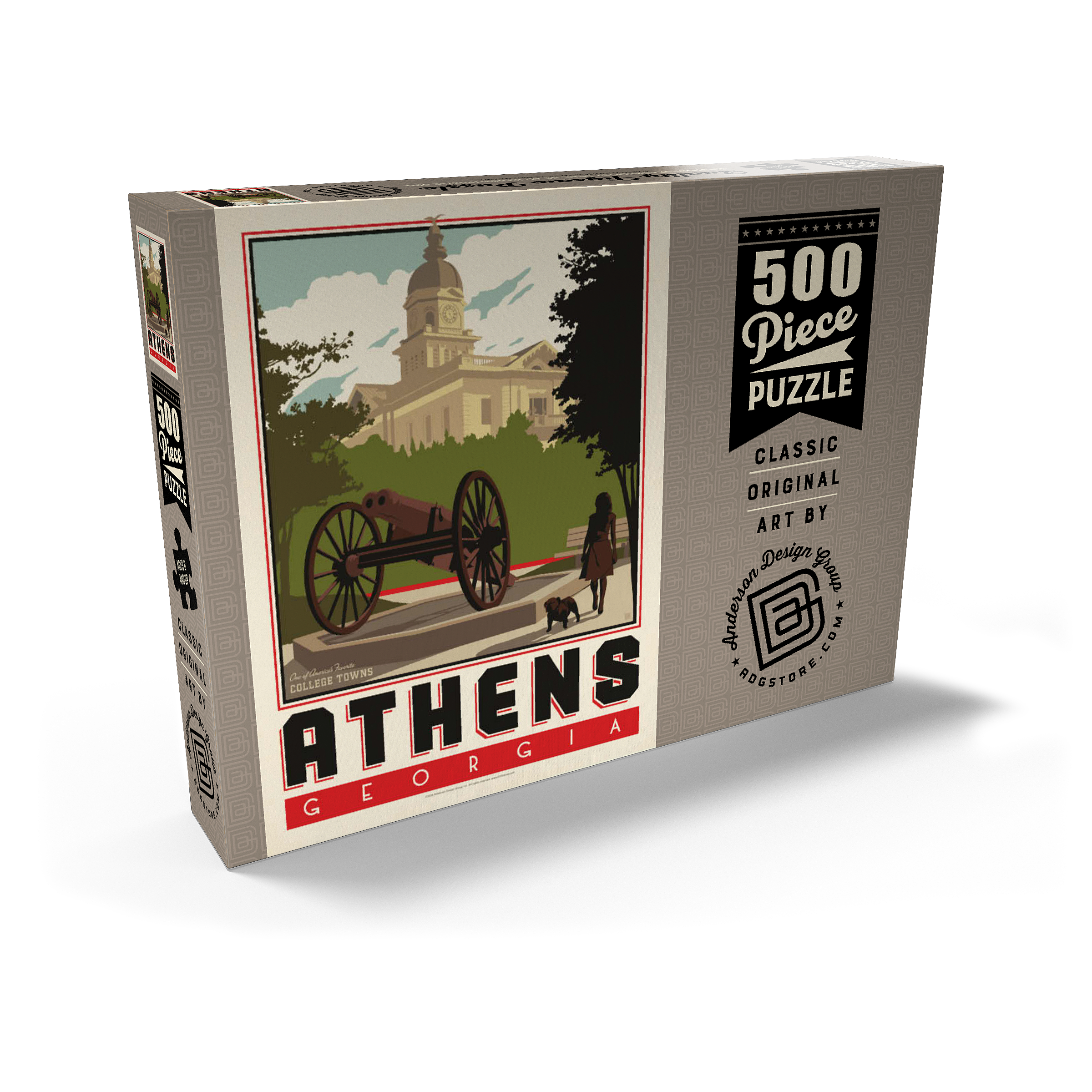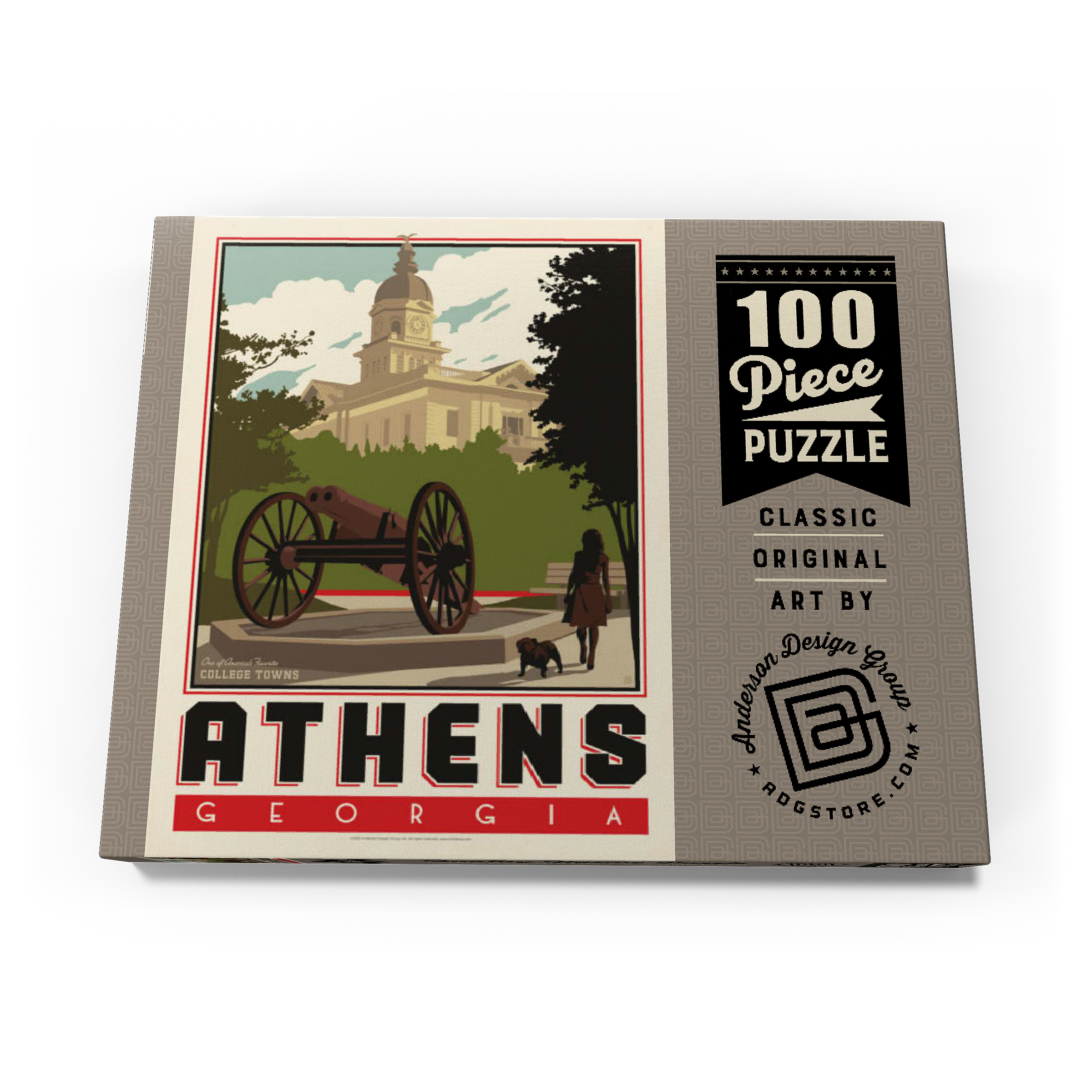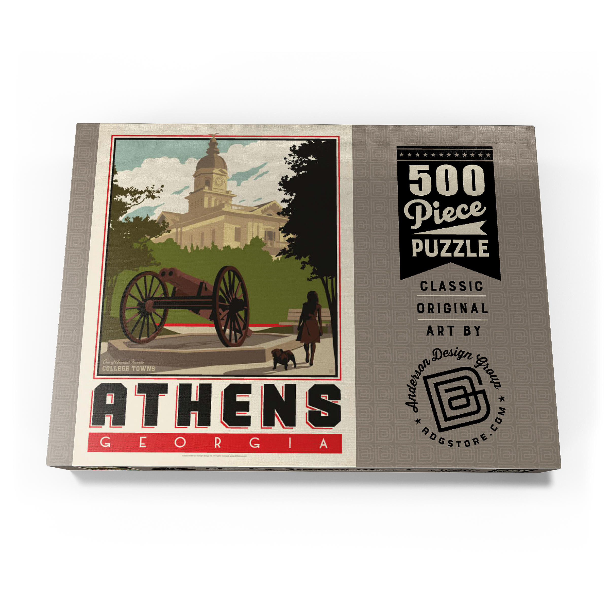 Athens, Georgia, eine der beliebtesten Universitätsstädte Amerikas, wird in diesem Design mit dem historischen Gerichtsgebäude in der Innenstadt und seinem ikonischen Uhrenturm wunderschön eingefangen. Im Vordergrund steht eine Kanone aus der Zeit des Bürgerkriegs, die die tiefen historischen Wurzeln der Stadt symbolisiert, während ein Passant mit einem Hund einen Hauch von Alltagscharme hinzufügt. Athens, bekannt als Heimat der University of Georgia, verbindet reiche Geschichte, südliche Architektur und lebendige Kultur. Die Kuppel des Gerichtsgebäudes, die sich über die Baumwipfel erhebt, spiegelt den beständigen Charakter der Stadt wider und macht diese Szene zu einer idealen Hommage an den Geist Athens und seinen Platz im Erbe Georgias.