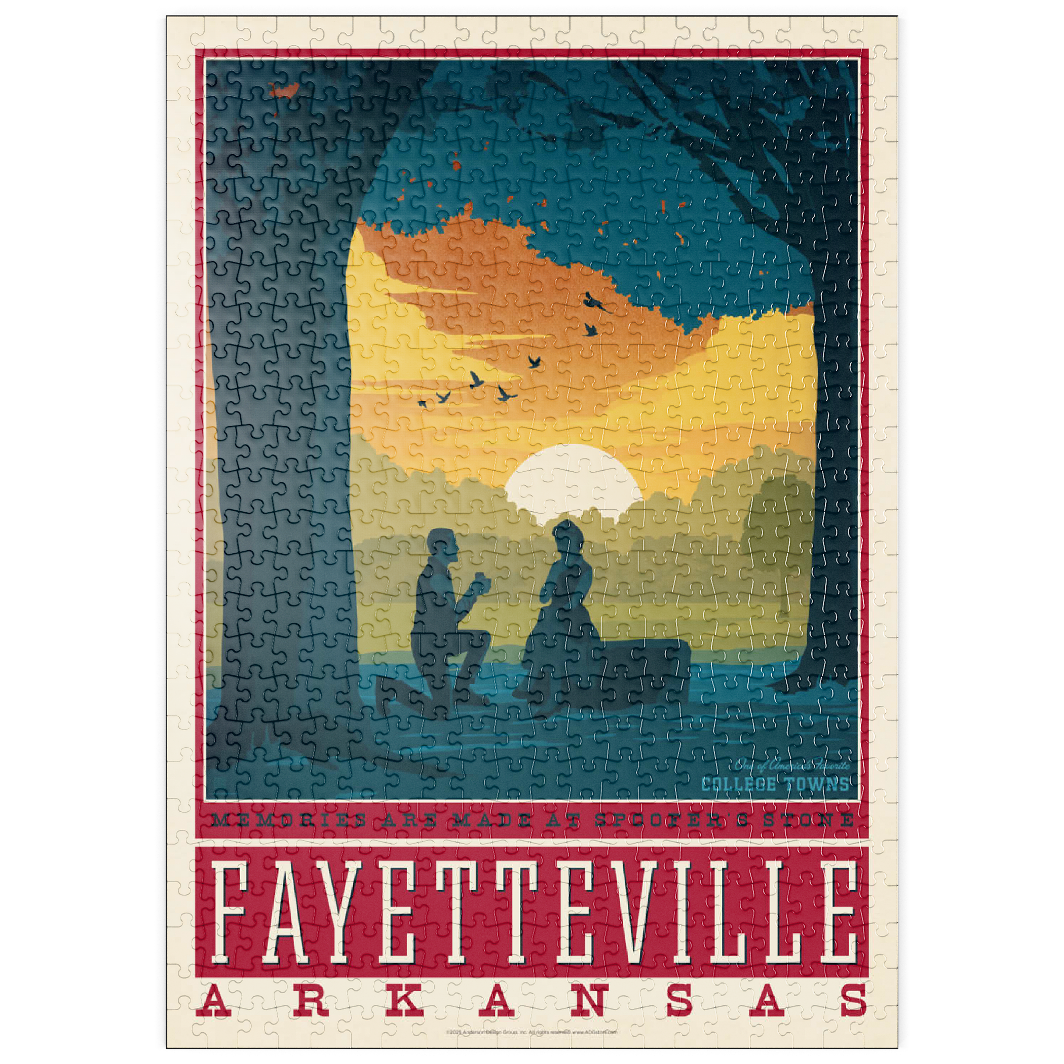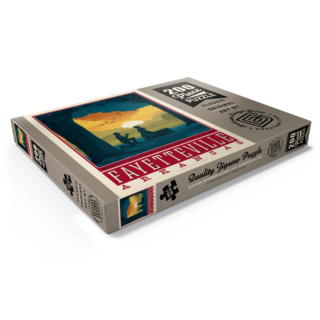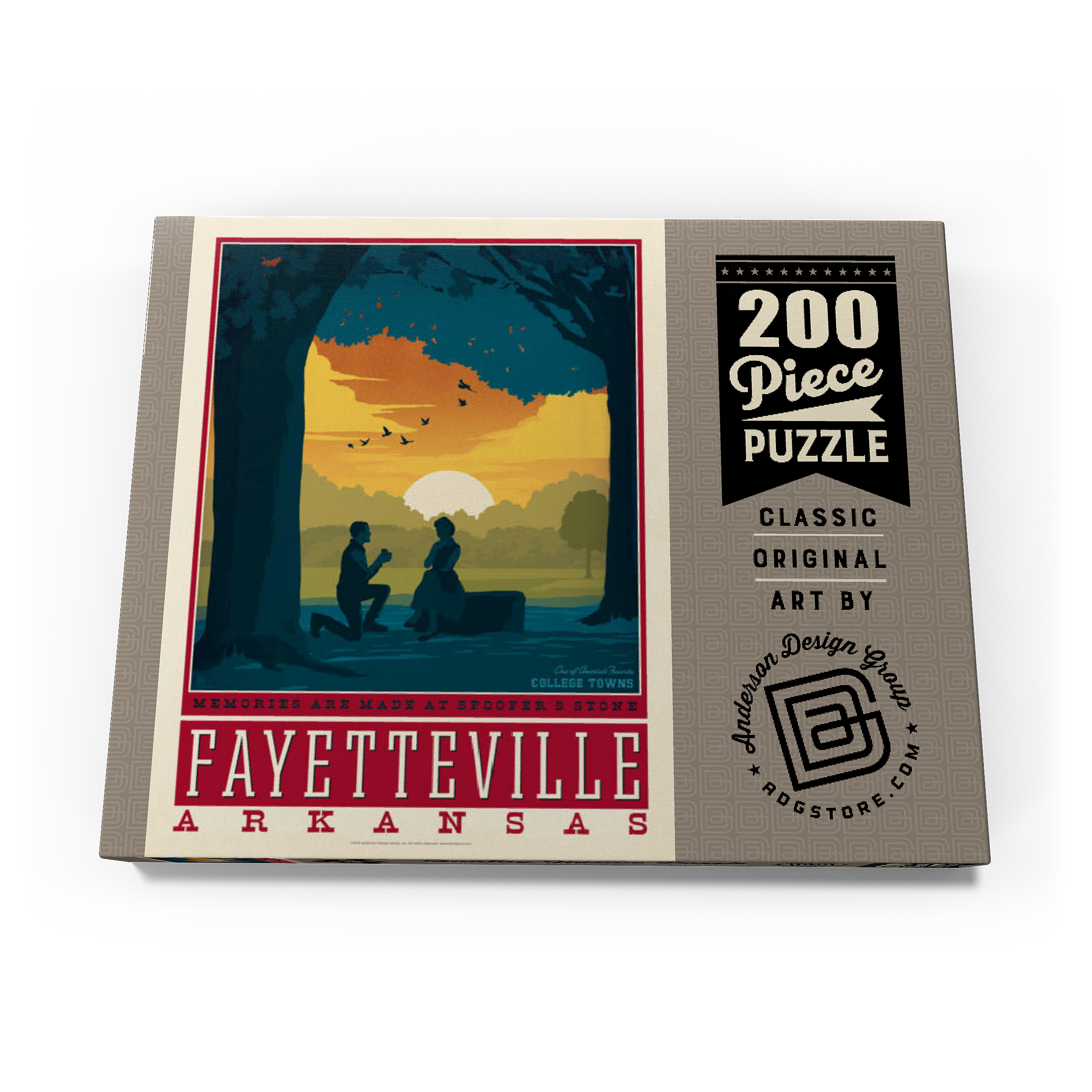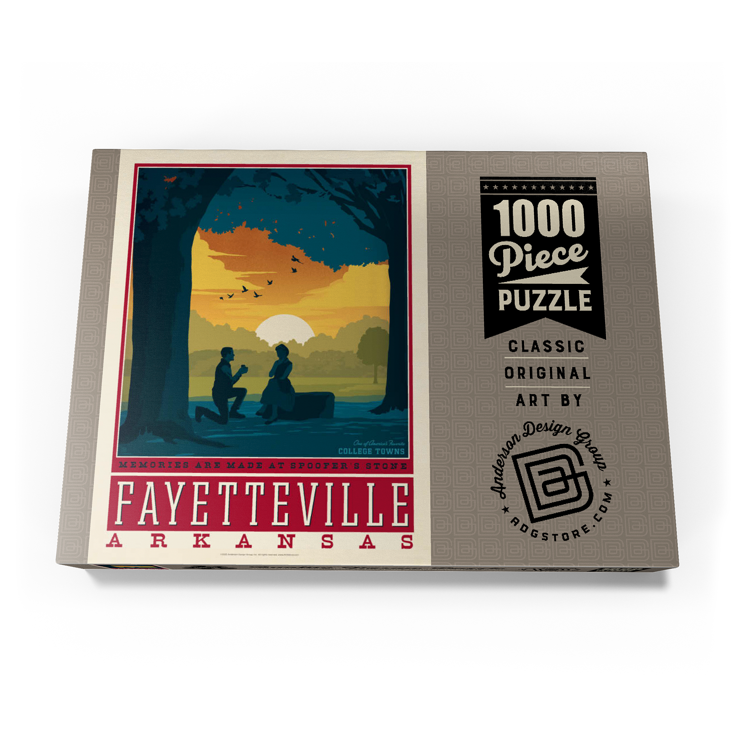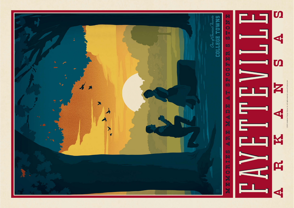 Fayetteville, Arkansas, Heimat der University of Arkansas, wird in diesem Kunstwerk mit dem ikonischen Spoofer's Stone wunderschön illustriert. Unter einem Blätterdach zeigt die Szene einen romantischen Moment bei Sonnenuntergang, während warmes goldenes Licht den Himmel überzieht. Der Spoofer's Stone, ein beliebtes Wahrzeichen, das mit der lokalen Tradition verbunden ist, wird seit langem mit dem Studentenleben, Heiratsanträgen und wertvollen Erinnerungen in Verbindung gebracht. Fayetteville, bekannt als eine der beliebtesten Universitätsstädte Amerikas, verbindet natürliche Schönheit, die Landschaft der Ozark Mountains und einen lebendigen akademischen Geist. Dieses Design unterstreicht sowohl den historischen Charme als auch die persönlichen Verbindungen, die die Stadt auszeichnen.