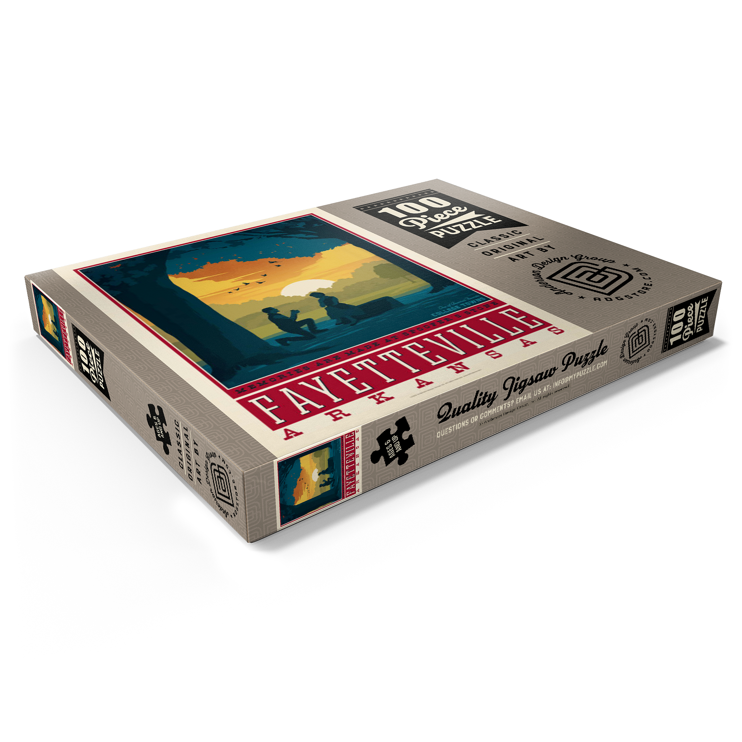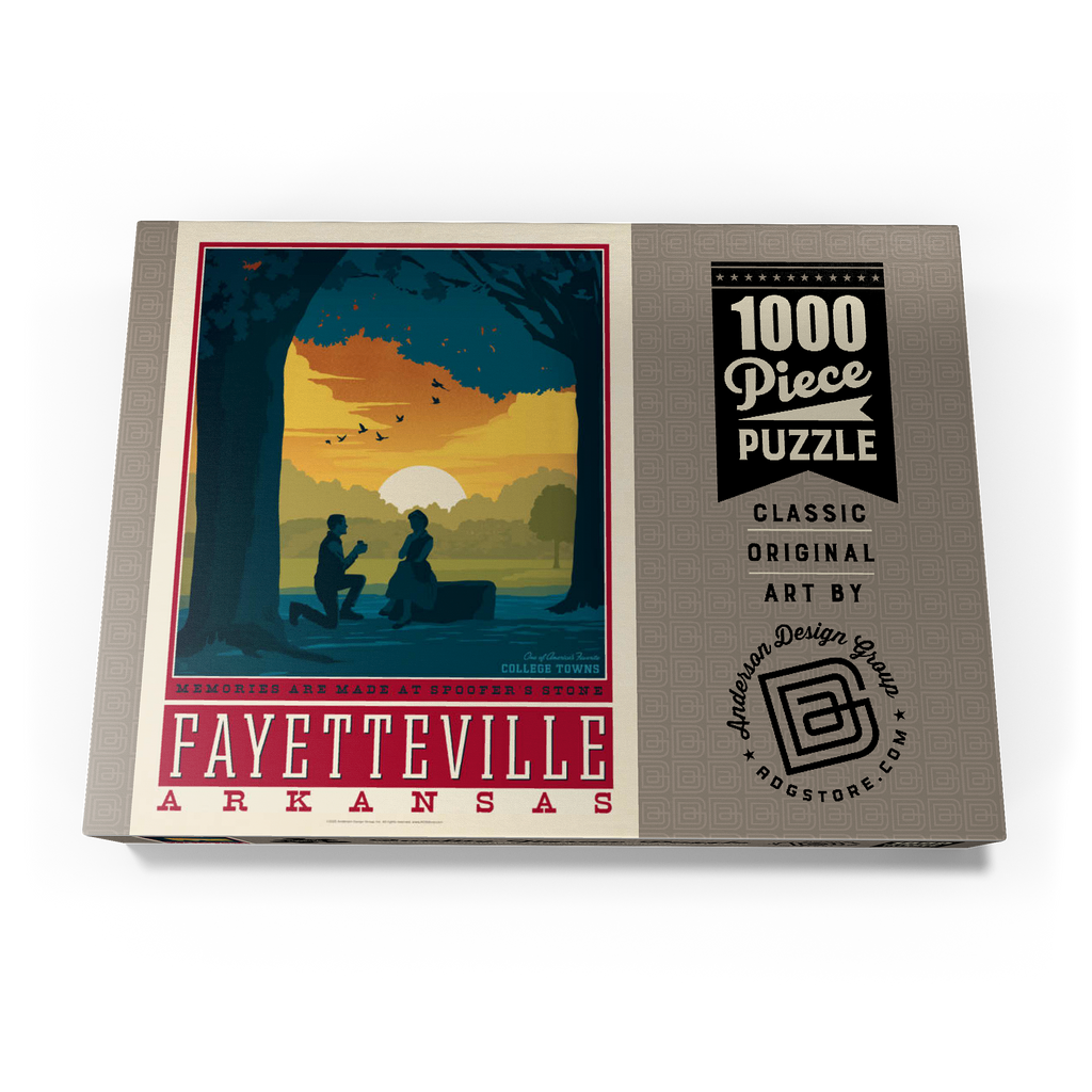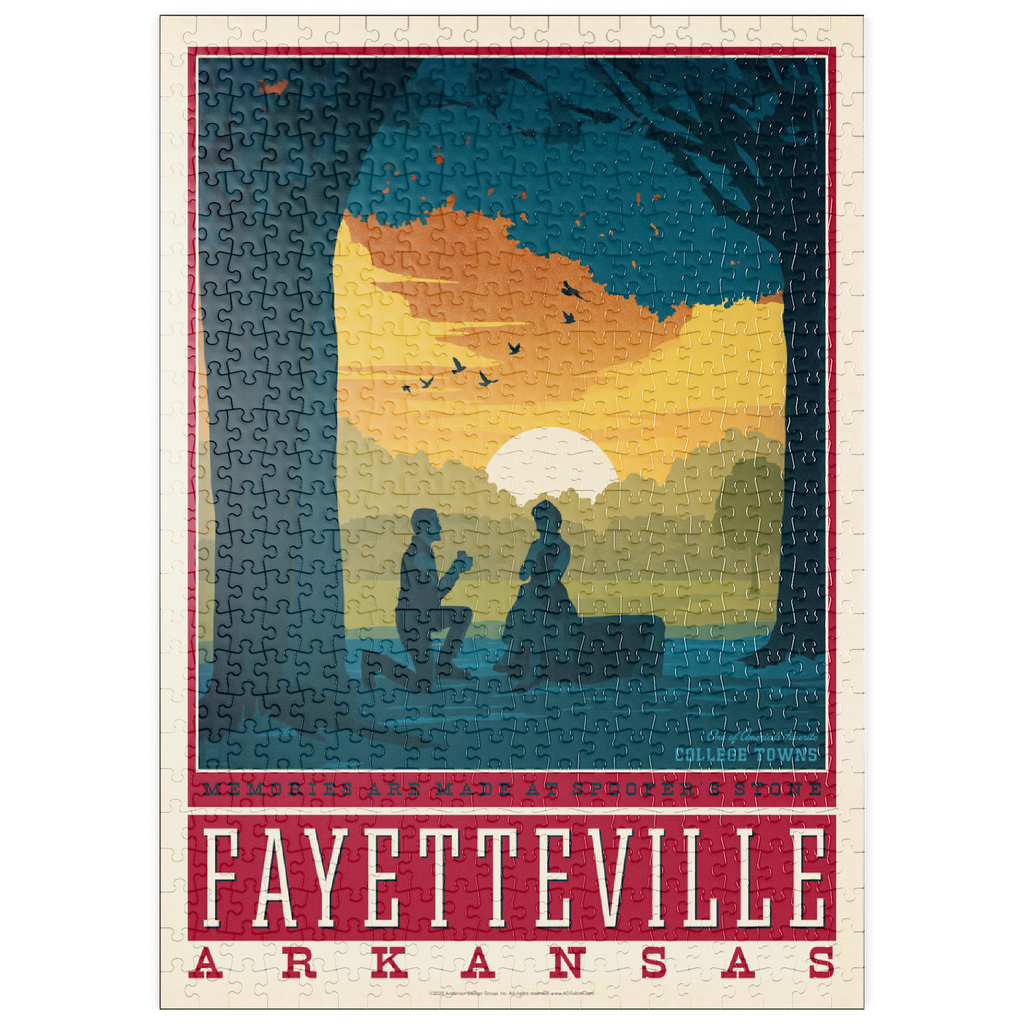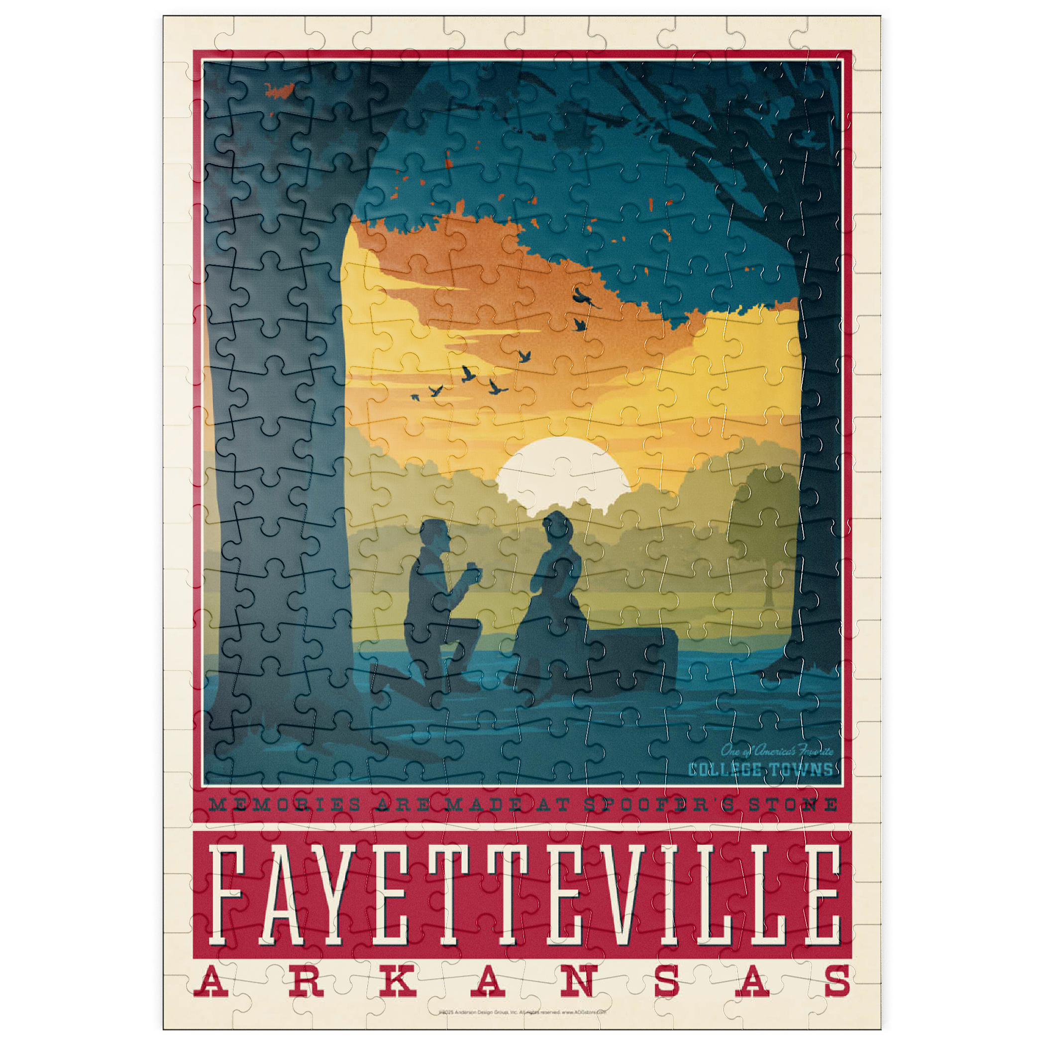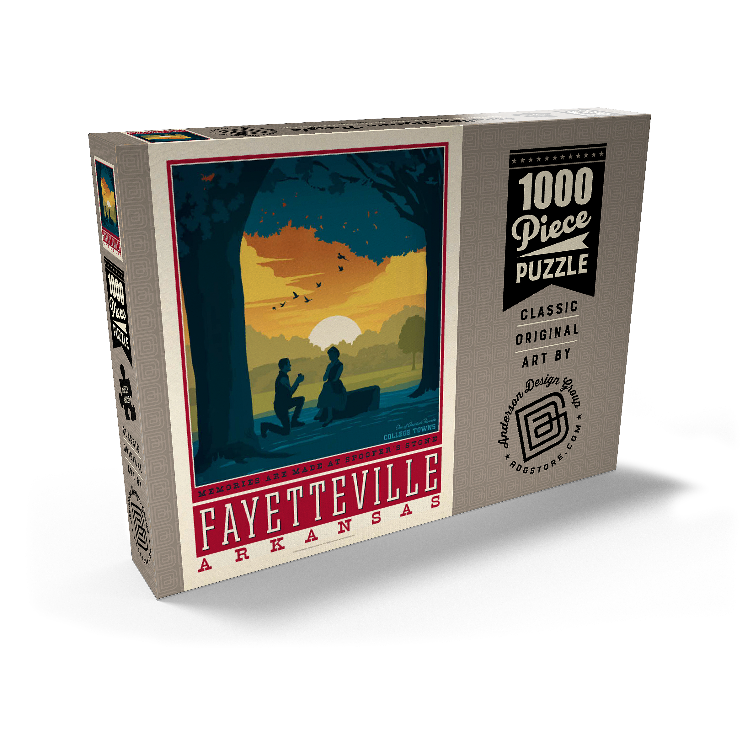 Fayetteville, Arkansas, Heimat der University of Arkansas, wird in diesem Kunstwerk mit dem ikonischen Spoofer's Stone wunderschön illustriert. Unter einem Blätterdach zeigt die Szene einen romantischen Moment bei Sonnenuntergang, während warmes goldenes Licht den Himmel überzieht. Der Spoofer's Stone, ein beliebtes Wahrzeichen, das mit der lokalen Tradition verbunden ist, wird seit langem mit dem Studentenleben, Heiratsanträgen und wertvollen Erinnerungen in Verbindung gebracht. Fayetteville, bekannt als eine der beliebtesten Universitätsstädte Amerikas, verbindet natürliche Schönheit, die Landschaft der Ozark Mountains und einen lebendigen akademischen Geist. Dieses Design unterstreicht sowohl den historischen Charme als auch die persönlichen Verbindungen, die die Stadt auszeichnen.