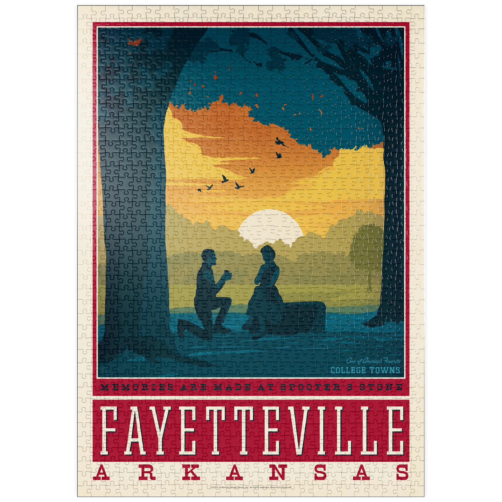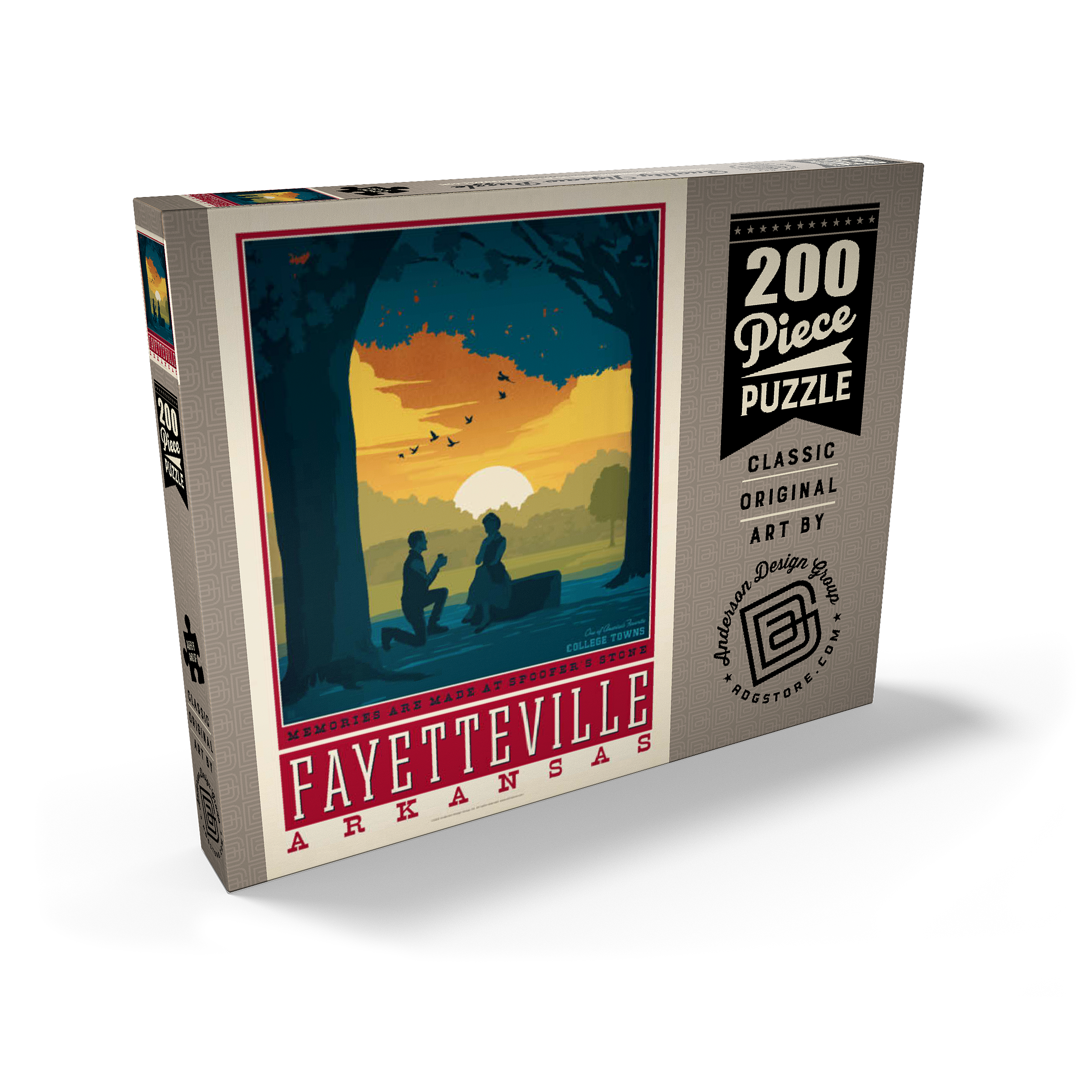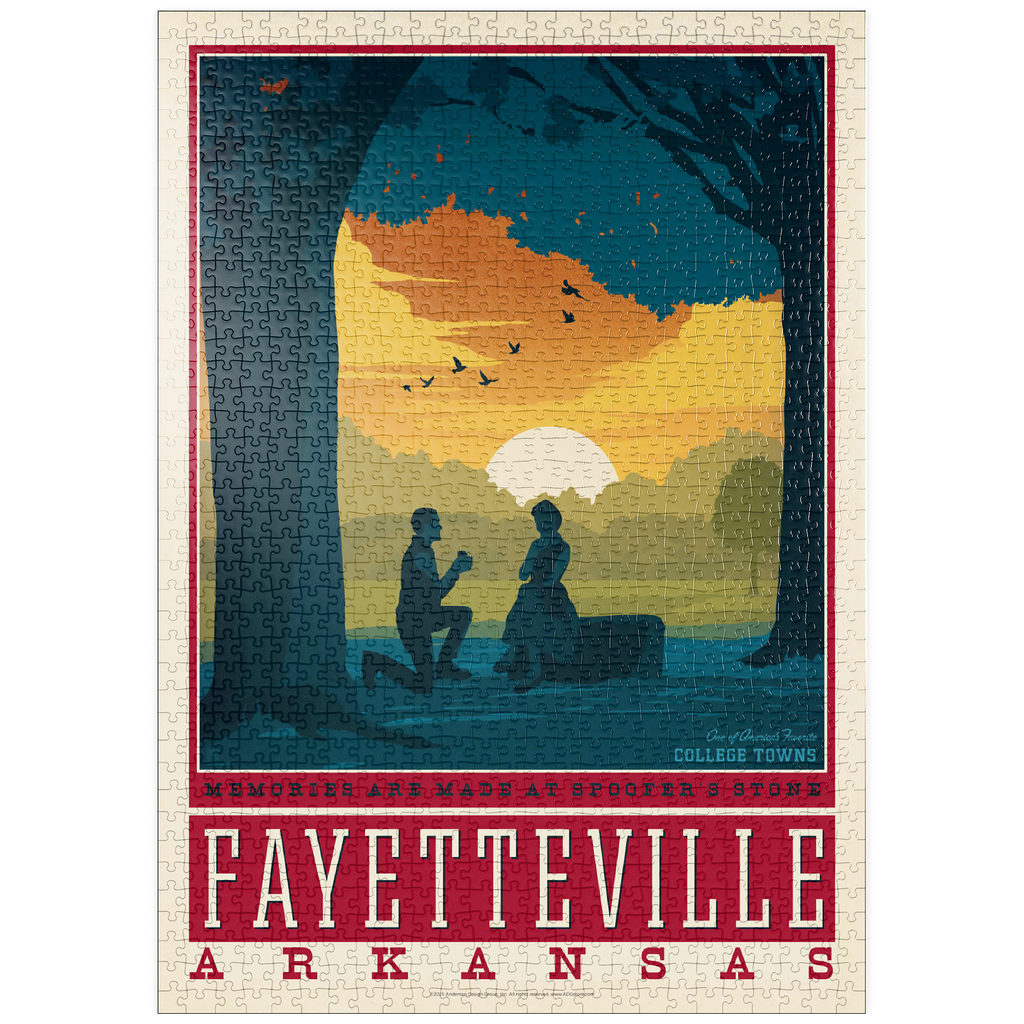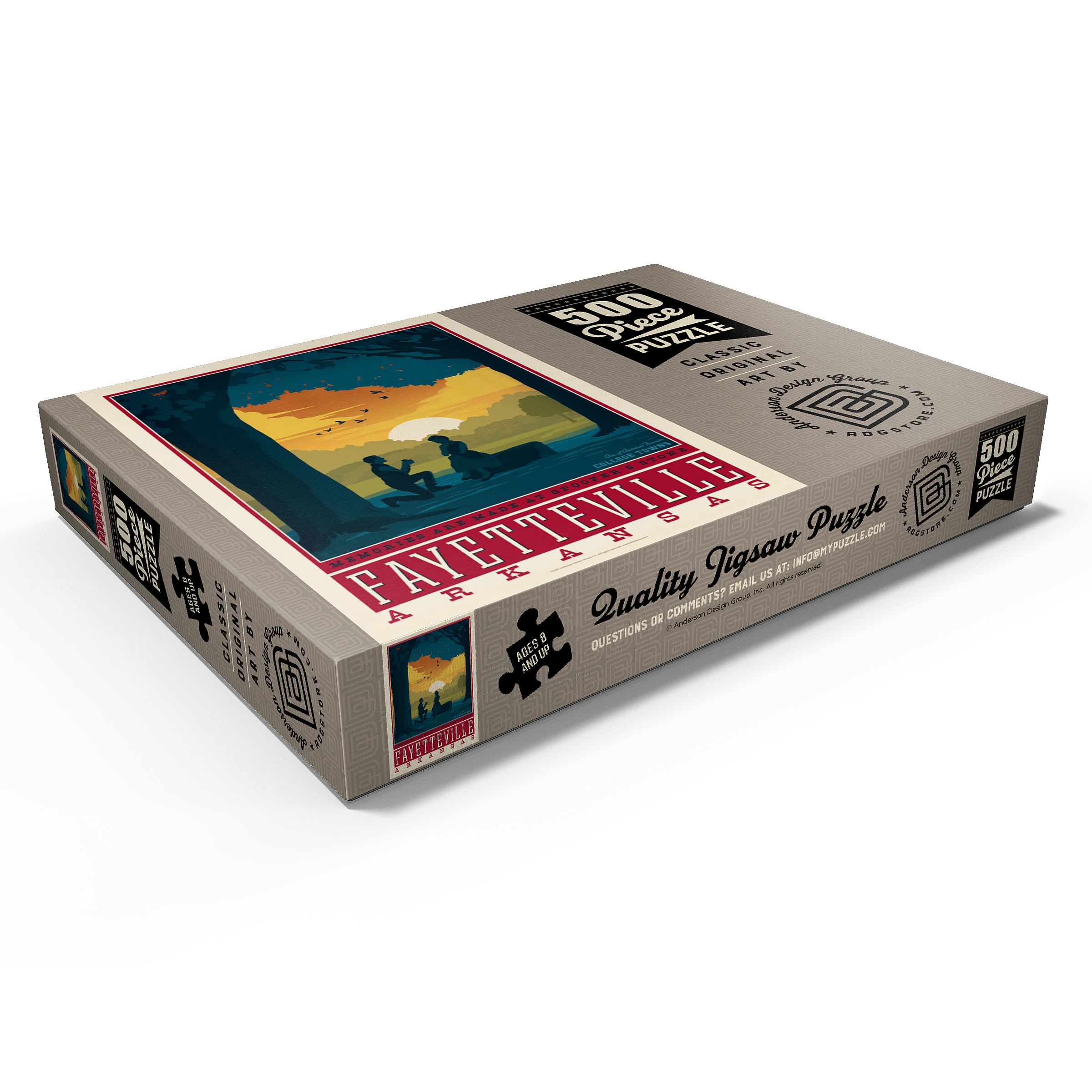 Fayetteville, Arkansas, Heimat der University of Arkansas, wird in diesem Kunstwerk mit dem ikonischen Spoofer's Stone wunderschön illustriert. Unter einem Blätterdach zeigt die Szene einen romantischen Moment bei Sonnenuntergang, während warmes goldenes Licht den Himmel überzieht. Der Spoofer's Stone, ein beliebtes Wahrzeichen, das mit der lokalen Tradition verbunden ist, wird seit langem mit dem Studentenleben, Heiratsanträgen und wertvollen Erinnerungen in Verbindung gebracht. Fayetteville, bekannt als eine der beliebtesten Universitätsstädte Amerikas, verbindet natürliche Schönheit, die Landschaft der Ozark Mountains und einen lebendigen akademischen Geist. Dieses Design unterstreicht sowohl den historischen Charme als auch die persönlichen Verbindungen, die die Stadt auszeichnen.