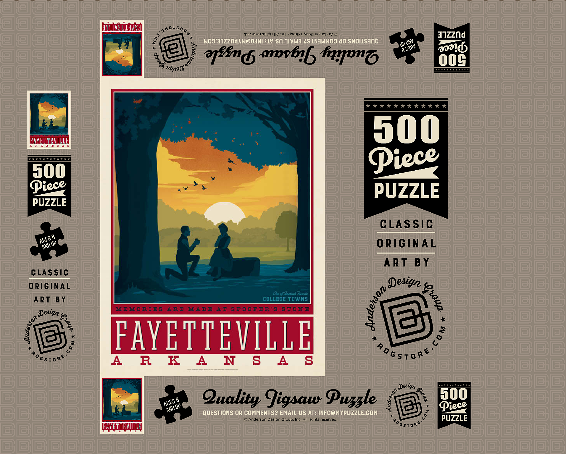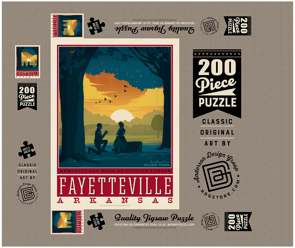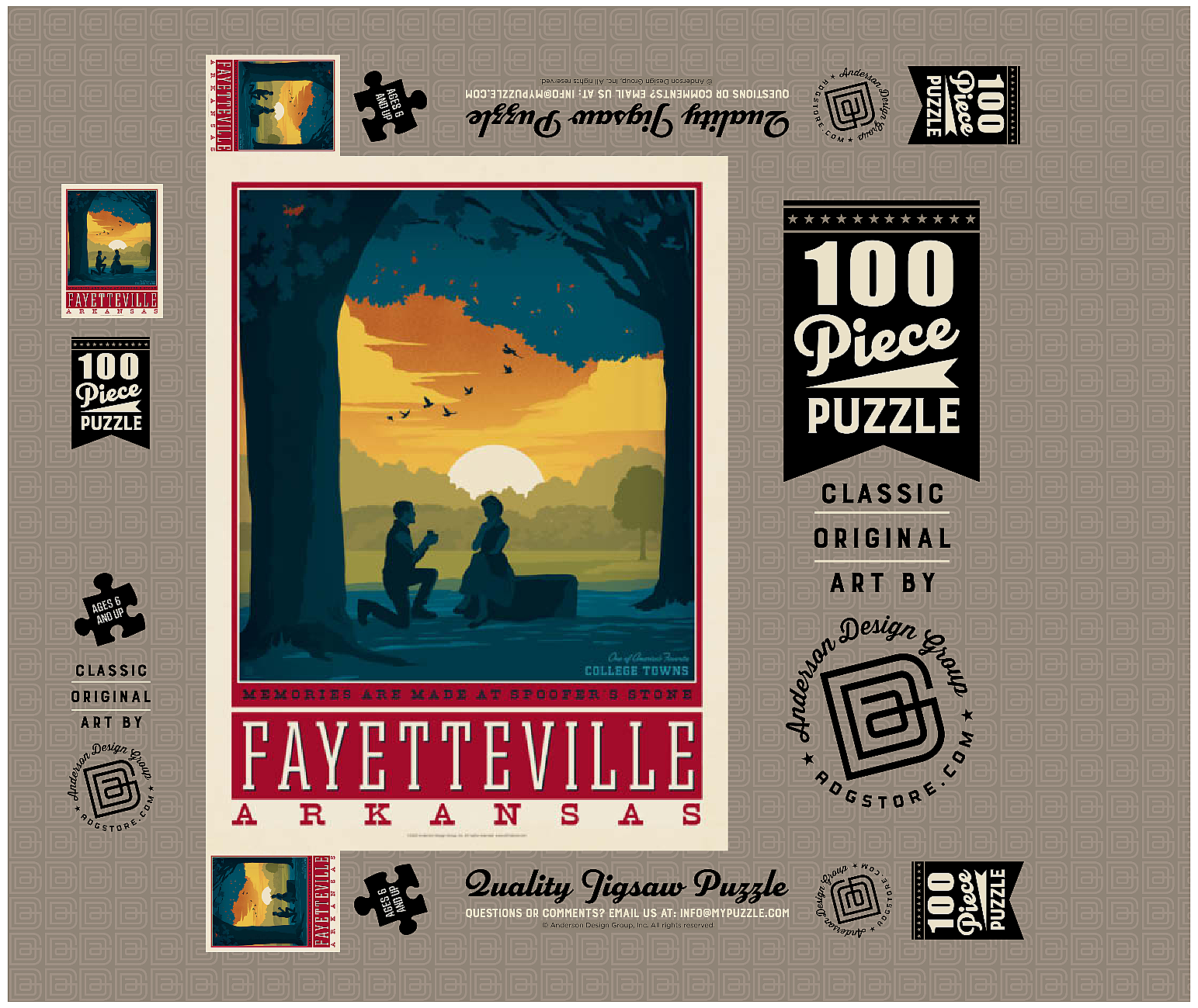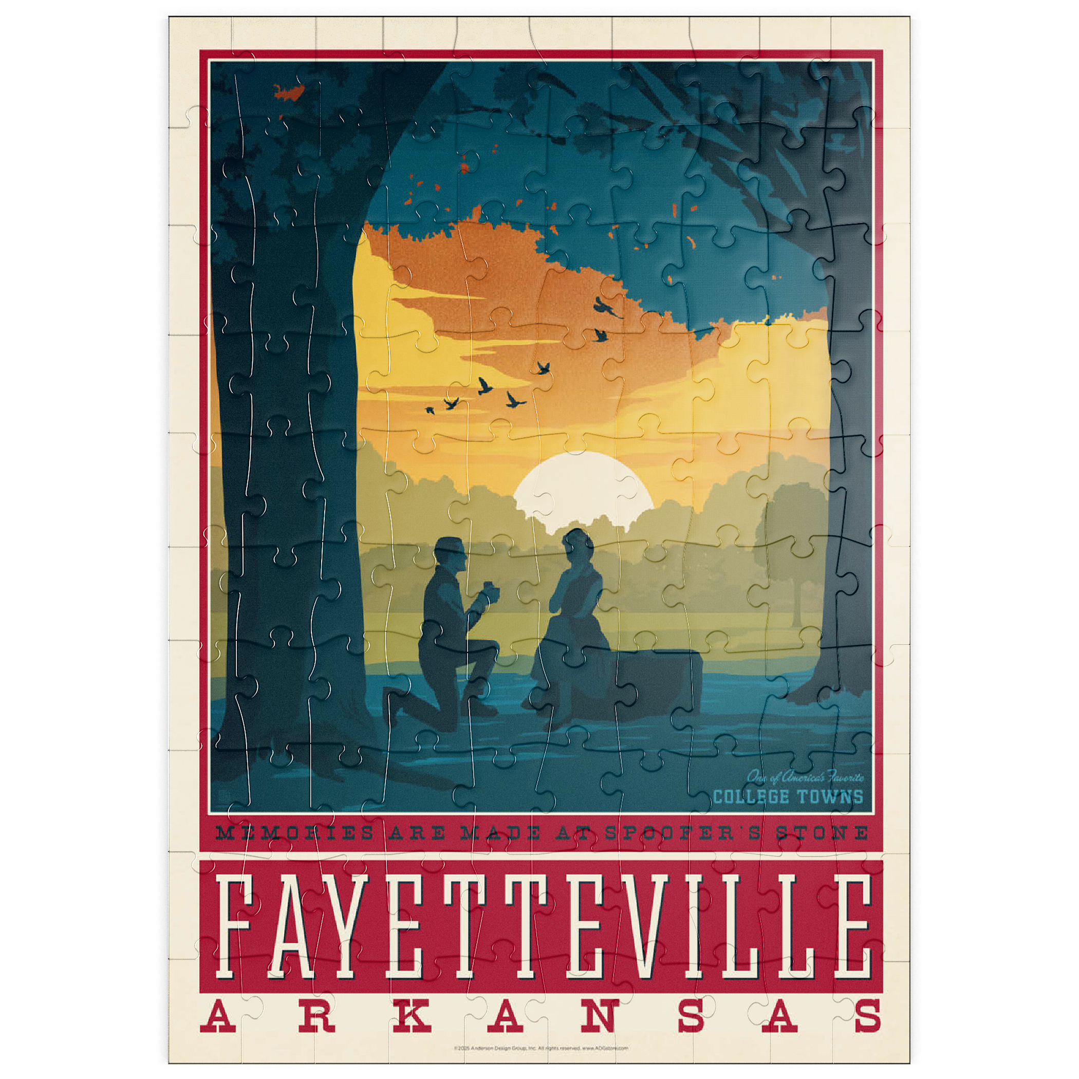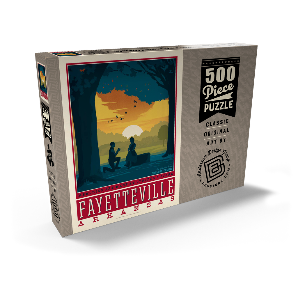 Fayetteville, Arkansas, Heimat der University of Arkansas, wird in diesem Kunstwerk mit dem ikonischen Spoofer's Stone wunderschön illustriert. Unter einem Blätterdach zeigt die Szene einen romantischen Moment bei Sonnenuntergang, während warmes goldenes Licht den Himmel überzieht. Der Spoofer's Stone, ein beliebtes Wahrzeichen, das mit der lokalen Tradition verbunden ist, wird seit langem mit dem Studentenleben, Heiratsanträgen und wertvollen Erinnerungen in Verbindung gebracht. Fayetteville, bekannt als eine der beliebtesten Universitätsstädte Amerikas, verbindet natürliche Schönheit, die Landschaft der Ozark Mountains und einen lebendigen akademischen Geist. Dieses Design unterstreicht sowohl den historischen Charme als auch die persönlichen Verbindungen, die die Stadt auszeichnen.