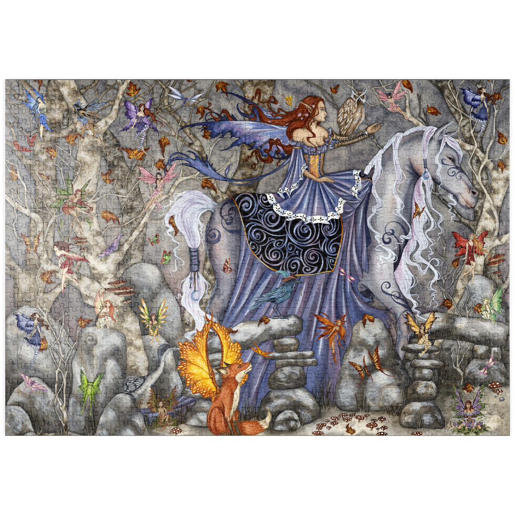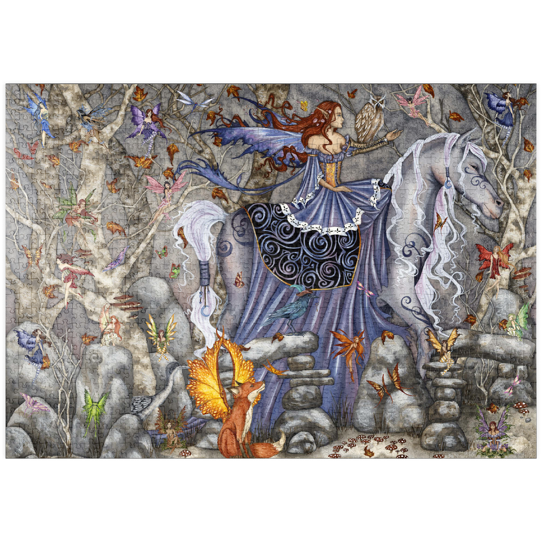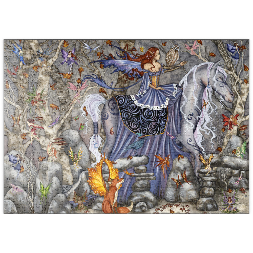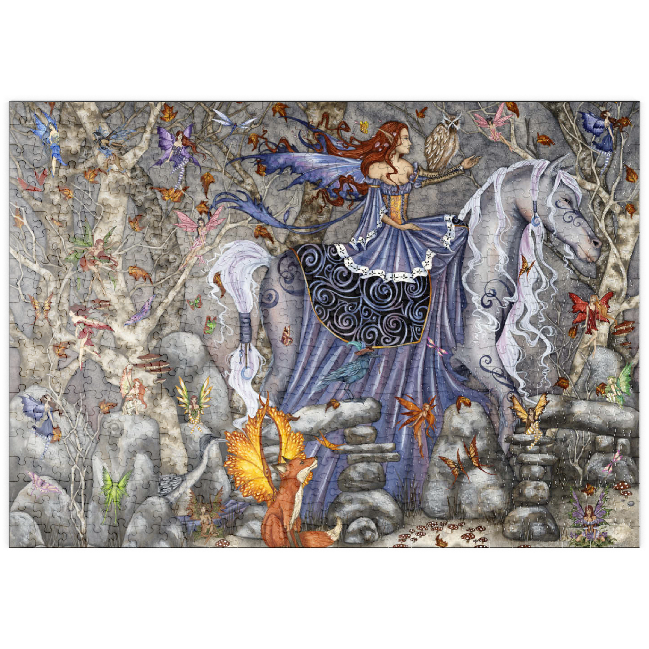 Im Zauberwald reitet eine königliche Fee auf ihrem silbernen Ross durch einen dämmerigen Hain, der voller flatternder Flügel, leuchtender Blätter und neugieriger Wesen ist. Umgeben von einer Schar lebhafter Waldgeister, schwingt die Szene vor der vielschichtigen Magie einer alten, wachsamen Welt.