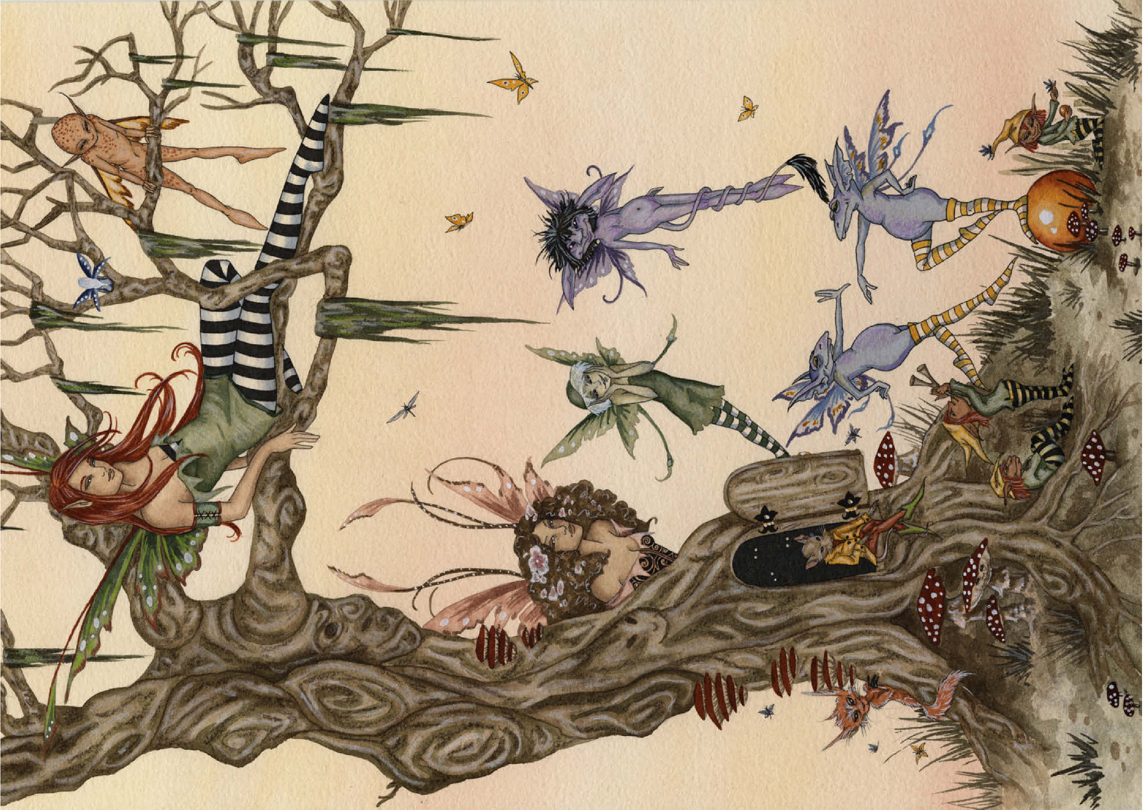 –Die Einweihungsparty der Haselmaus– sprüht vor verspielter Energie, wenn sich eine skurrile Mischung aus Feen und Waldtieren um einen knorrigen Baum versammelt, um zu feiern. Mit gestreiften Strümpfen, Pilzlaternen und Tänzen in der Luft wirkt die Szene wie ein fröhliches Geheimnis, das tief in einem verzauberten Wald verborgen ist.