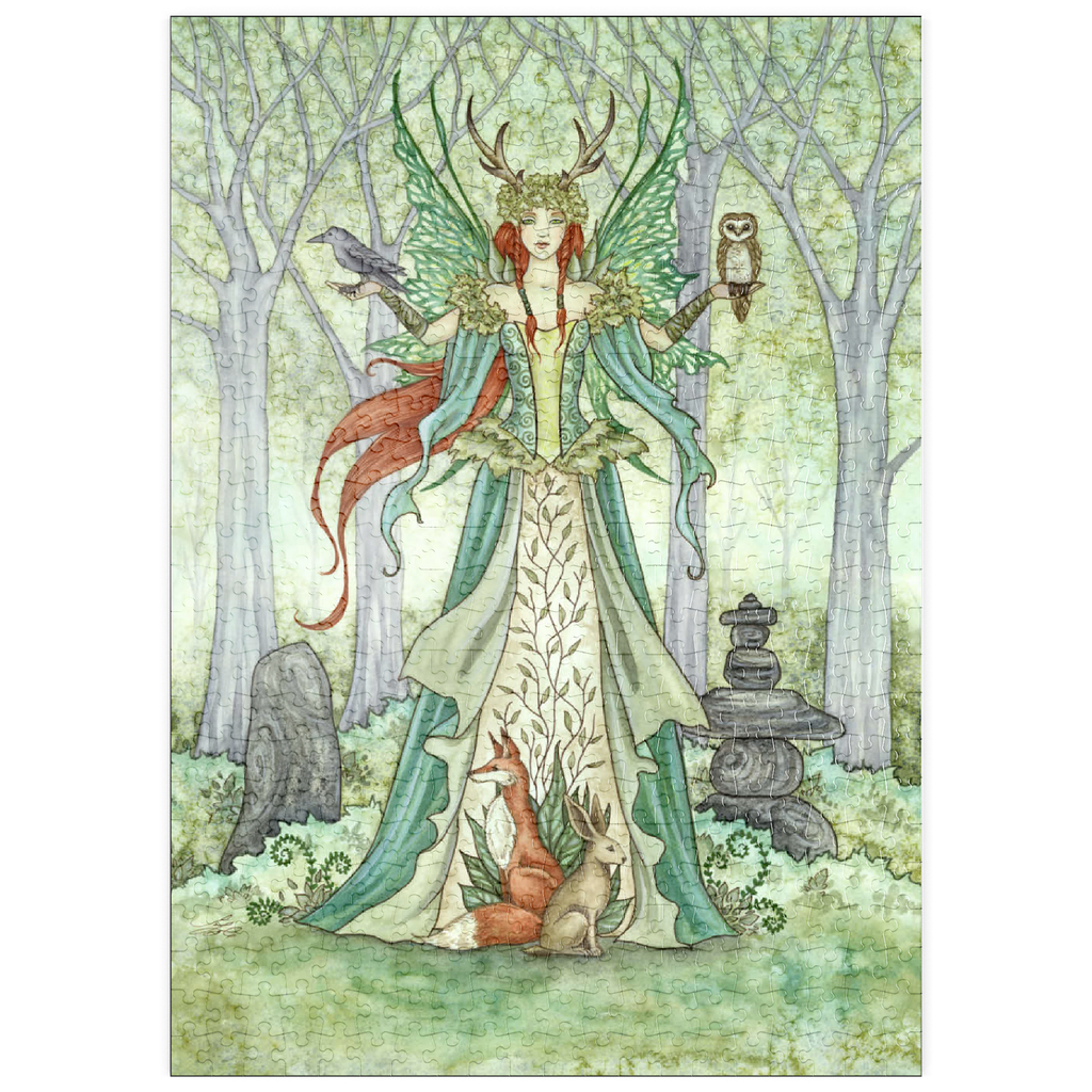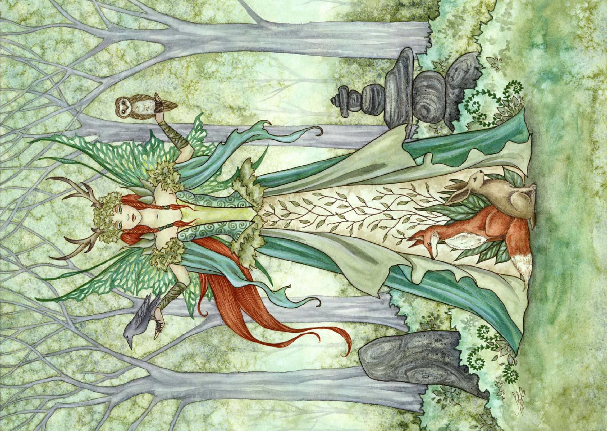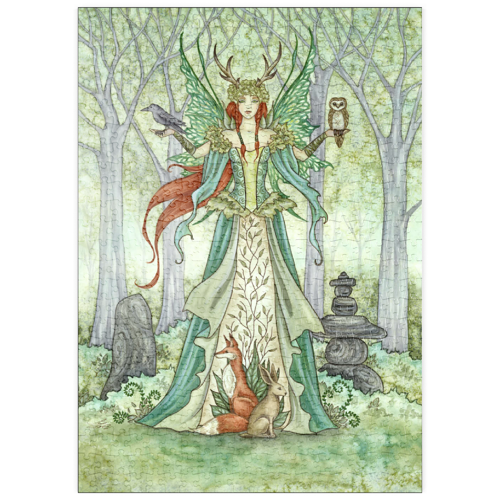 In „The Caretaker“ steht eine majestätische Waldfee mit Geweih und Flügeln als Wächterin des Waldreichs, flankiert von einem Fuchs, einem Hasen, einer Eule und einem Raben. Ihr Kleid blüht mit Blattwerk und symbolisiert die Harmonie zwischen allen Lebewesen und die stille, wachsame Magie der Natur.