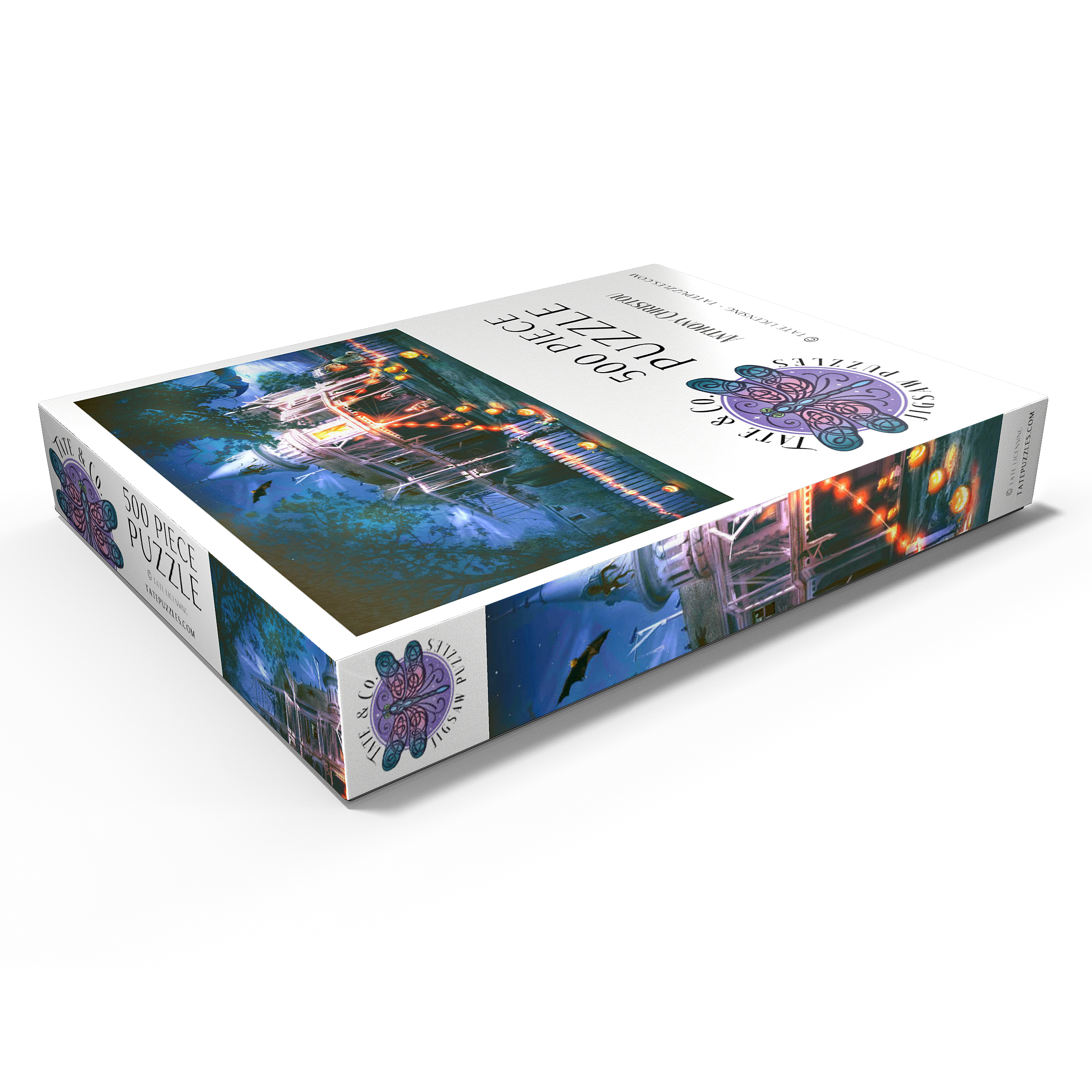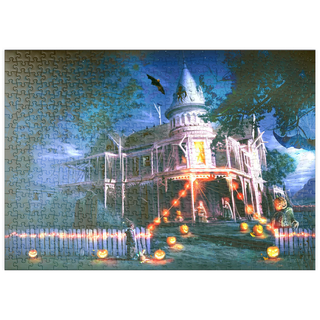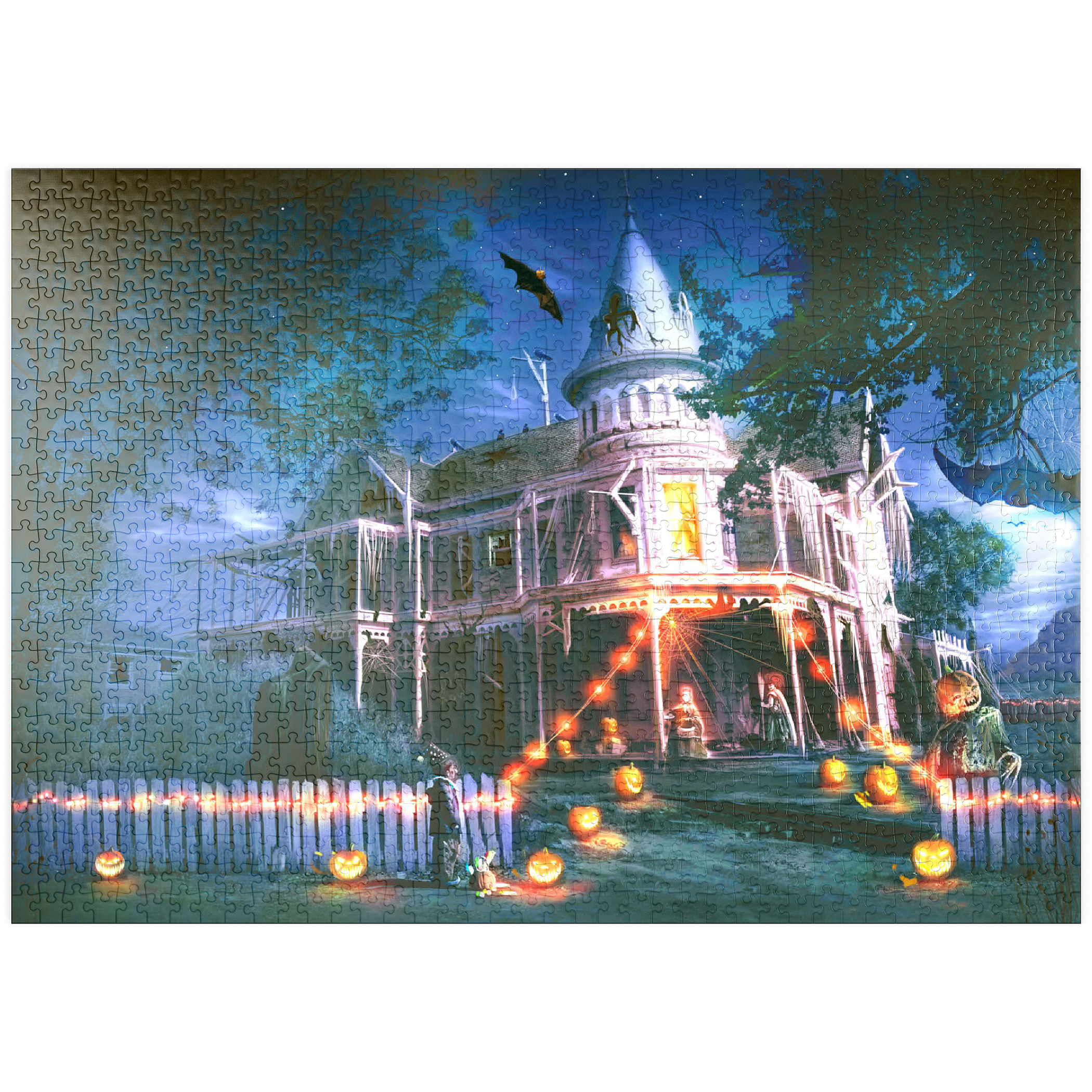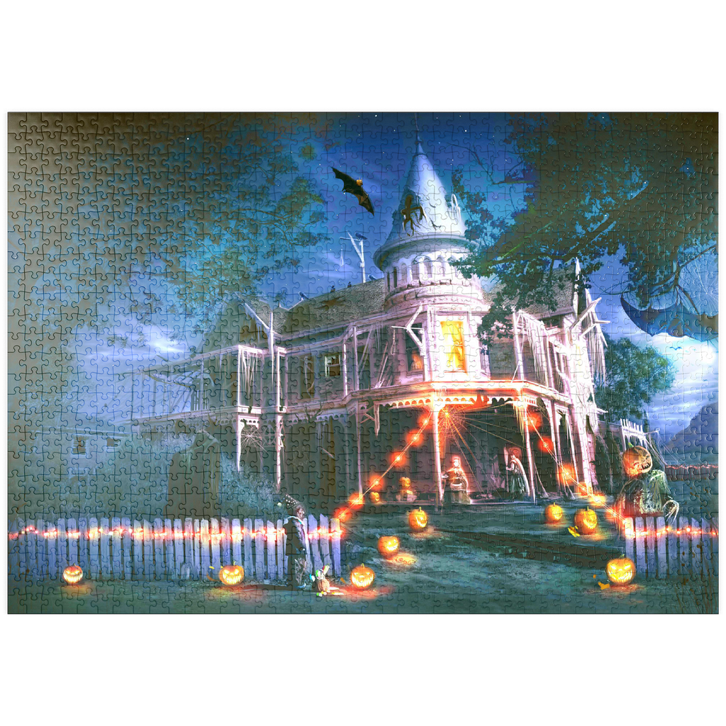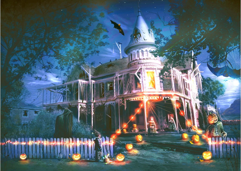 Halloween ist ein detailreiches Halloween-Gemälde, das von einer unheimlichen Atmosphäre und einer düsteren Erzählung durchdrungen ist. Auf der linken Seite steht ein kleiner Junge in einem zerfetzten Clownskostüm vor dem verrosteten Tor eines baufälligen alten Hauses und bemerkt nicht die vermummte Gestalt, die sich lautlos hinter ihm abzeichnet. Die Szene ist voller gespenstischer Energie – Fledermäuse flattern über ihr, Kürbislaternen flackern mit grinsenden Gesichtern, und eine unheimliche Vogelscheuche beobachtet das Geschehen vom Hof aus. Zwei Hexen flüstern in der Nähe der Veranda, ein roter Dämon späht aus einem zerbrochenen Fenster, und geisterhafte Gestalten schweben durch die Schatten. Jeder Winkel erzählt eine schaurige Geschichte in dieser lebhaften Hommage an den Halloween-Horror.