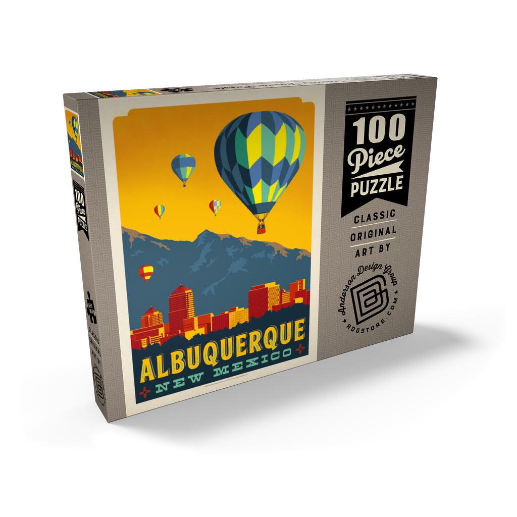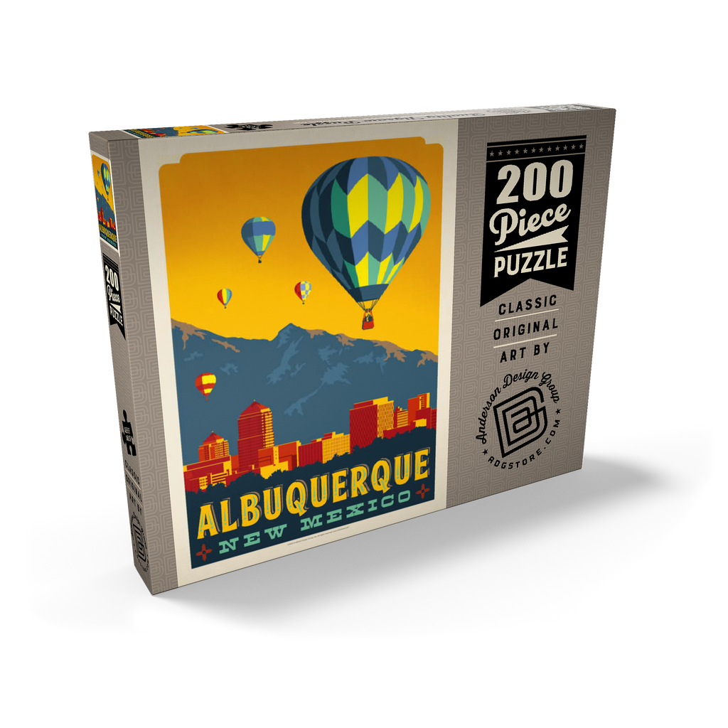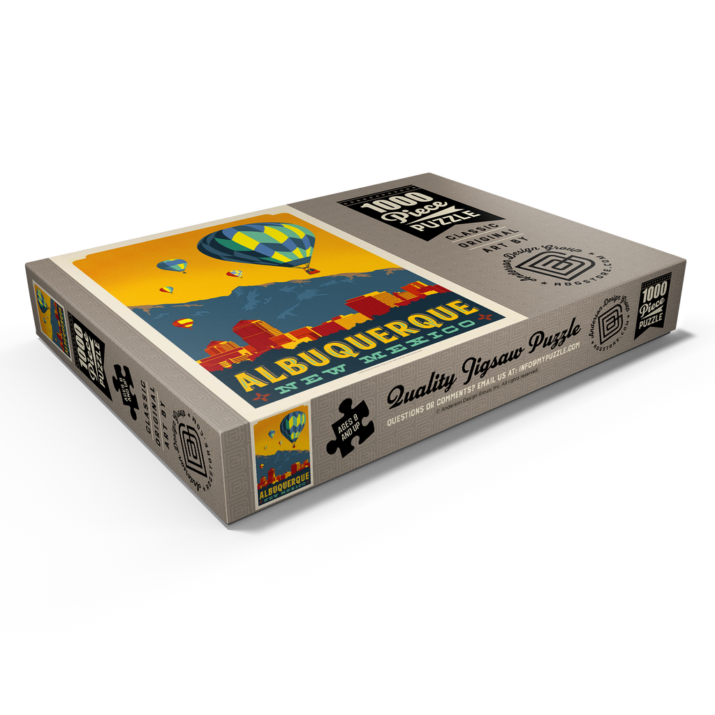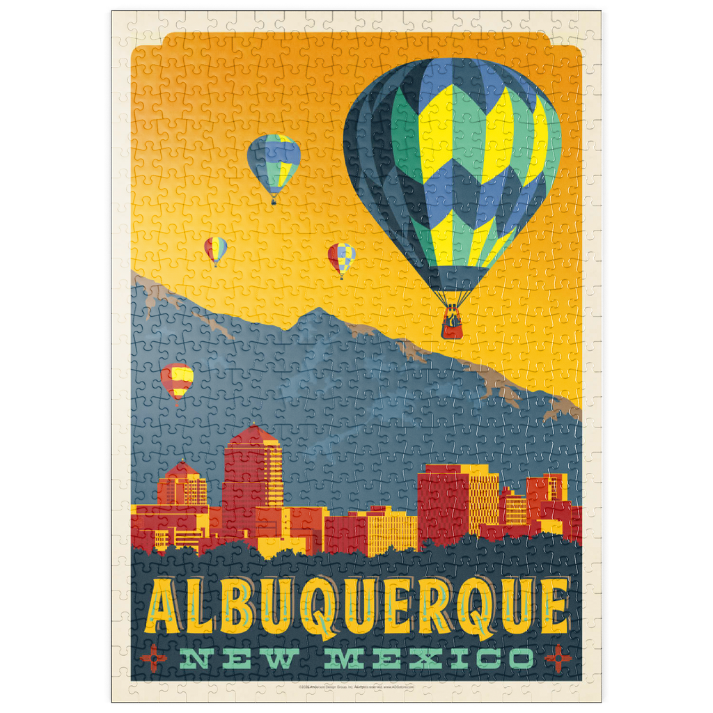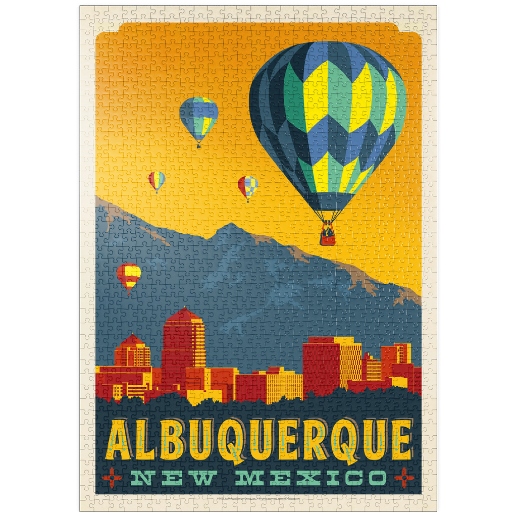 Dieses farbenfrohe Kunstwerk zeigt die Skyline von Albuquerque, New Mexico, vor dem Hintergrund der Sandia Mountains, mit leuchtenden Heißluftballons, die in einen goldenen Himmel aufsteigen. Die Szene zelebriert die weltberühmte International Balloon Fiesta der Stadt und fängt den einzigartigen Charme und die landschaftliche Schönheit des Südwestens von Albuquerque ein. Die markanten architektonischen Formen der Gebäude in der Innenstadt bilden einen wunderschönen Kontrast zu den natürlichen Bergen im Hintergrund und den festlichen Ballonmustern am Himmel. Albuquerque ist bekannt für sein reiches Erbe der amerikanischen Ureinwohner und Hispanics und gilt als kulturelles und visuelles Wahrzeichen des amerikanischen Südwestens. Diese stilisierte Komposition verbindet urbane Energie mit der Ruhe der Hochwüste.