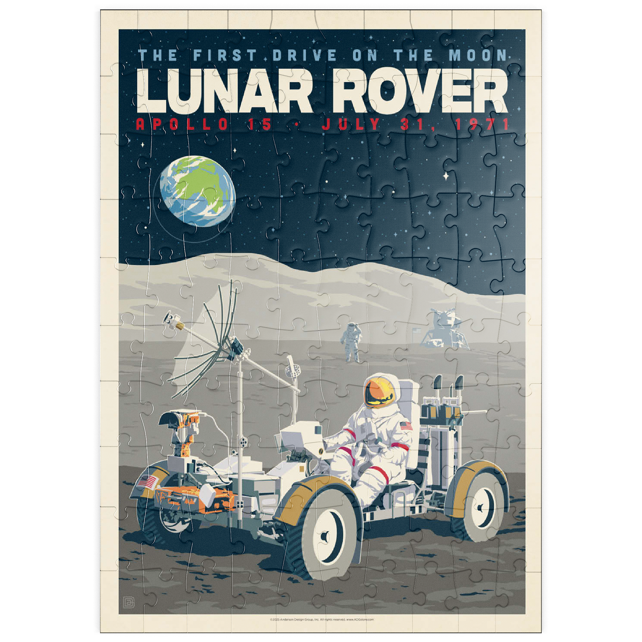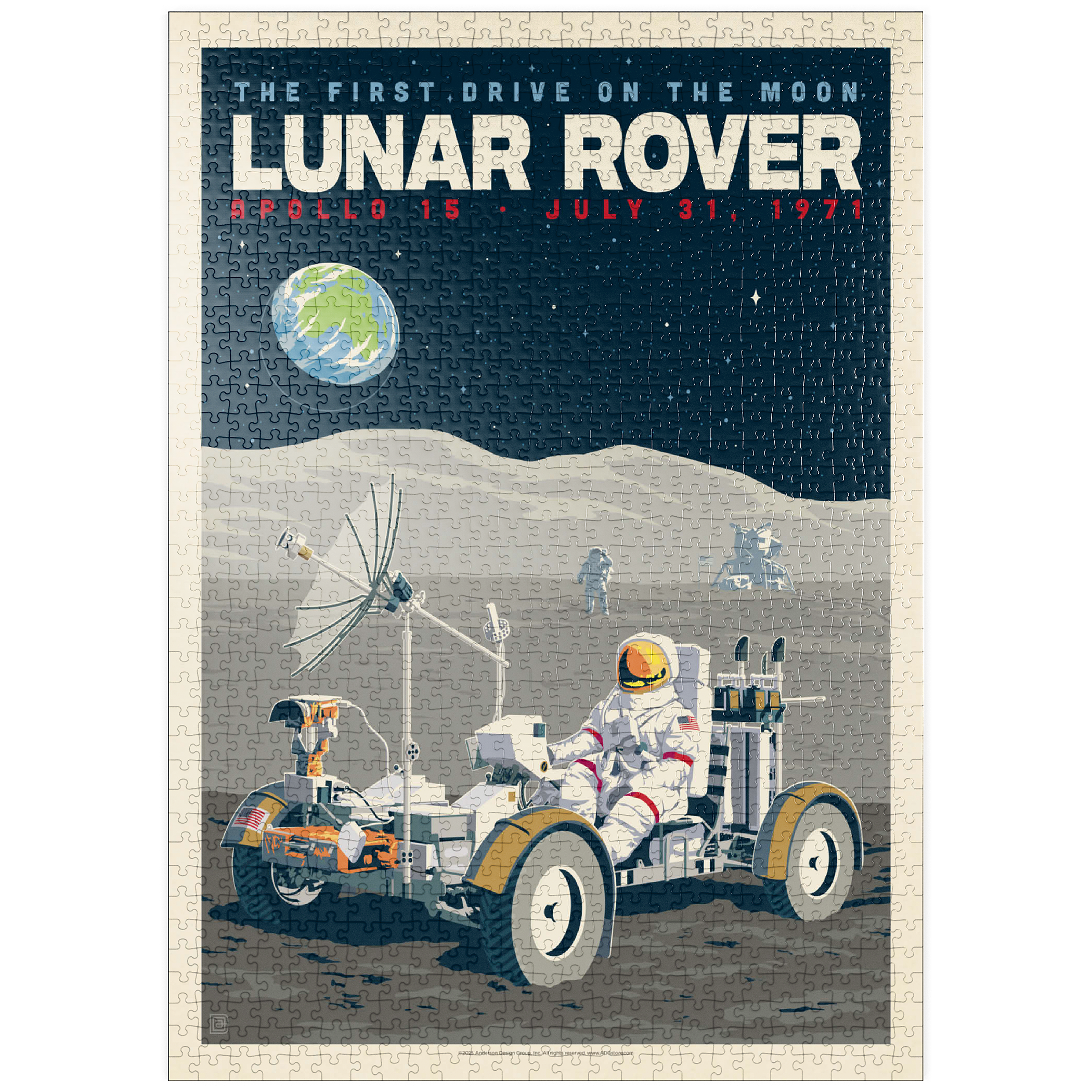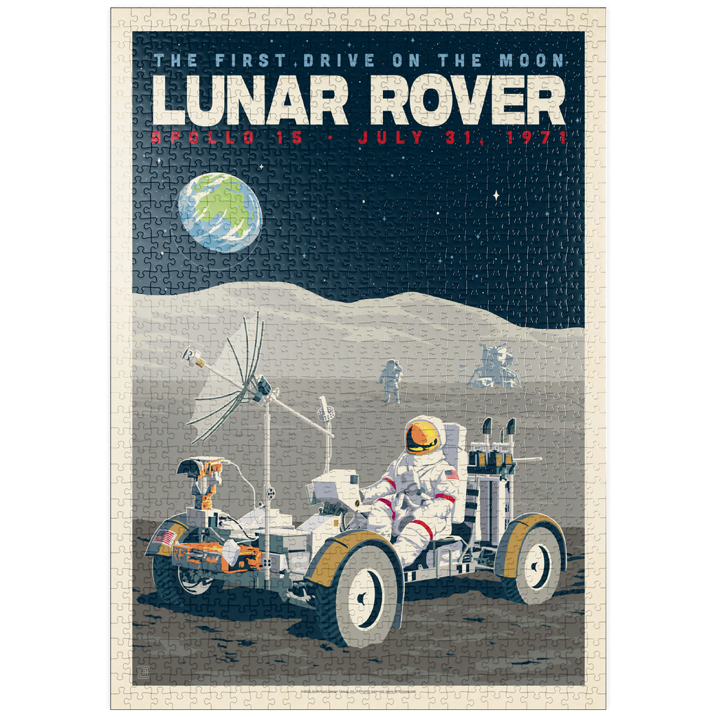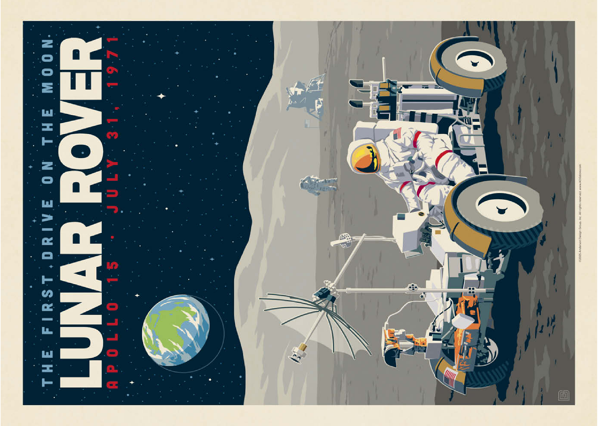 Dieses Kunstwerk im Retro-Stil erinnert an die historische erste Fahrt auf dem Mond während der Apollo-15-Mission der NASA am 31. Juli 1971. Es zeigt das Mondfahrzeug (Lunar Roving Vehicle, LRV), das von einem Astronauten in voller Montur gesteuert wird und über die zerklüftete Mondoberfläche fährt, während über ihm die Erde am Sternenhimmel zu sehen ist. Apollo 15 markierte das Debüt des Mondrovers, mit dem Astronauten größere Entfernungen erkunden und umfangreichere wissenschaftliche Experimente durchführen konnten. Im Hintergrund sind ein weiterer Astronaut und die Mondlandefähre zu sehen, die der Szene Tiefe verleihen. Diese stilisierte Darstellung würdigt einen der innovativsten Meilensteine der Weltraumforschung.