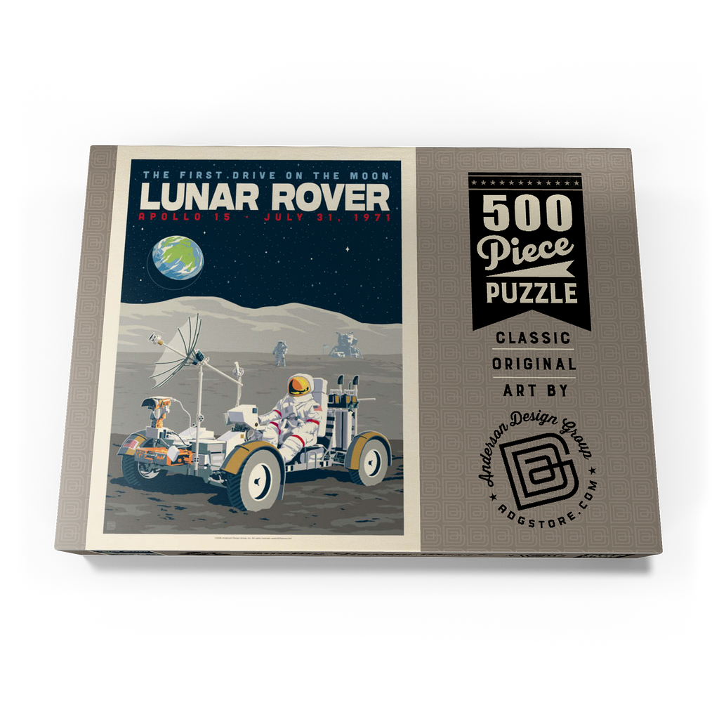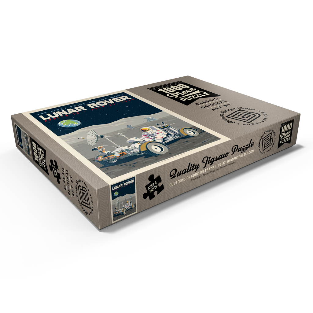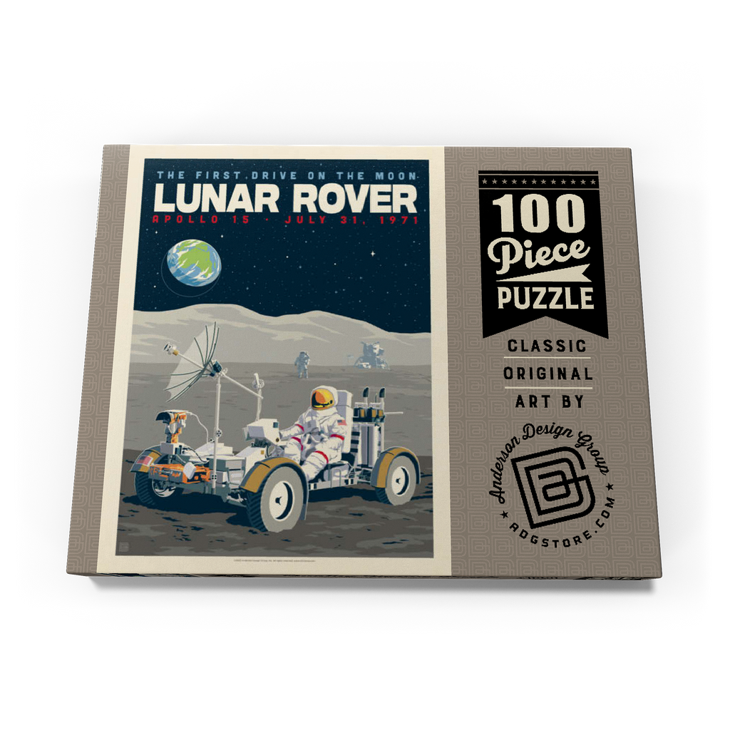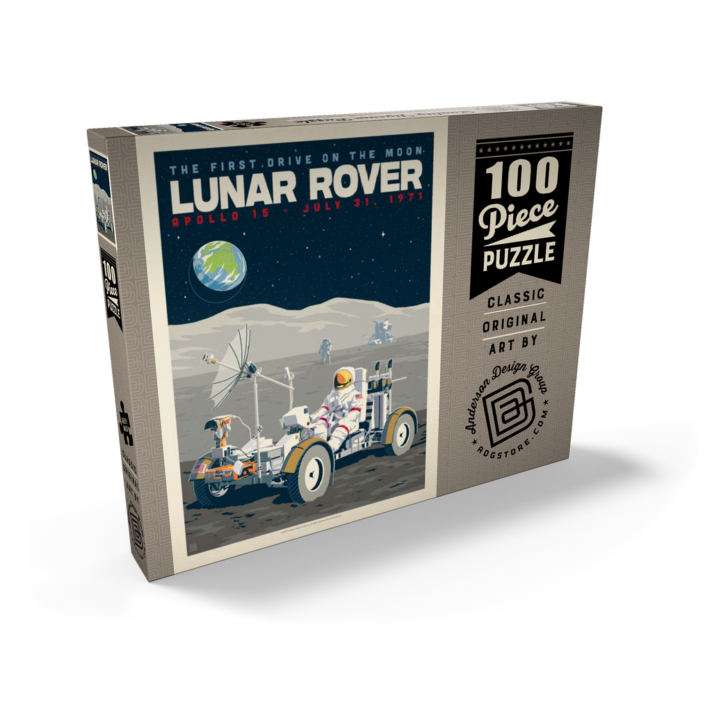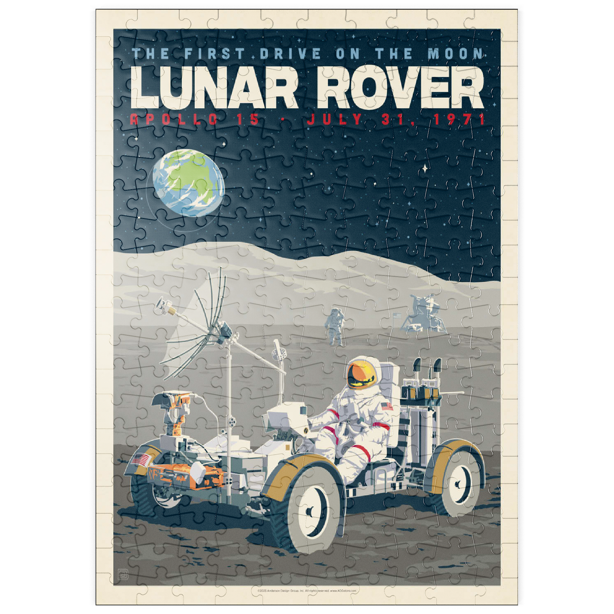 Dieses Kunstwerk im Retro-Stil erinnert an die historische erste Fahrt auf dem Mond während der Apollo-15-Mission der NASA am 31. Juli 1971. Es zeigt das Mondfahrzeug (Lunar Roving Vehicle, LRV), das von einem Astronauten in voller Montur gesteuert wird und über die zerklüftete Mondoberfläche fährt, während über ihm die Erde am Sternenhimmel zu sehen ist. Apollo 15 markierte das Debüt des Mondrovers, mit dem Astronauten größere Entfernungen erkunden und umfangreichere wissenschaftliche Experimente durchführen konnten. Im Hintergrund sind ein weiterer Astronaut und die Mondlandefähre zu sehen, die der Szene Tiefe verleihen. Diese stilisierte Darstellung würdigt einen der innovativsten Meilensteine der Weltraumforschung.