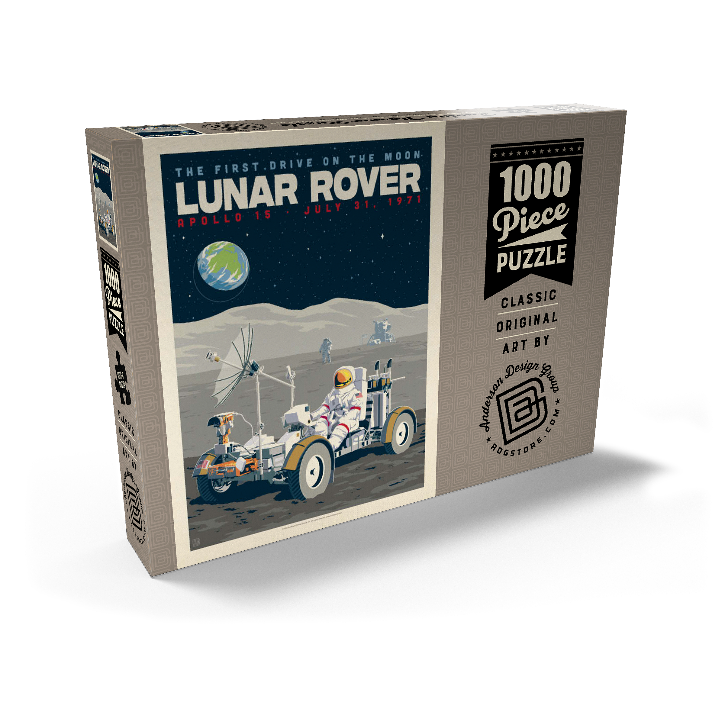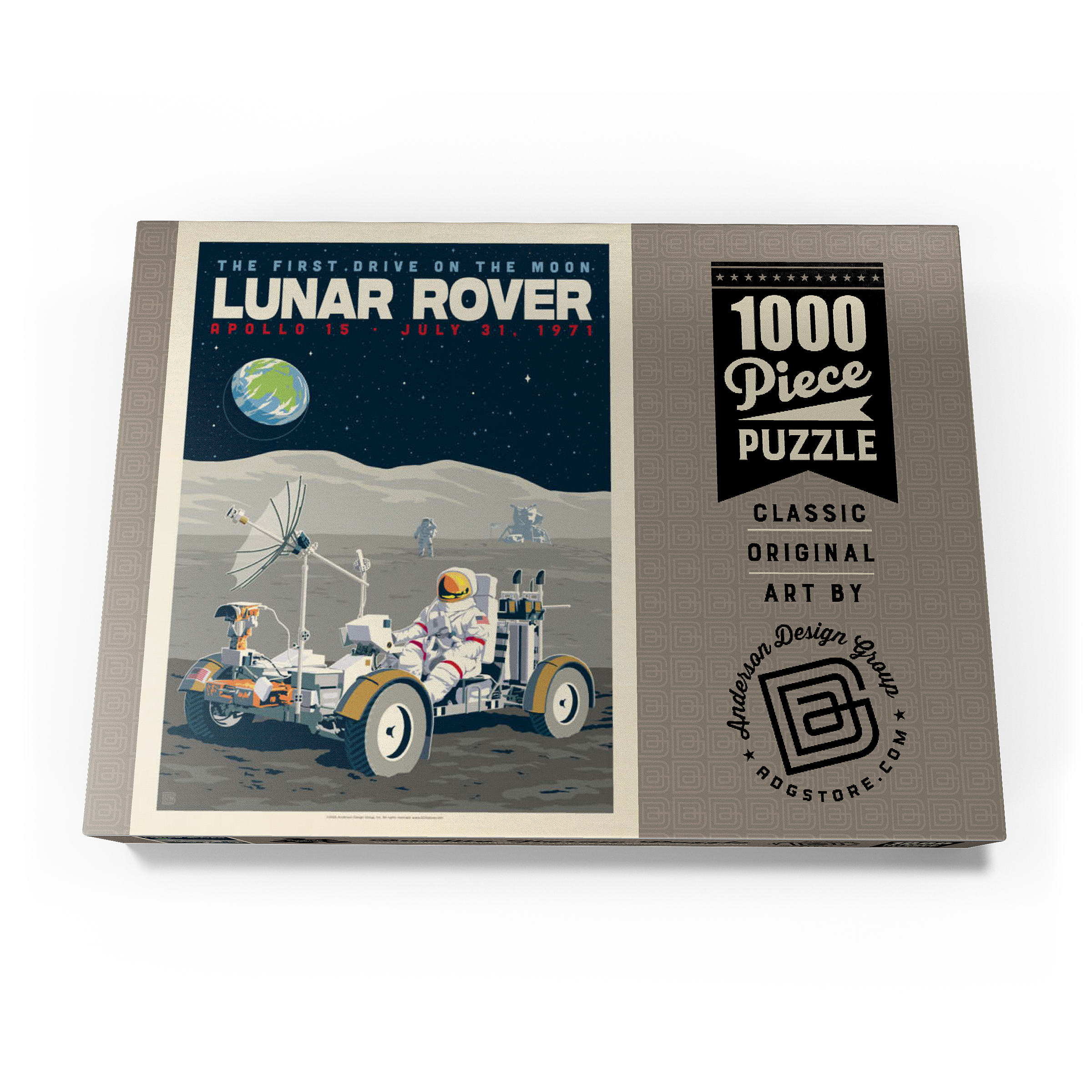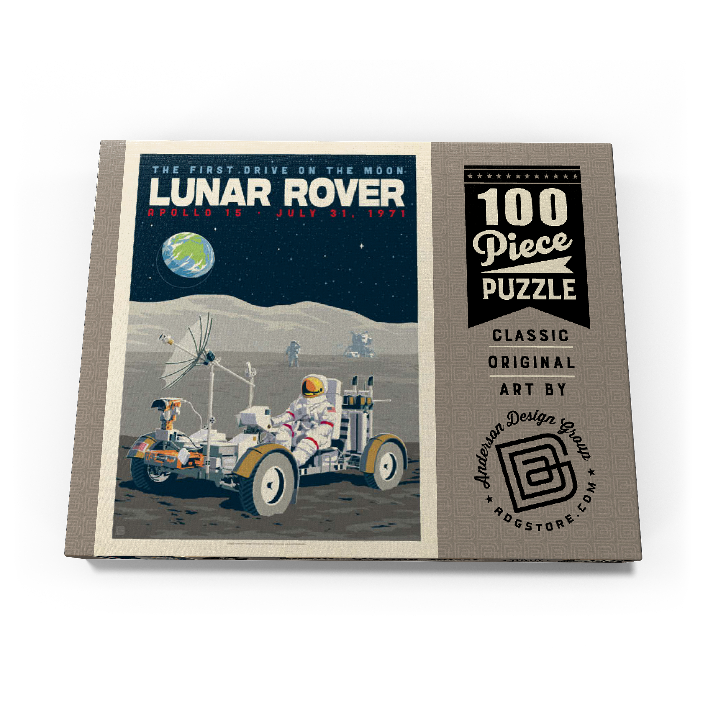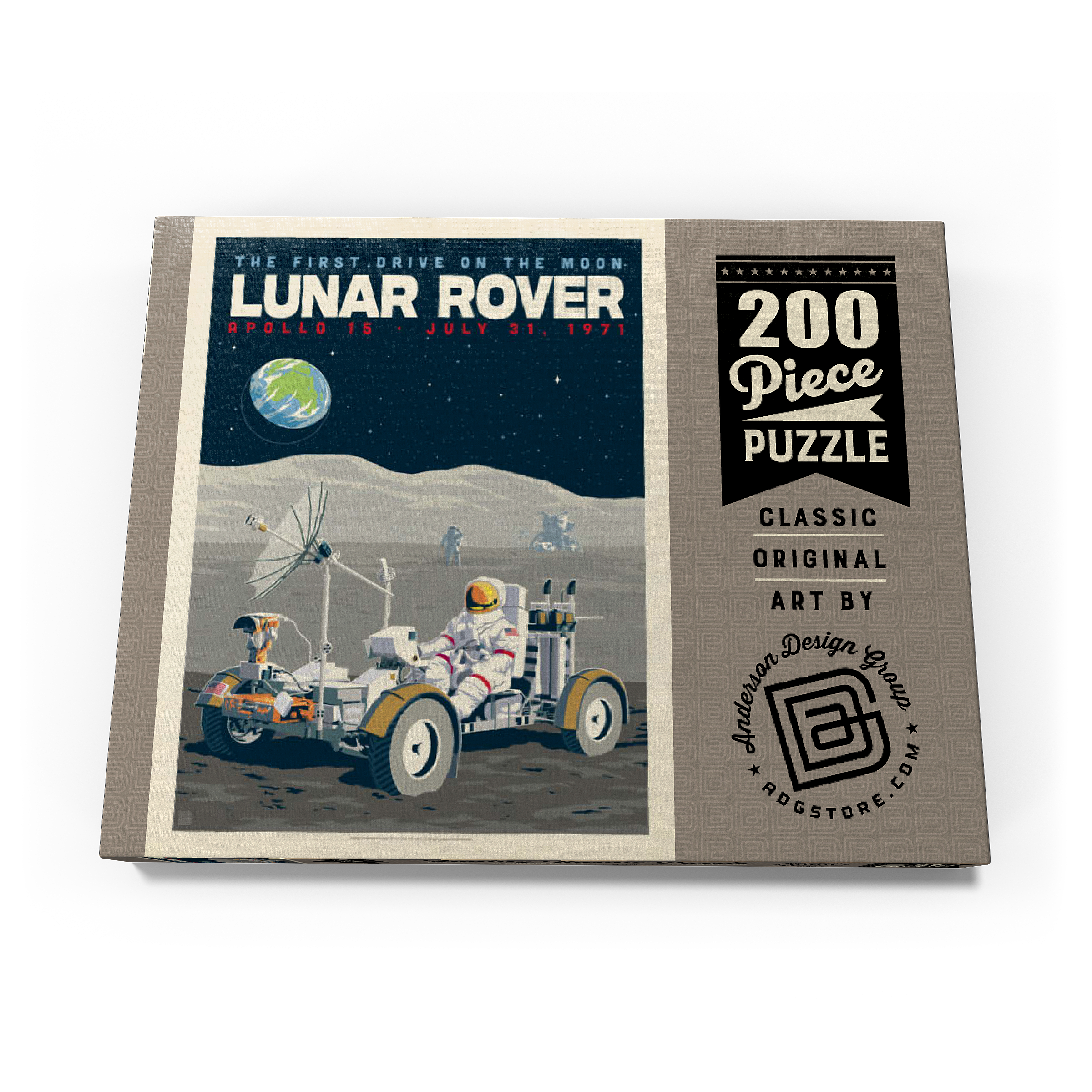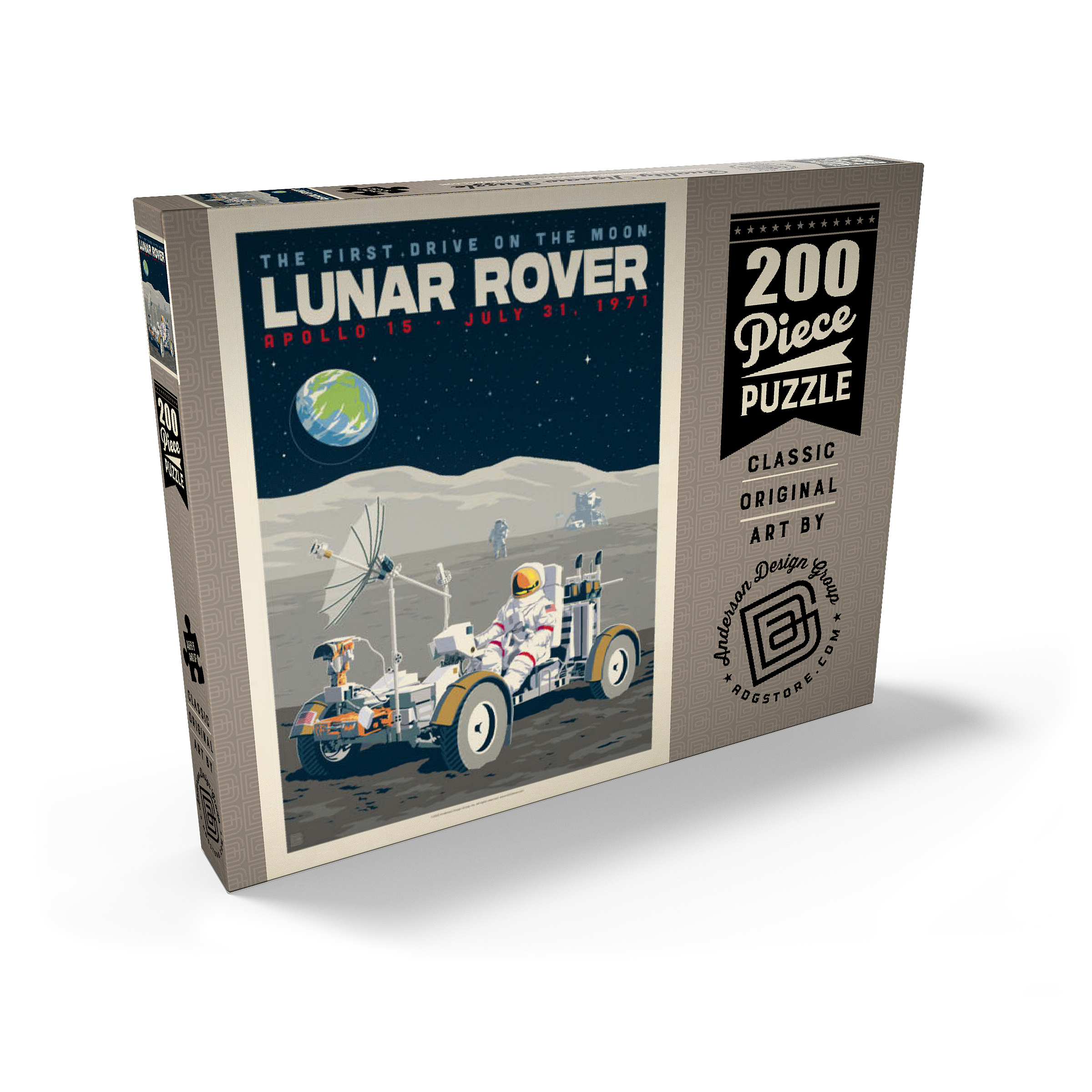 Dieses Kunstwerk im Retro-Stil erinnert an die historische erste Fahrt auf dem Mond während der Apollo-15-Mission der NASA am 31. Juli 1971. Es zeigt das Mondfahrzeug (Lunar Roving Vehicle, LRV), das von einem Astronauten in voller Montur gesteuert wird und über die zerklüftete Mondoberfläche fährt, während über ihm die Erde am Sternenhimmel zu sehen ist. Apollo 15 markierte das Debüt des Mondrovers, mit dem Astronauten größere Entfernungen erkunden und umfangreichere wissenschaftliche Experimente durchführen konnten. Im Hintergrund sind ein weiterer Astronaut und die Mondlandefähre zu sehen, die der Szene Tiefe verleihen. Diese stilisierte Darstellung würdigt einen der innovativsten Meilensteine der Weltraumforschung.