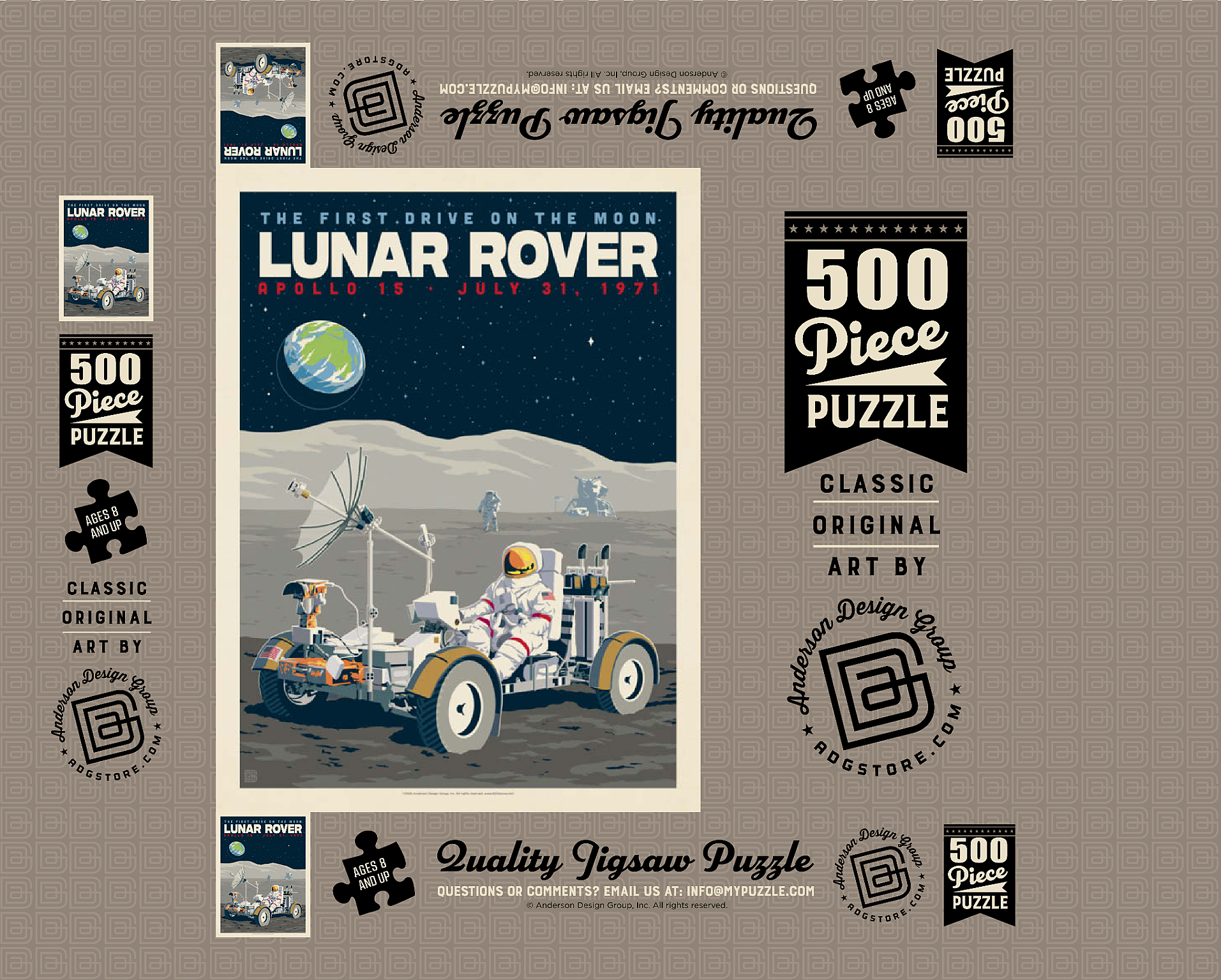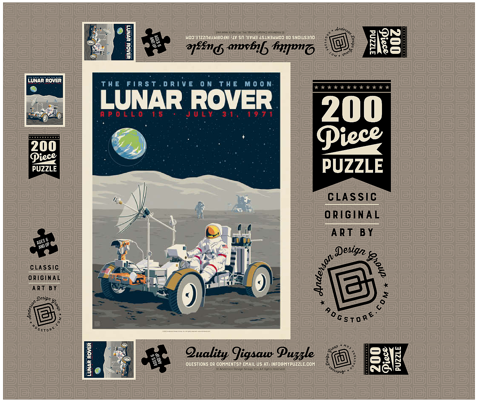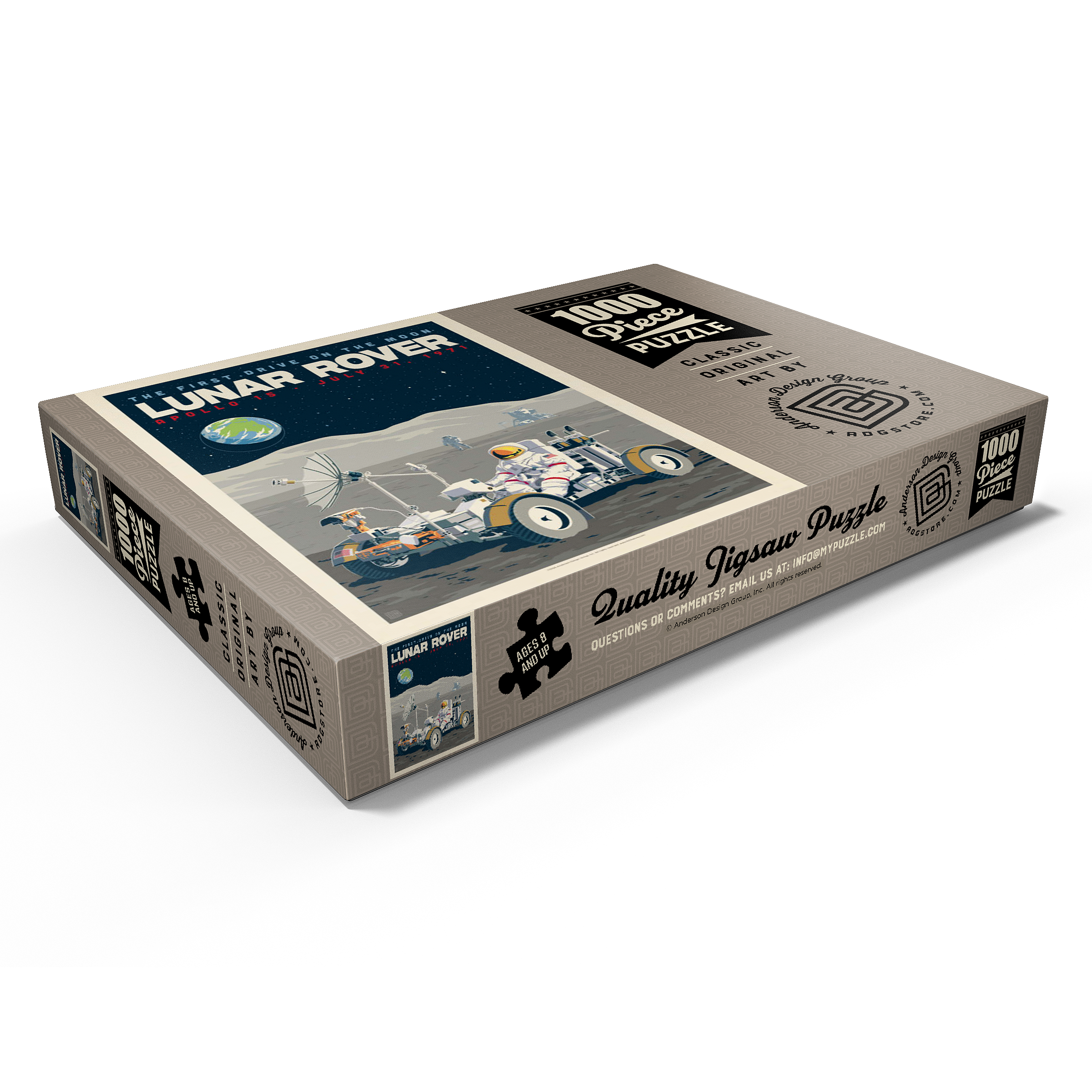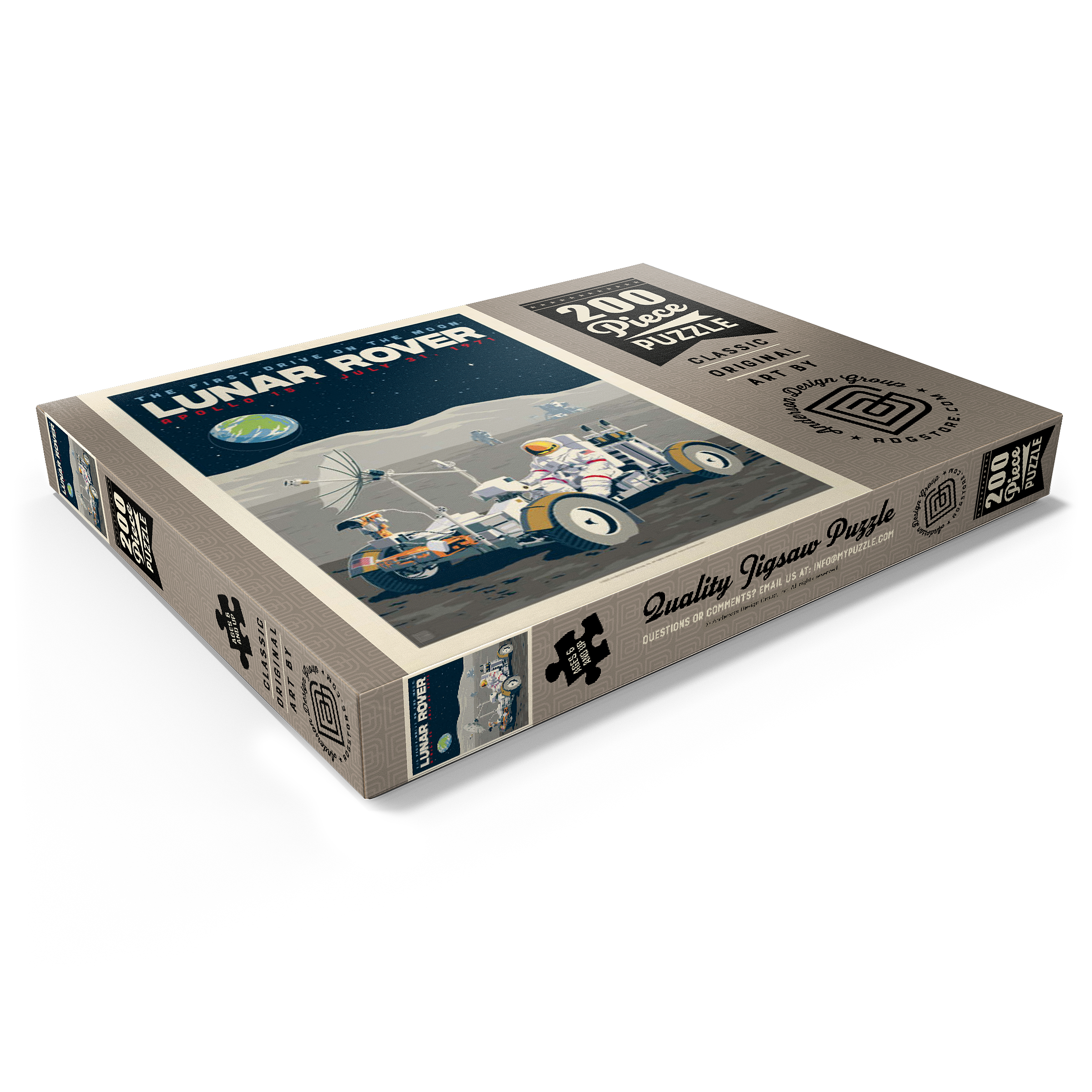 Dieses Kunstwerk im Retro-Stil erinnert an die historische erste Fahrt auf dem Mond während der Apollo-15-Mission der NASA am 31. Juli 1971. Es zeigt das Mondfahrzeug (Lunar Roving Vehicle, LRV), das von einem Astronauten in voller Montur gesteuert wird und über die zerklüftete Mondoberfläche fährt, während über ihm die Erde am Sternenhimmel zu sehen ist. Apollo 15 markierte das Debüt des Mondrovers, mit dem Astronauten größere Entfernungen erkunden und umfangreichere wissenschaftliche Experimente durchführen konnten. Im Hintergrund sind ein weiterer Astronaut und die Mondlandefähre zu sehen, die der Szene Tiefe verleihen. Diese stilisierte Darstellung würdigt einen der innovativsten Meilensteine der Weltraumforschung.