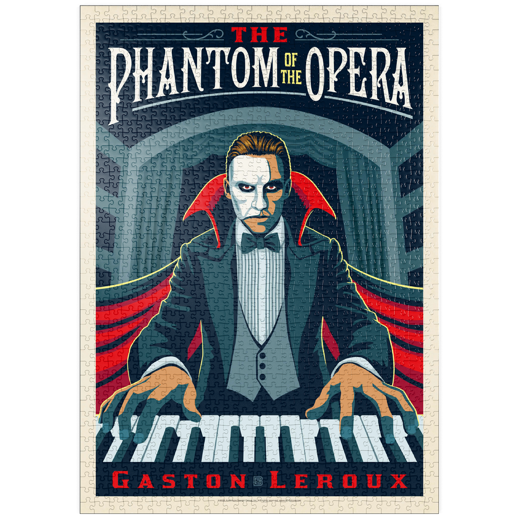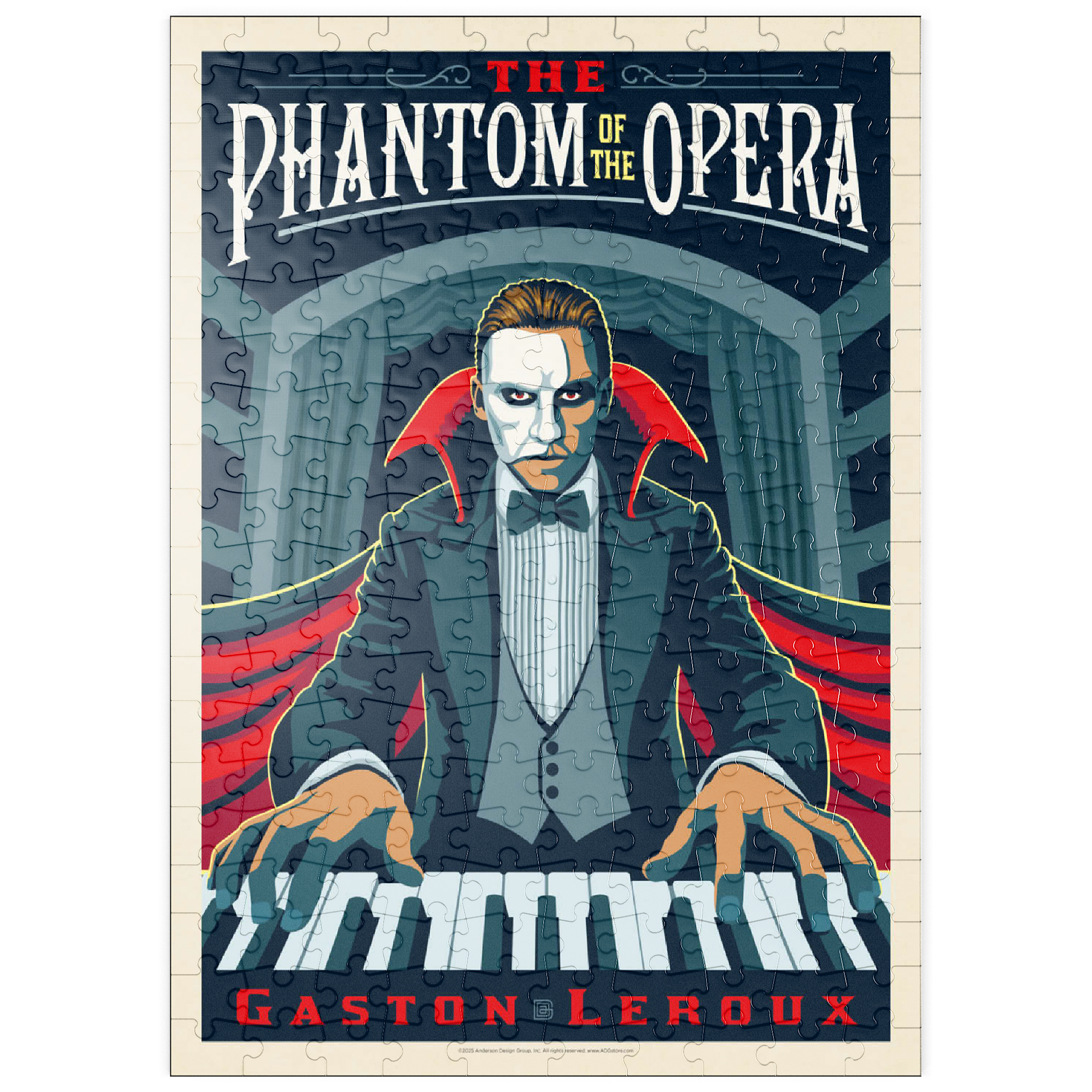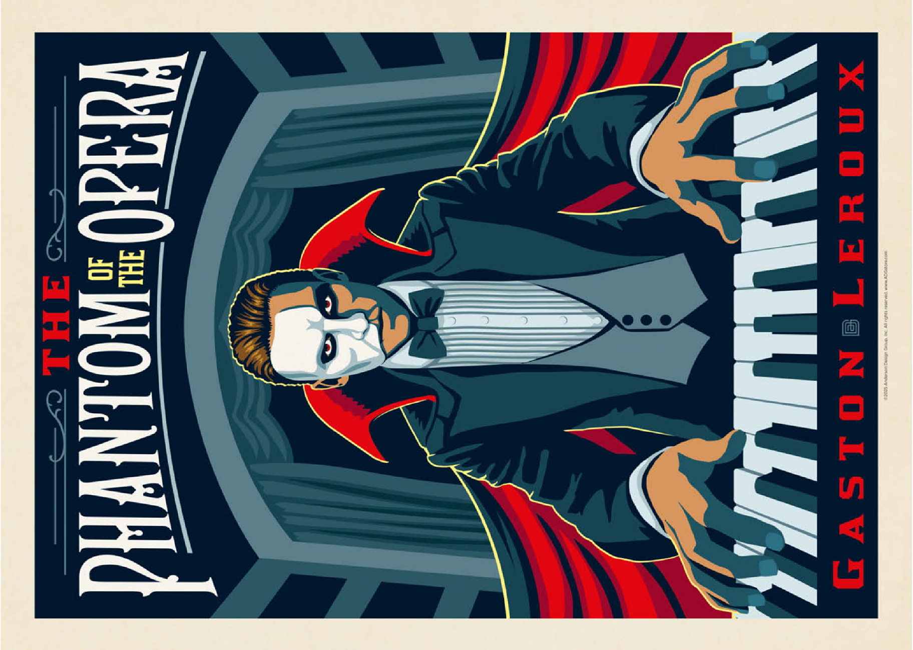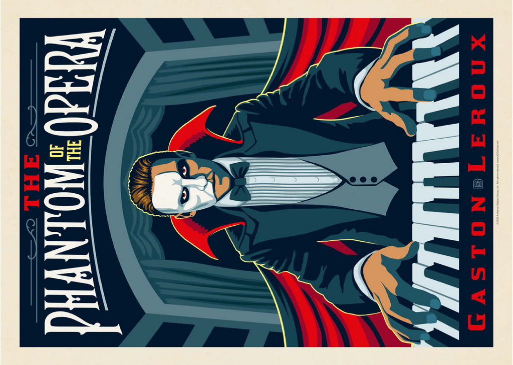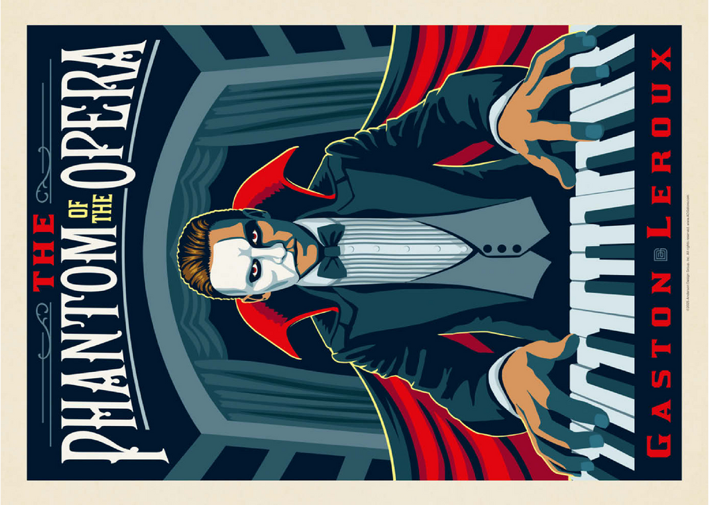 Diese kühne und dramatische Darstellung fängt die ikonische maskierte Figur aus „Das Phantom der Oper“, dem berühmten Roman von Gaston Leroux, ein. Die Hauptfigur ist beim Spielen eines Flügels dargestellt, gekleidet in formeller Abendgarderobe mit einem hochgeschlossenen Umhang und einer auffälligen weißen Maske, die sein Gesicht teilweise verdeckt und seine geheimnisvolle und eindringliche Präsenz unterstreicht. Der dunkle theatralische Hintergrund mit fließenden roten Vorhängen verstärkt die Spannung und Erhabenheit der Szene, während die scharfen Kontraste in der Beleuchtung und die kühne Farbwahl eine kraftvolle, stilisierte visuelle Wirkung erzielen. Diese Darstellung konzentriert sich auf die komplexe Persönlichkeit des Phantoms – eine Mischung aus Genialität, Besessenheit und verborgener Tragik – in der opulenten und spannungsgeladenen Welt des Opernhauses. Der künstlerische Stil verwendet klare Linien und grafische Formen, um die gotische Eleganz und dramatische Intensität der Geschichte zu vermitteln. Das Phantom der Oper wird weltweit als zeitlose Geschichte über Liebe, Musik und Geheimnisse gefeiert, und diese stilisierte Darstellung erweckt die Legende in einem visuell beeindruckenden, emotionsgeladenen Format zum Leben, das Fans klassischer Literatur und theatralischer Erzählkunst anspricht.