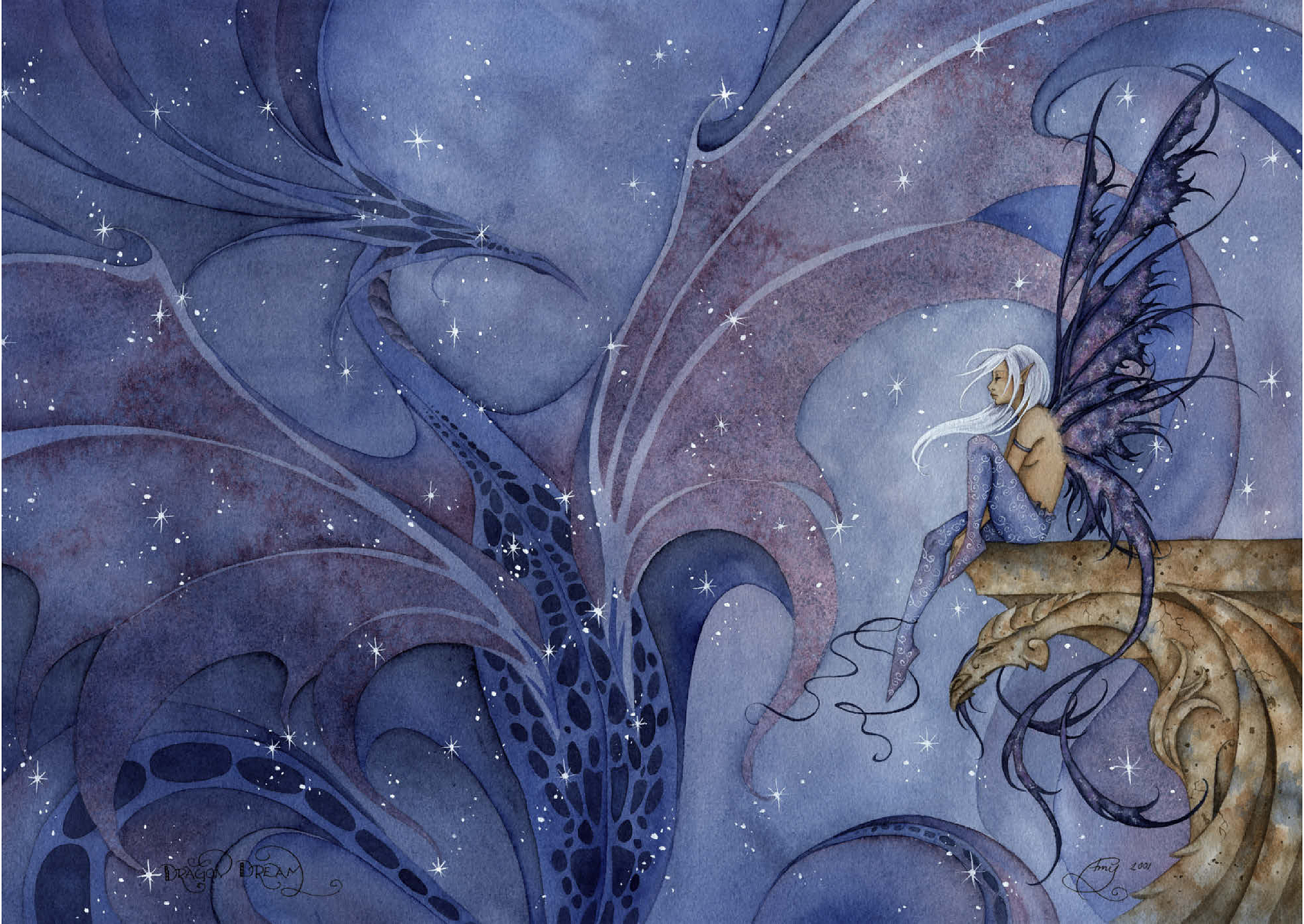 Das verträumte Kunstwerk -Dragon Dream- von Amy Brown zeigt eine wehmütige Fee mit wallendem weißem Haar und dunklen, verschlungenen Flügeln, die auf einem verzierten Sims sitzt und in einen mit Sternen gefüllten Himmel blickt. Die fließenden, abstrakten Formen eines Drachens fügen sich nahtlos in den Sternenhimmel ein und schaffen eine ätherische und kontemplative Atmosphäre.