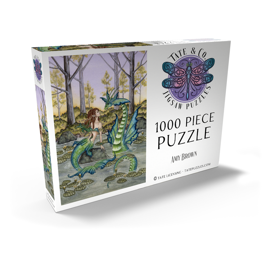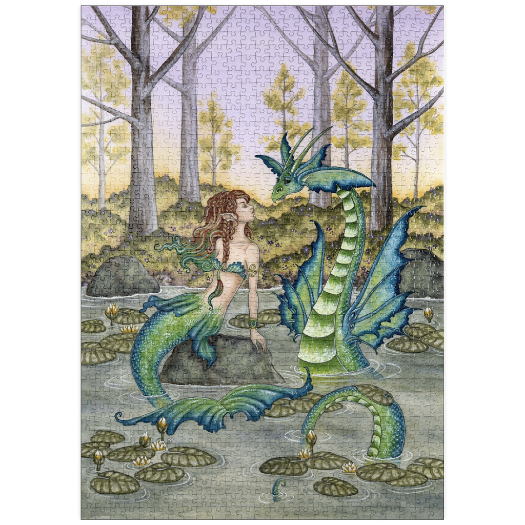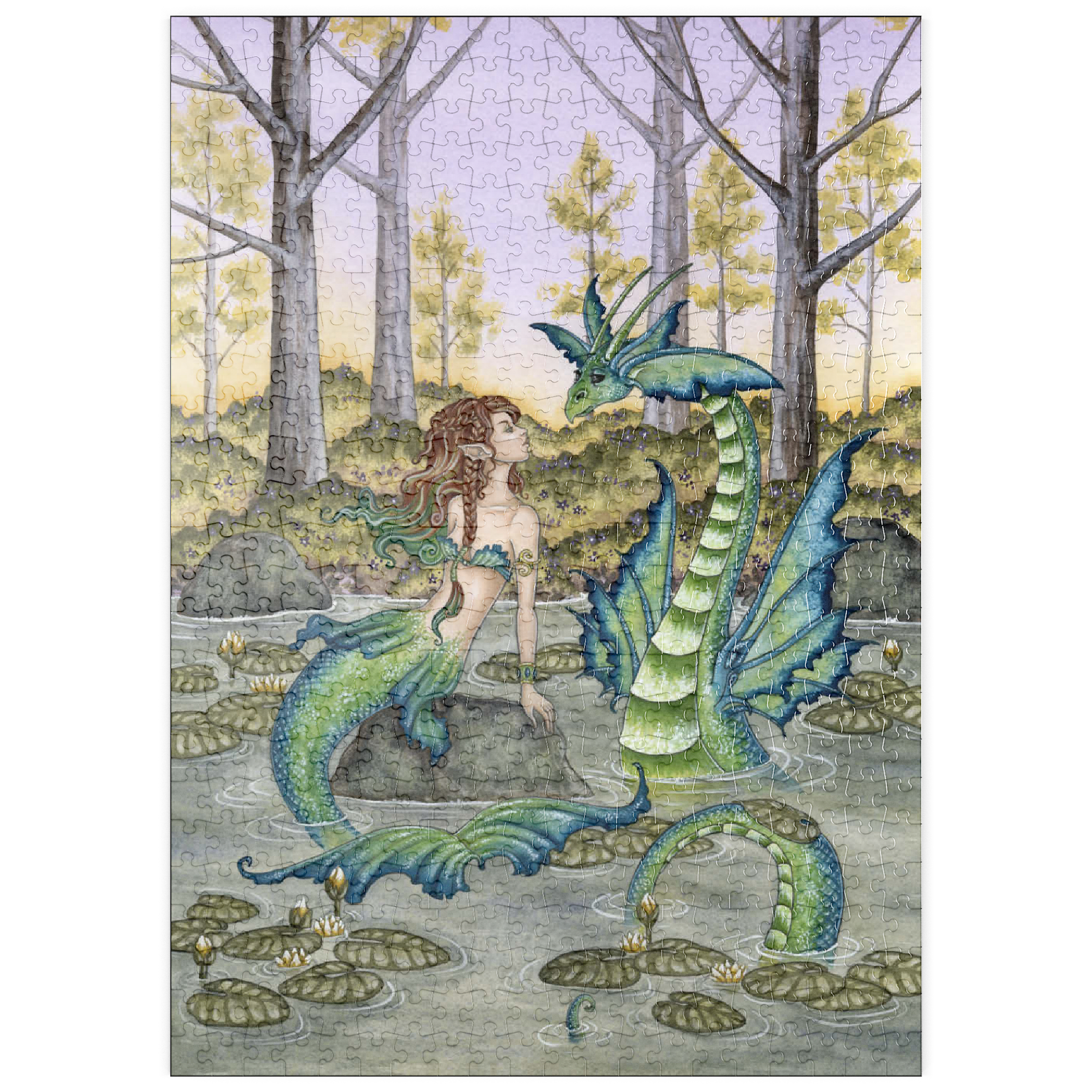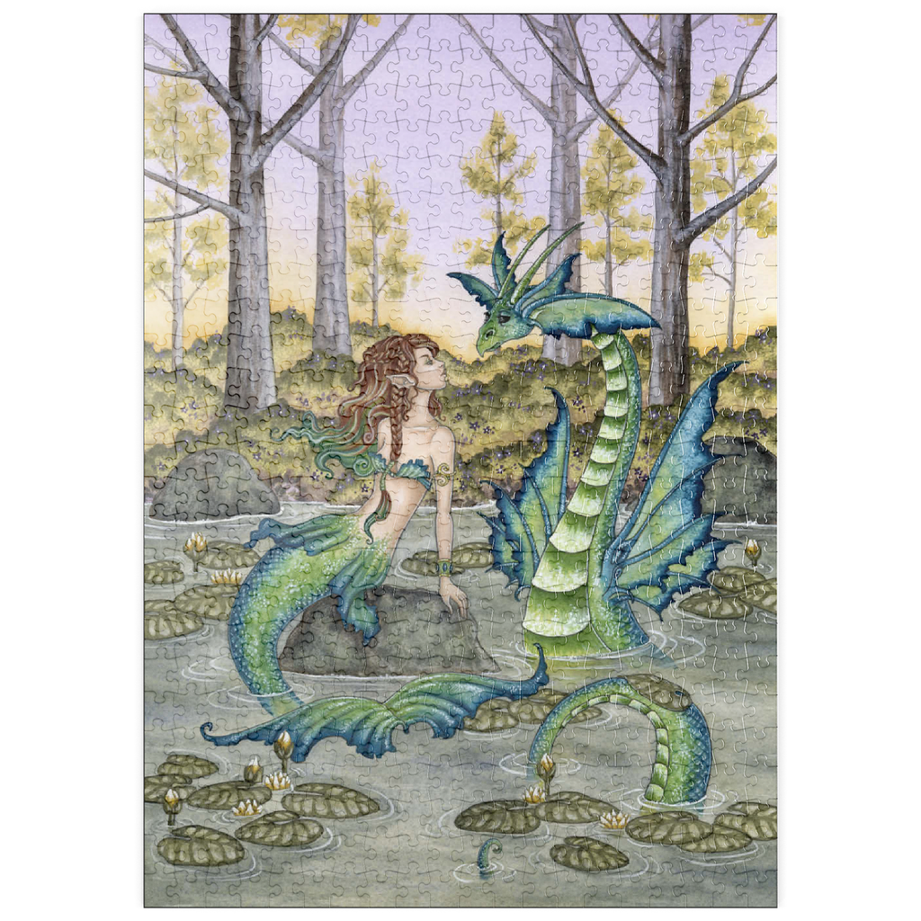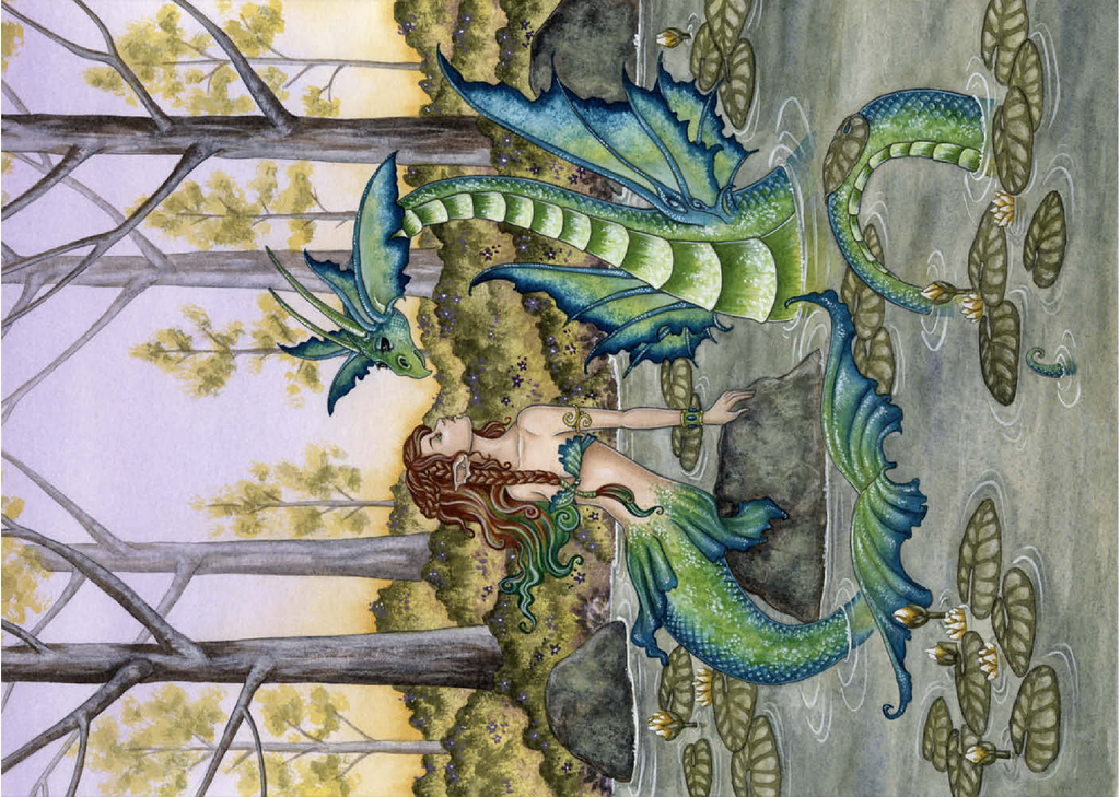 In „Lazy Afternoon“ genießt eine ruhige Meerjungfrau einen stillen Moment mit einem sanften Seedrachen zwischen Seerosenblättern und goldenem Waldlicht. Ihre friedliche Verbindung strahlt eine ruhige Magie aus, als ob die Zeit in diesem verzauberten Waldteich langsamer verläuft.