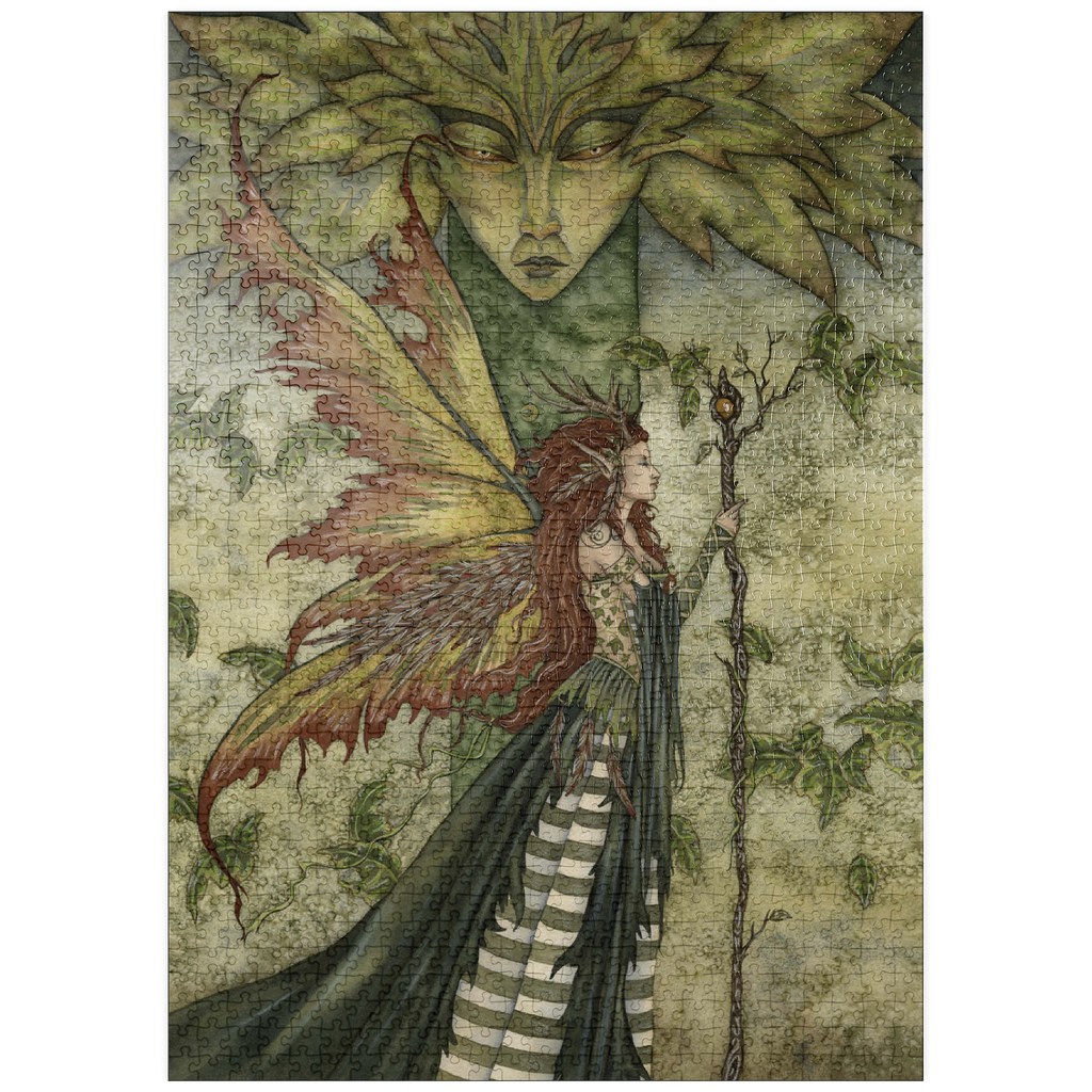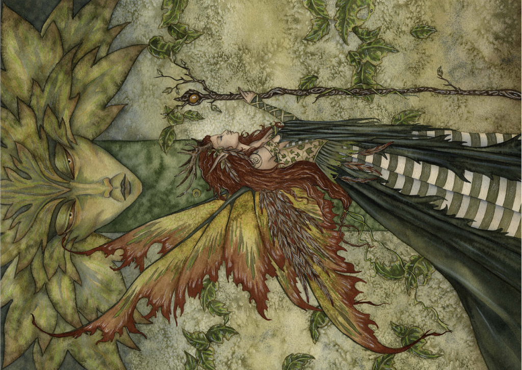 Dieses atemberaubende Kunstwerk -The Greenwoman- von Amy Brown zeigt eine mächtige Waldfee mit einem Geweih und lebhaften, erdigen Flügeln, die einen Stab mit einer mystischen Kugel in der Hand hält. Die Szene ist von der Essenz der Natur durchdrungen. Die Fee steht vor dem rätselhaften Gesicht eines Grünen Mannes, der den Geist der Wildnis symbolisiert.