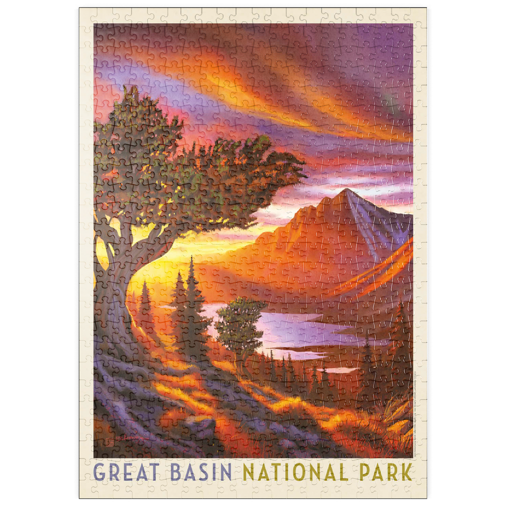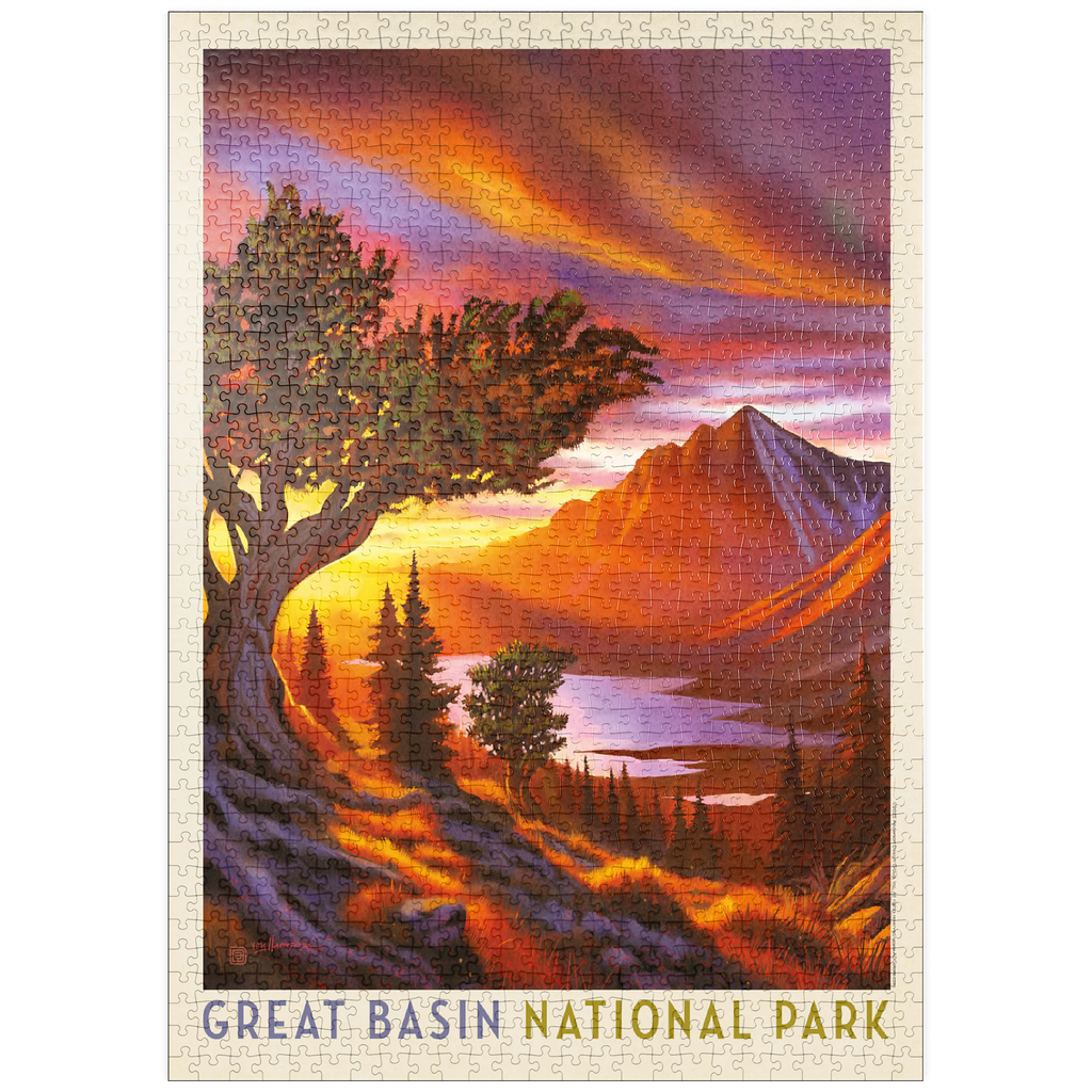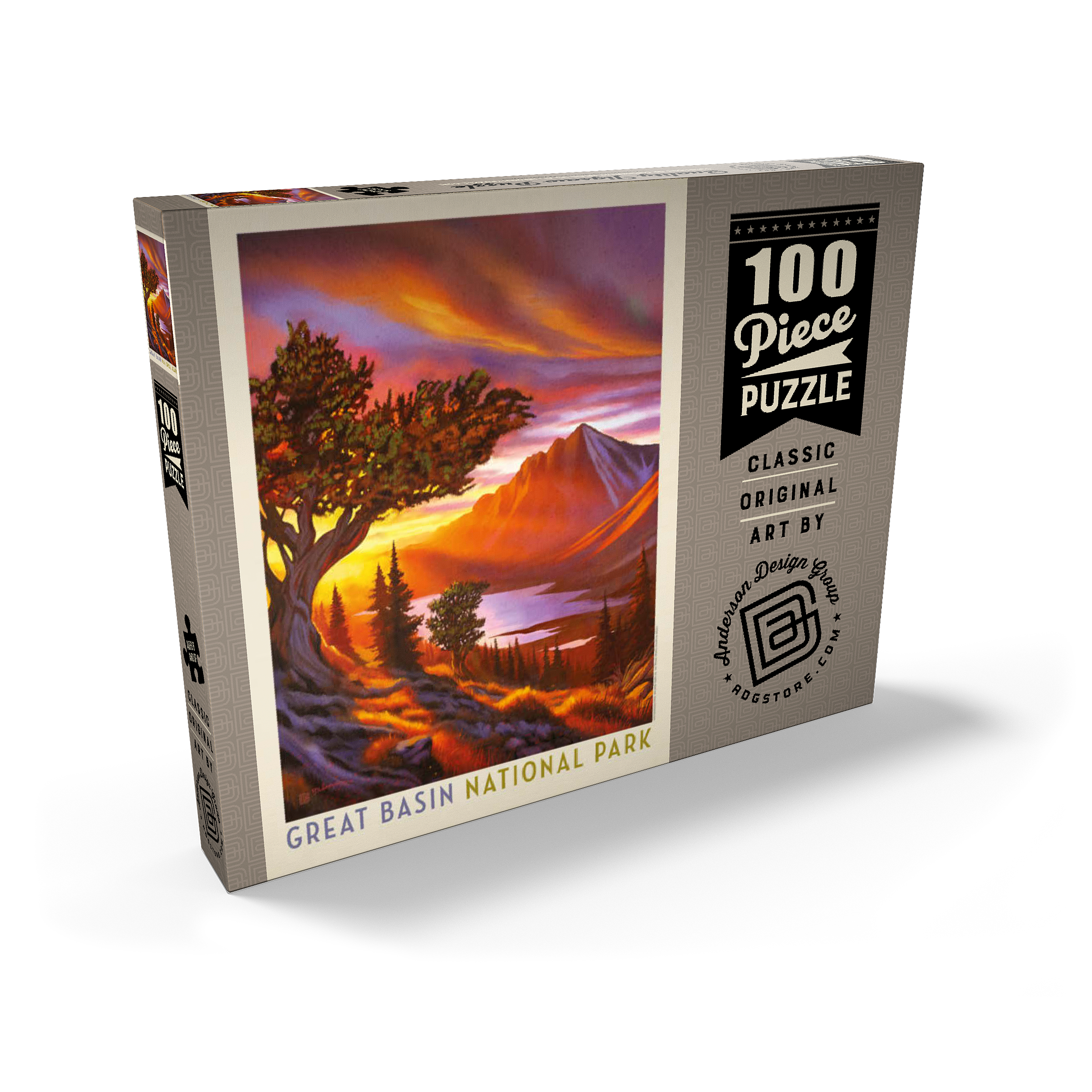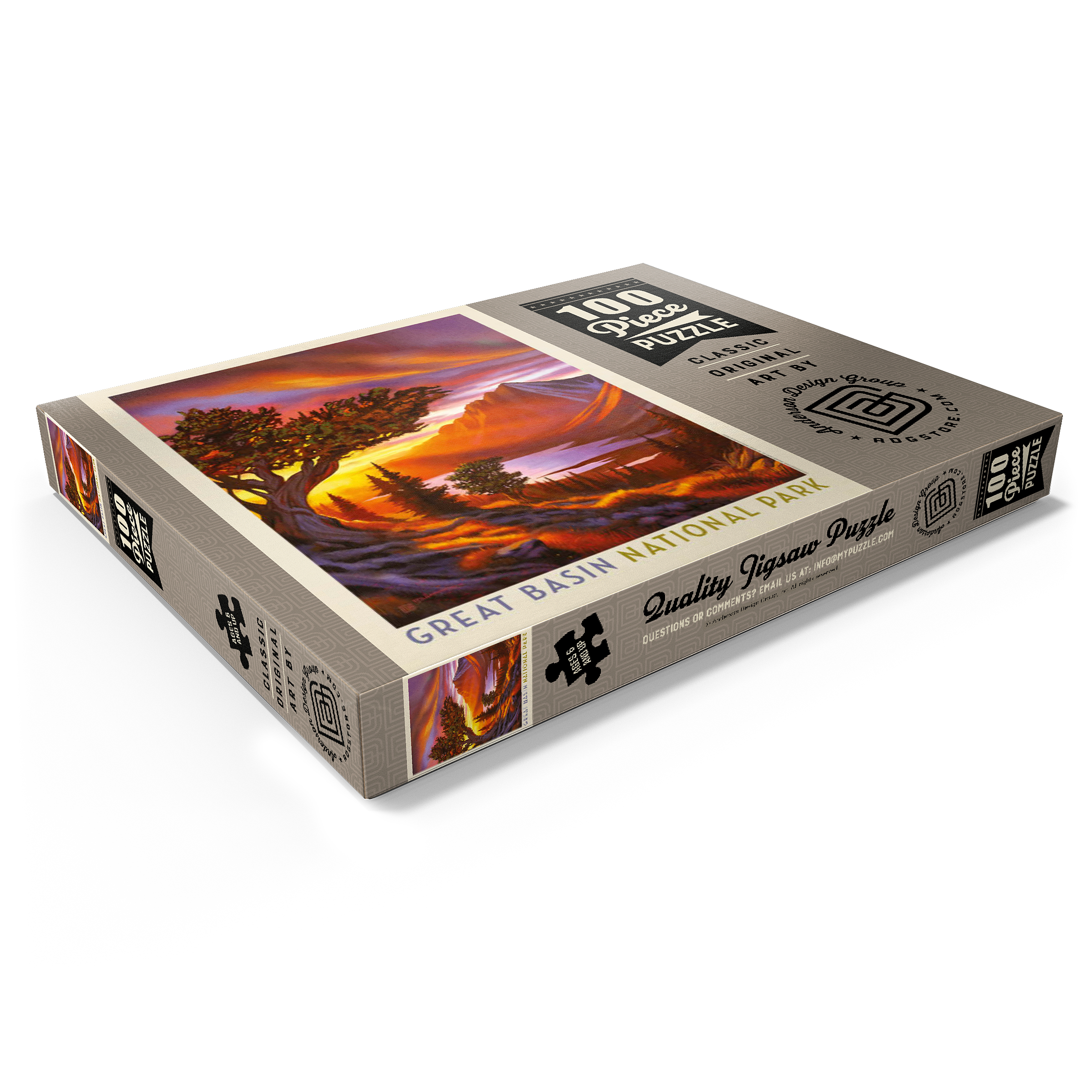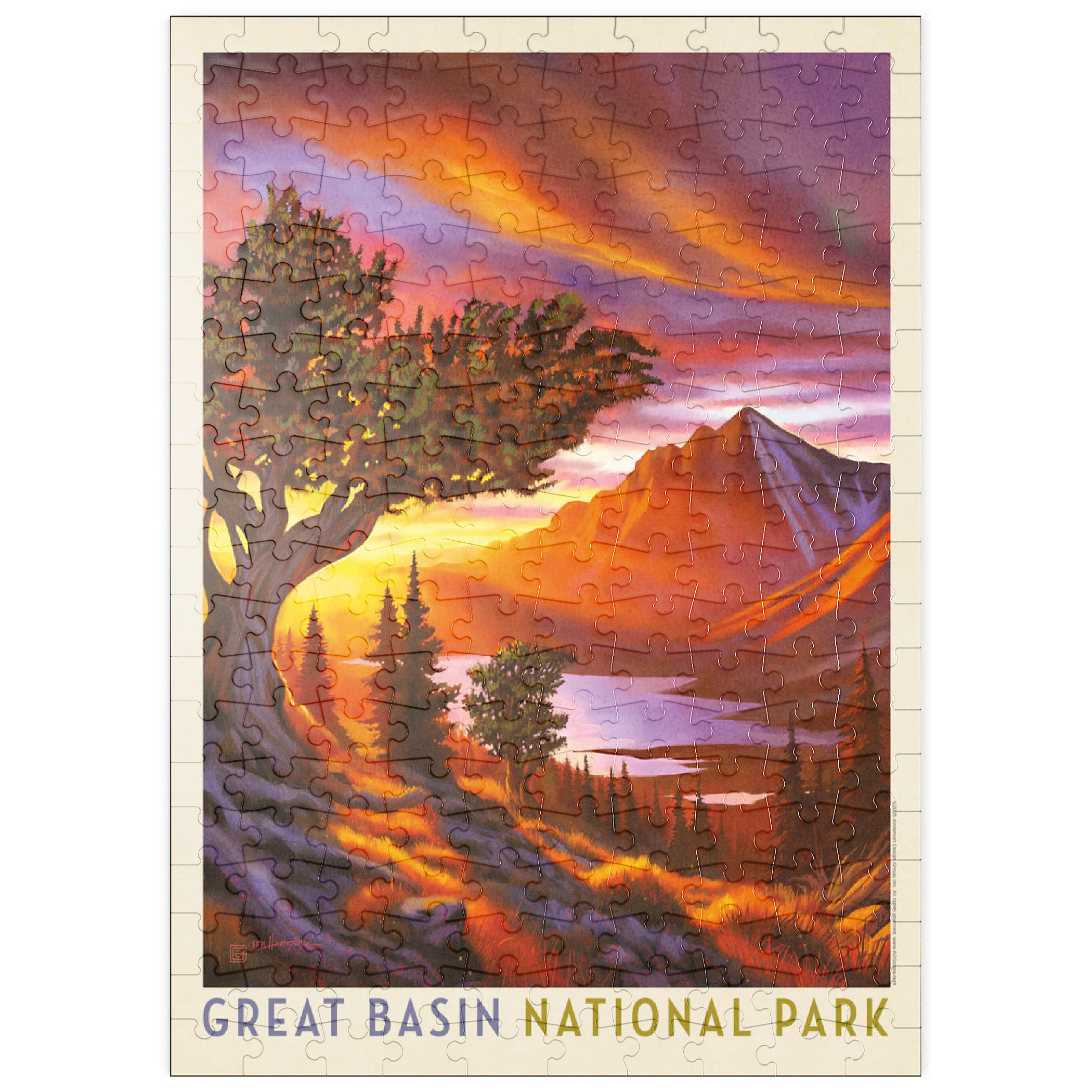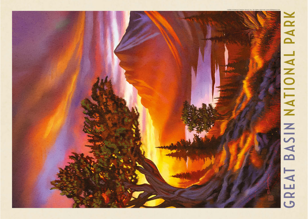 Der Great Basin National Park im Osten Nevadas ist ein verstecktes Juwel, das für seine zerklüfteten Berge, uralten Borstenkiefern und atemberaubenden Hochwüstenlandschaften bekannt ist. Diese farbenfrohe Illustration fängt die natürliche Schönheit des Parks bei Sonnenuntergang ein, wenn der Himmel in feurigen Orange-, Rot- und Violetttönen erstrahlt. Im Vordergrund erhebt sich eine verwitterte Borstenkiefer - die älteste lebende Baumart der Welt - mit Blick auf einen Bergsee, in dem sich die leuchtenden Farben des Himmels spiegeln. In der Ferne erhebt sich der Wheeler Peak, einer der höchsten Berge Nevadas, dessen schneebedeckter Gipfel mit dem warmen Licht der untergehenden Sonne kontrastiert. Die abwechslungsreiche Landschaft des Great Basin National Park reicht von Wüstentälern über üppige Wälder bis hin zu von Gletschern geformten Gipfeln und bietet unzählige Möglichkeiten zum Wandern, zur Sternenbeobachtung und zur Beobachtung von Wildtieren. Der Park beherbergt auch die faszinierenden Lehman Caves mit ihren verschlungenen Kalksteinformationen, die das ganze Jahr über Entdecker anziehen. Diese Szene verdeutlicht die friedliche Einsamkeit und die atemberaubenden Ausblicke, die den Great Basin National Park zu einem Paradies für Abenteurer und Naturliebhaber machen. Von den uralten Wäldern bis hin zu den klaren Bergseen bietet der Park eine perfekte Flucht in eine der vielfältigsten und ruhigsten Landschaften des amerikanischen Westens.