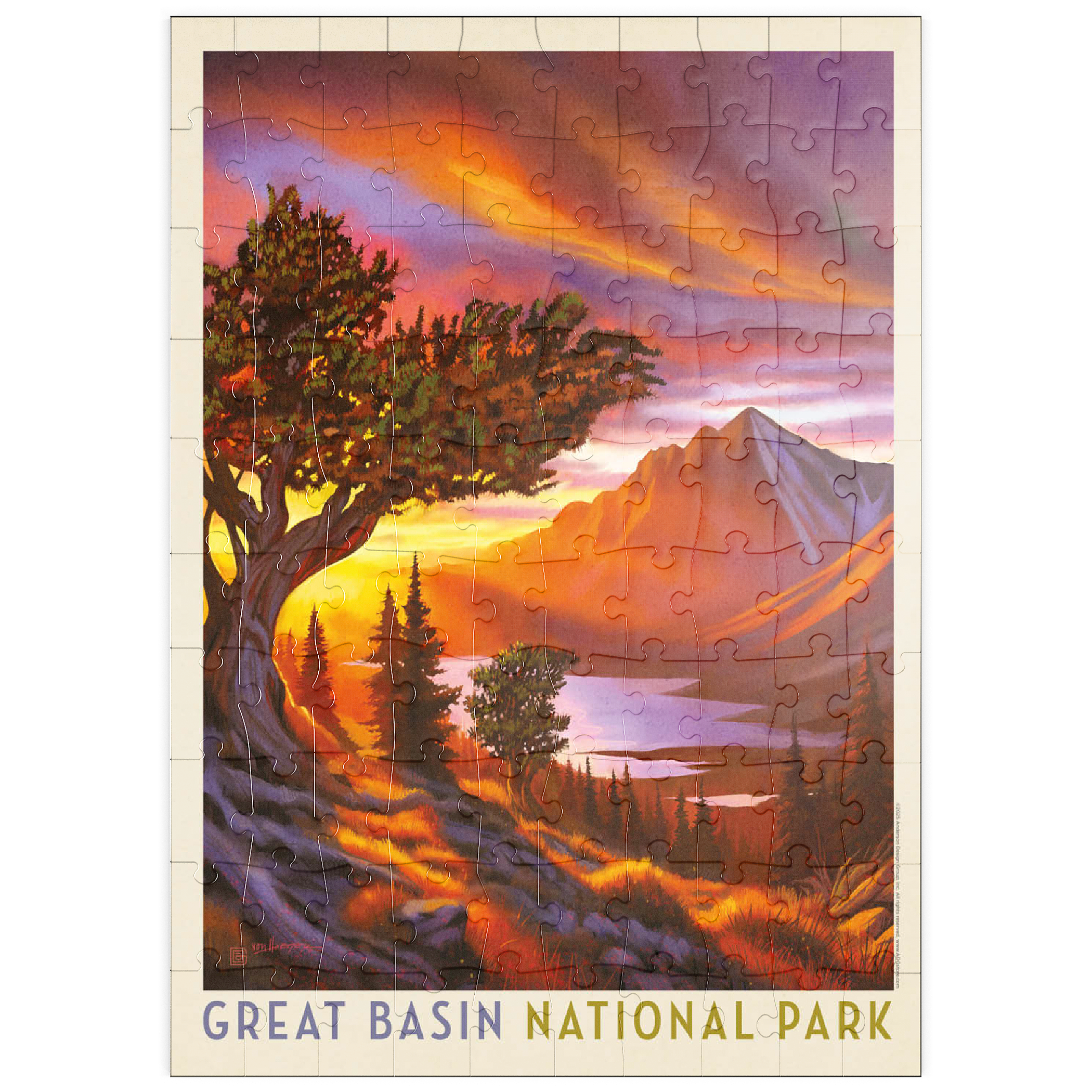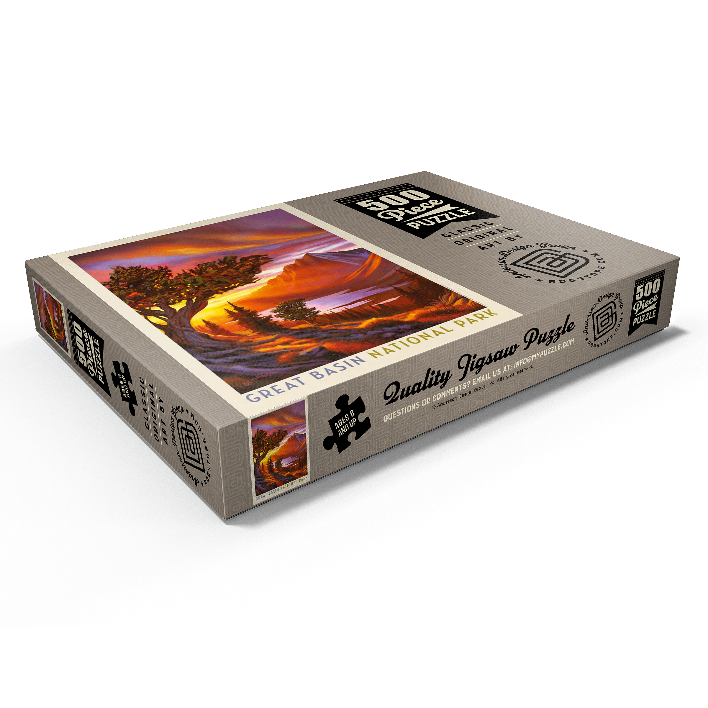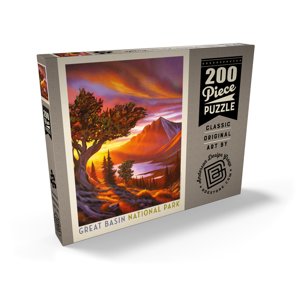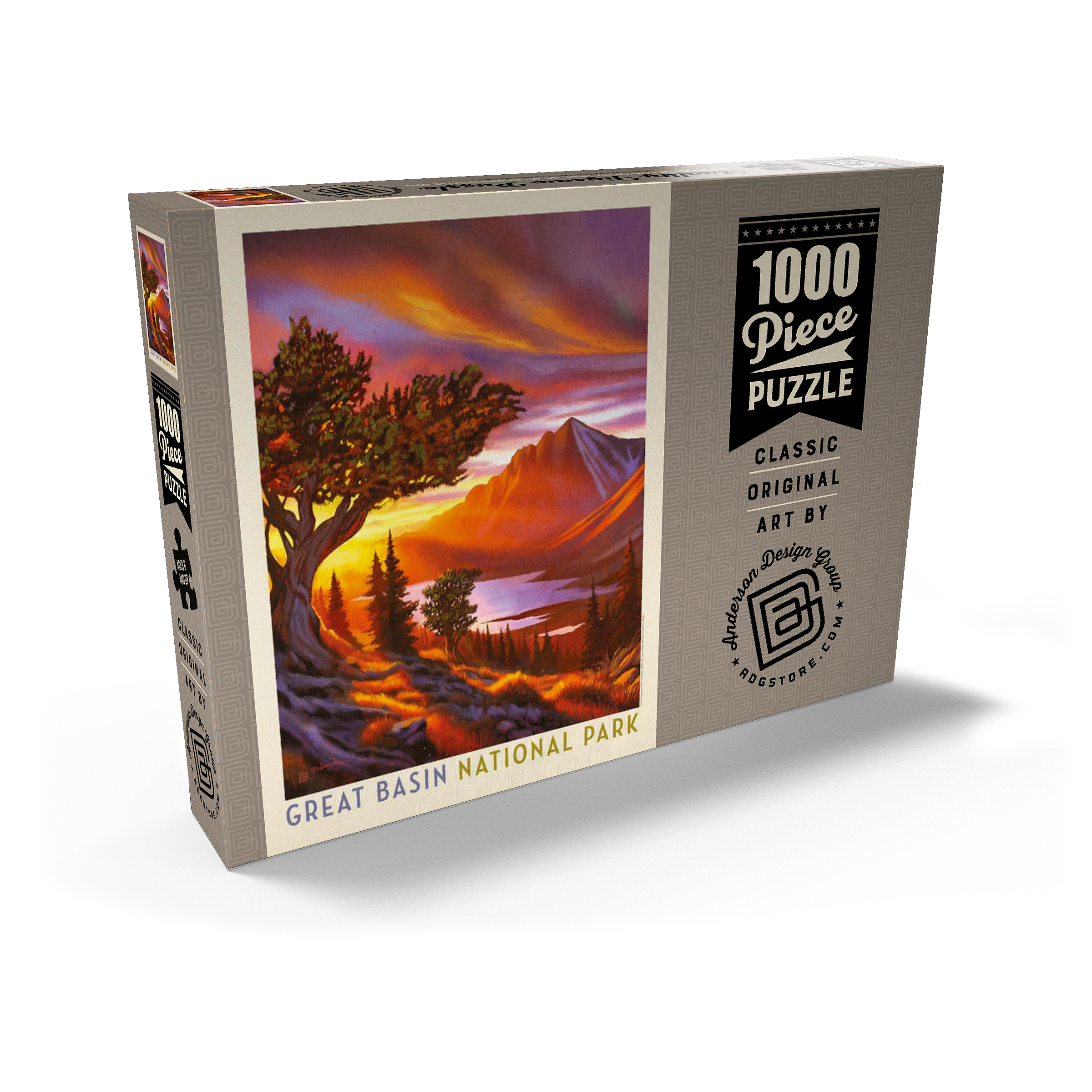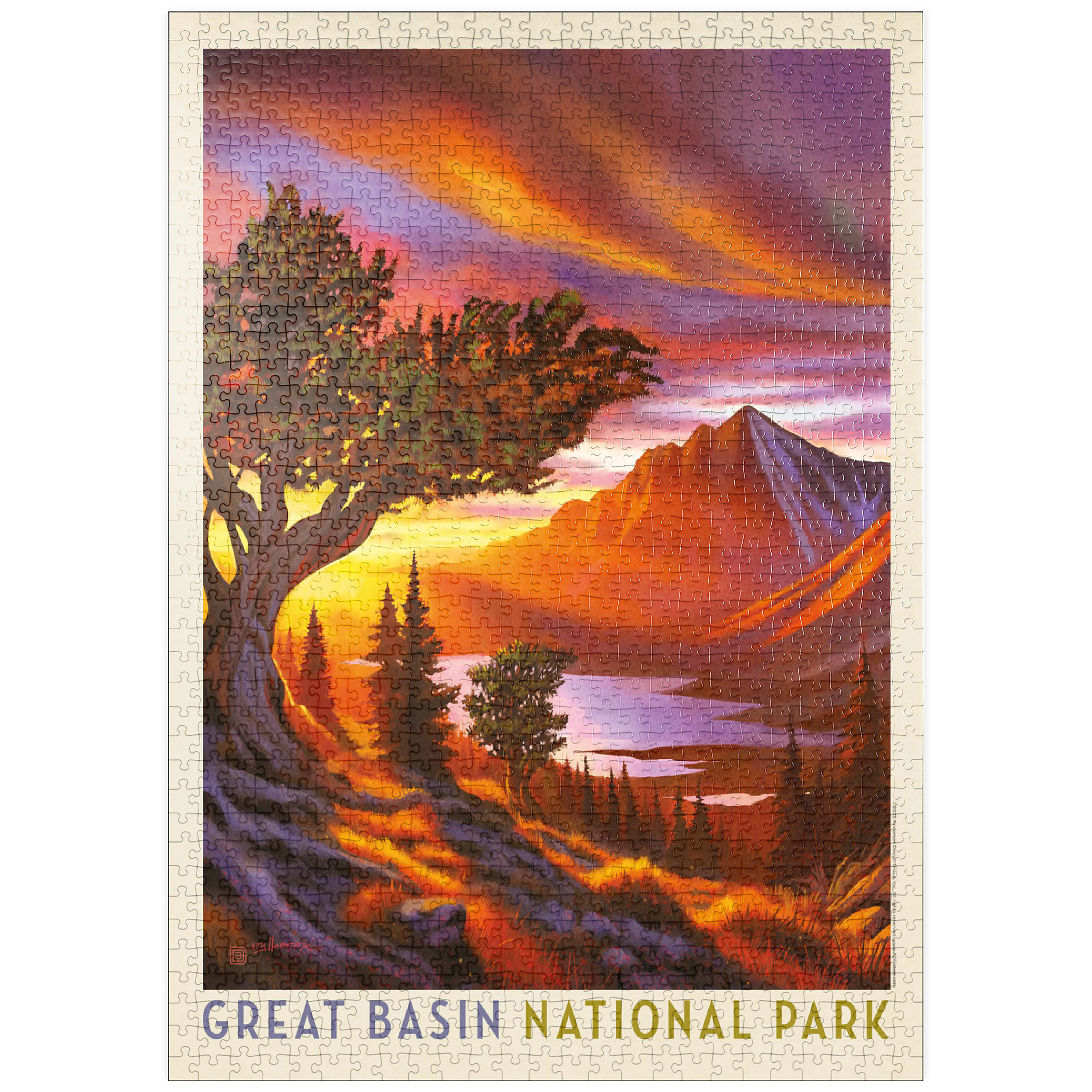 Der Great Basin National Park im Osten Nevadas ist ein verstecktes Juwel, das für seine zerklüfteten Berge, uralten Borstenkiefern und atemberaubenden Hochwüstenlandschaften bekannt ist. Diese farbenfrohe Illustration fängt die natürliche Schönheit des Parks bei Sonnenuntergang ein, wenn der Himmel in feurigen Orange-, Rot- und Violetttönen erstrahlt. Im Vordergrund erhebt sich eine verwitterte Borstenkiefer - die älteste lebende Baumart der Welt - mit Blick auf einen Bergsee, in dem sich die leuchtenden Farben des Himmels spiegeln. In der Ferne erhebt sich der Wheeler Peak, einer der höchsten Berge Nevadas, dessen schneebedeckter Gipfel mit dem warmen Licht der untergehenden Sonne kontrastiert. Die abwechslungsreiche Landschaft des Great Basin National Park reicht von Wüstentälern über üppige Wälder bis hin zu von Gletschern geformten Gipfeln und bietet unzählige Möglichkeiten zum Wandern, zur Sternenbeobachtung und zur Beobachtung von Wildtieren. Der Park beherbergt auch die faszinierenden Lehman Caves mit ihren verschlungenen Kalksteinformationen, die das ganze Jahr über Entdecker anziehen. Diese Szene verdeutlicht die friedliche Einsamkeit und die atemberaubenden Ausblicke, die den Great Basin National Park zu einem Paradies für Abenteurer und Naturliebhaber machen. Von den uralten Wäldern bis hin zu den klaren Bergseen bietet der Park eine perfekte Flucht in eine der vielfältigsten und ruhigsten Landschaften des amerikanischen Westens.