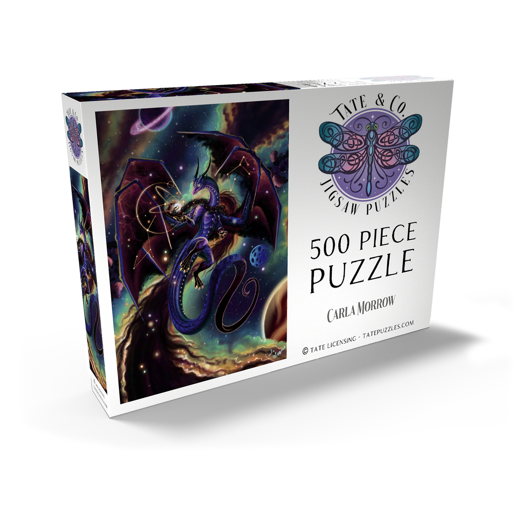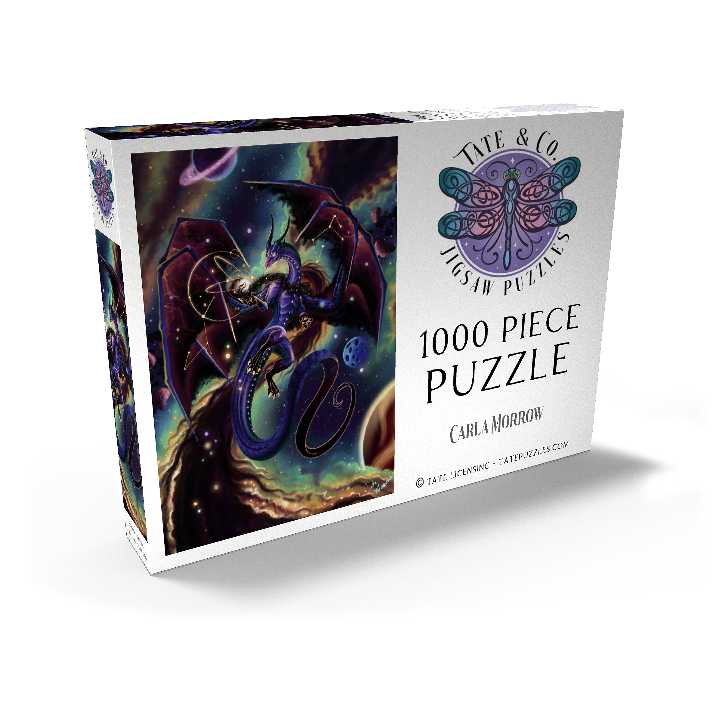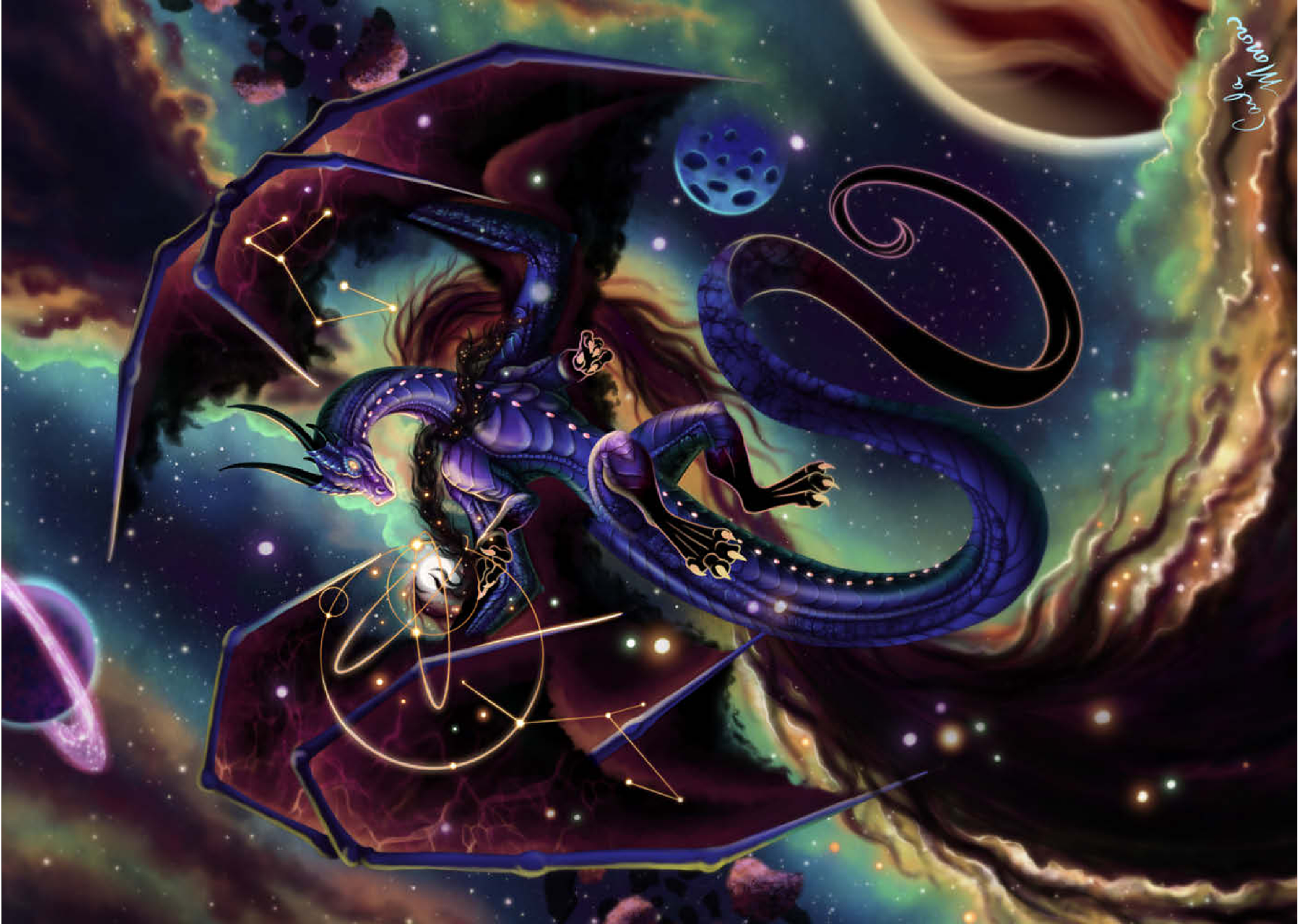 Dieses bezaubernde Gemälde von Carla Morrow zeigt einen himmlischen Drachen, der in satten Violett- und tiefen Blautönen getaucht ist und durch eine leuchtende, sternenübersäte Galaxie schwebt. Der elegante, schlangenartige Drache hält einen leuchtenden Stern sanft zwischen seinen Klauen, dessen Licht die Dunkelheit verschlingt. Seine Flügel schimmern in den schillernden Farben einer Nebelwolke und reflektieren die umgebenden Wirbel aus Sternenstaub und kosmischem Licht. Der Blick des Wesens ist ruhig und weise und vermittelt ein Gefühl von zeitloser Bewahrung der Geheimnisse des Universums. Ätherisch und traumhaft fängt dieses Werk die Wunder des Weltraums und die mythische Kraft der Drachen ein und ist damit ein perfektes Herzstück für alle, die von der Magie der Sterne fasziniert sind.