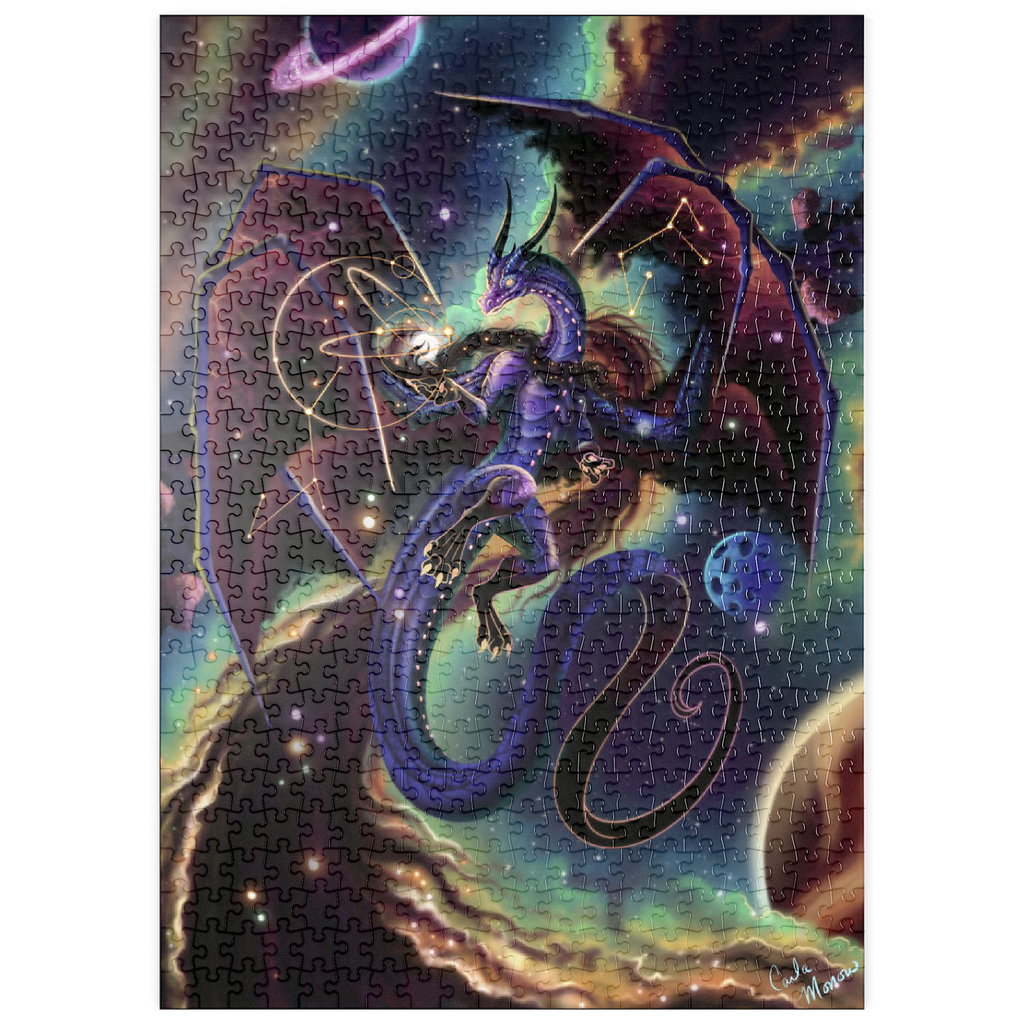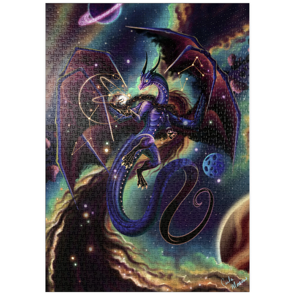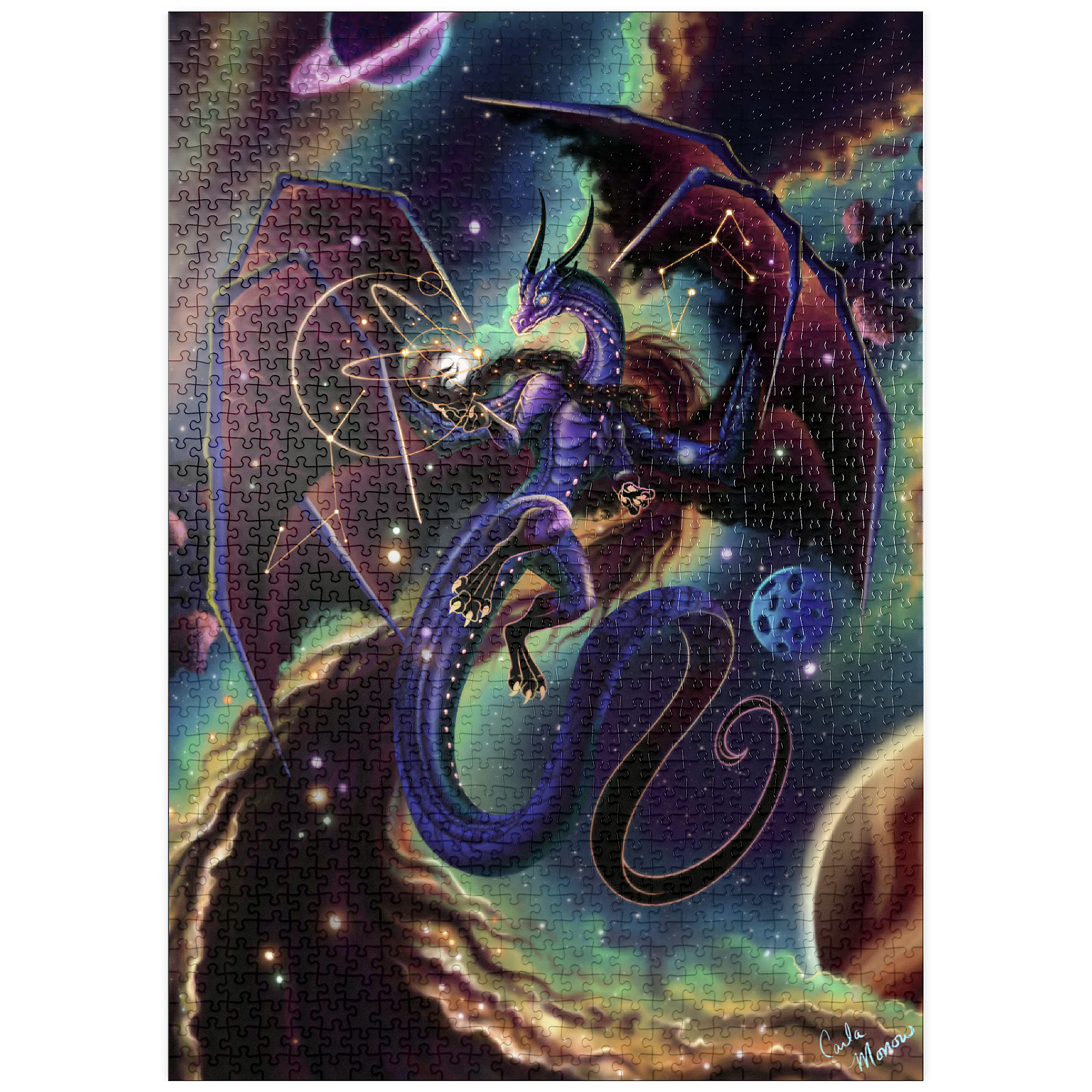Dieses bezaubernde Gemälde von Carla Morrow zeigt einen himmlischen Drachen, der in satten Violett- und tiefen Blautönen getaucht ist und durch eine leuchtende, sternenübersäte Galaxie schwebt. Der elegante, schlangenartige Drache hält einen leuchtenden Stern sanft zwischen seinen Klauen, dessen Licht die Dunkelheit verschlingt. Seine Flügel schimmern in den schillernden Farben einer Nebelwolke und reflektieren die umgebenden Wirbel aus Sternenstaub und kosmischem Licht. Der Blick des Wesens ist ruhig und weise und vermittelt ein Gefühl von zeitloser Bewahrung der Geheimnisse des Universums. Ätherisch und traumhaft fängt dieses Werk die Wunder des Weltraums und die mythische Kraft der Drachen ein und ist damit ein perfektes Herzstück für alle, die von der Magie der Sterne fasziniert sind.