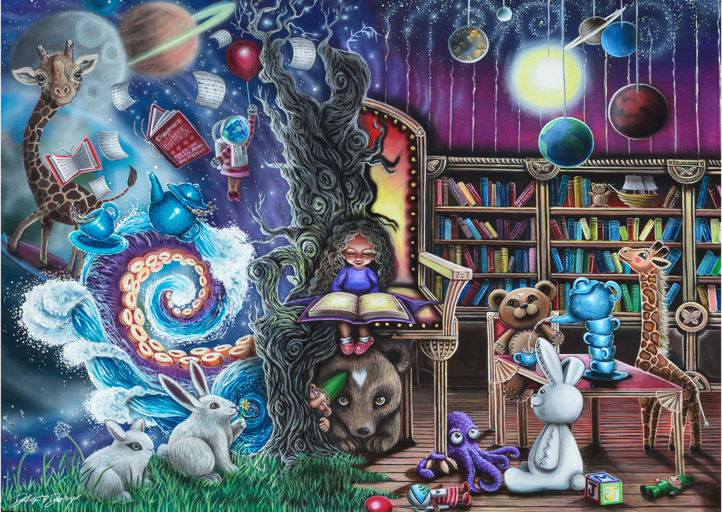 Gemälde von Dakota Daetwiler, das ein kleines Mädchen zeigt, das in seinem Zimmer sitzt und ein Buch liest. Auf der einen Seite ist die reale Welt, auf der anderen Seite seine Fantasiewelt, in der alles zum Leben erwacht ist.