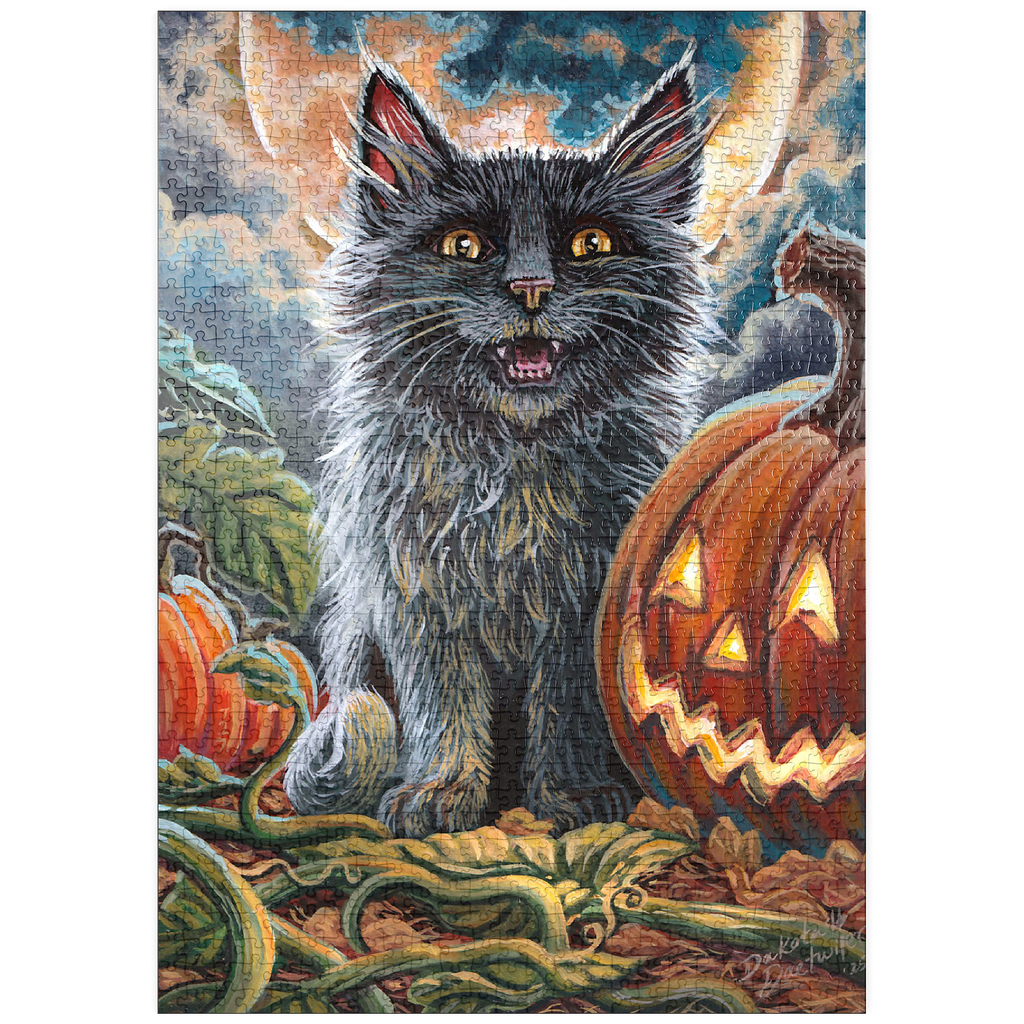Gemälde von Dakota Daetwiler, das ein lächelndes Halloween-Kätzchen mit einem Vollmond hinter seinem Kopf zeigt. Eine Kürbislaterne leuchtet neben dem gruseligen schwarzen Kätzchen in einem Kürbisfeld.