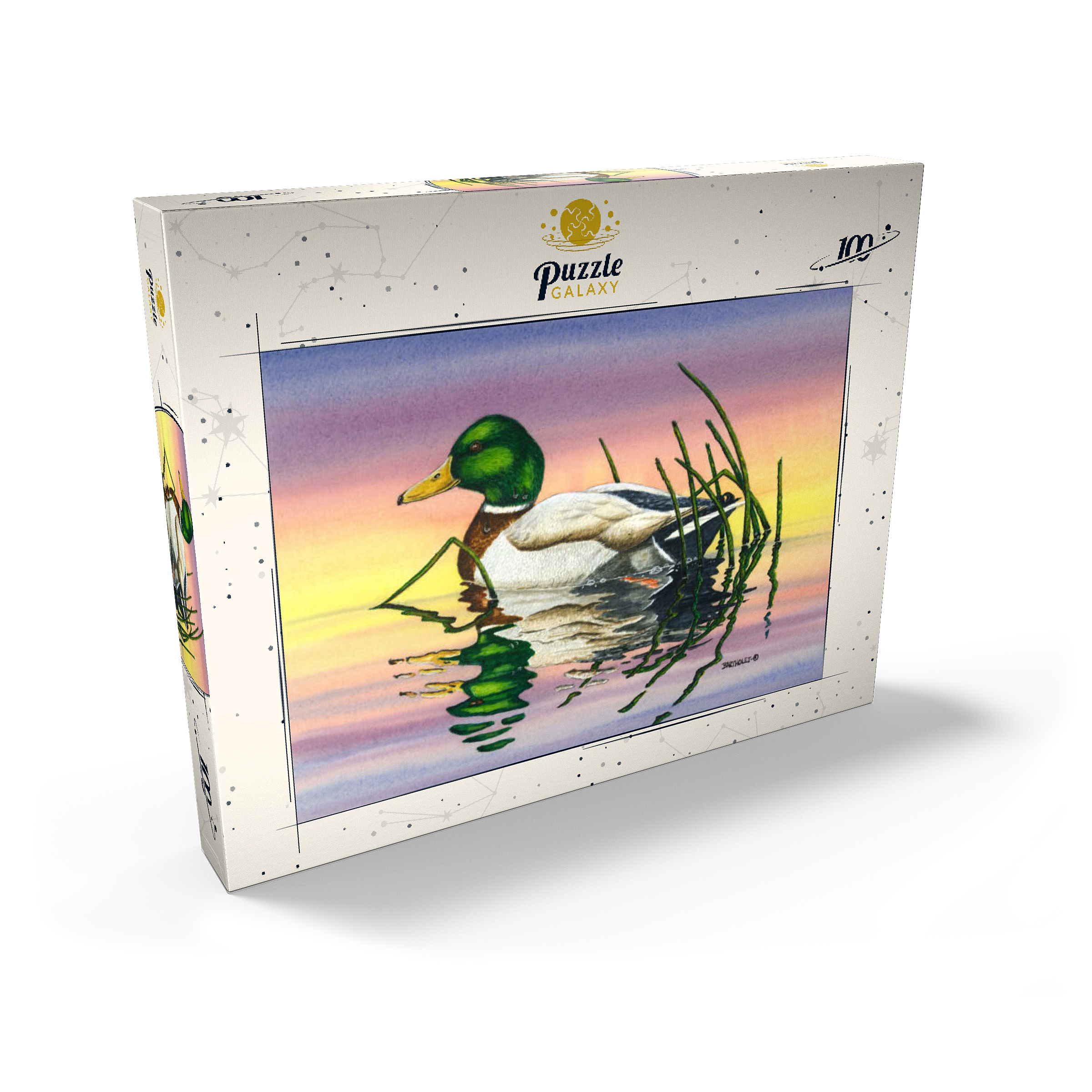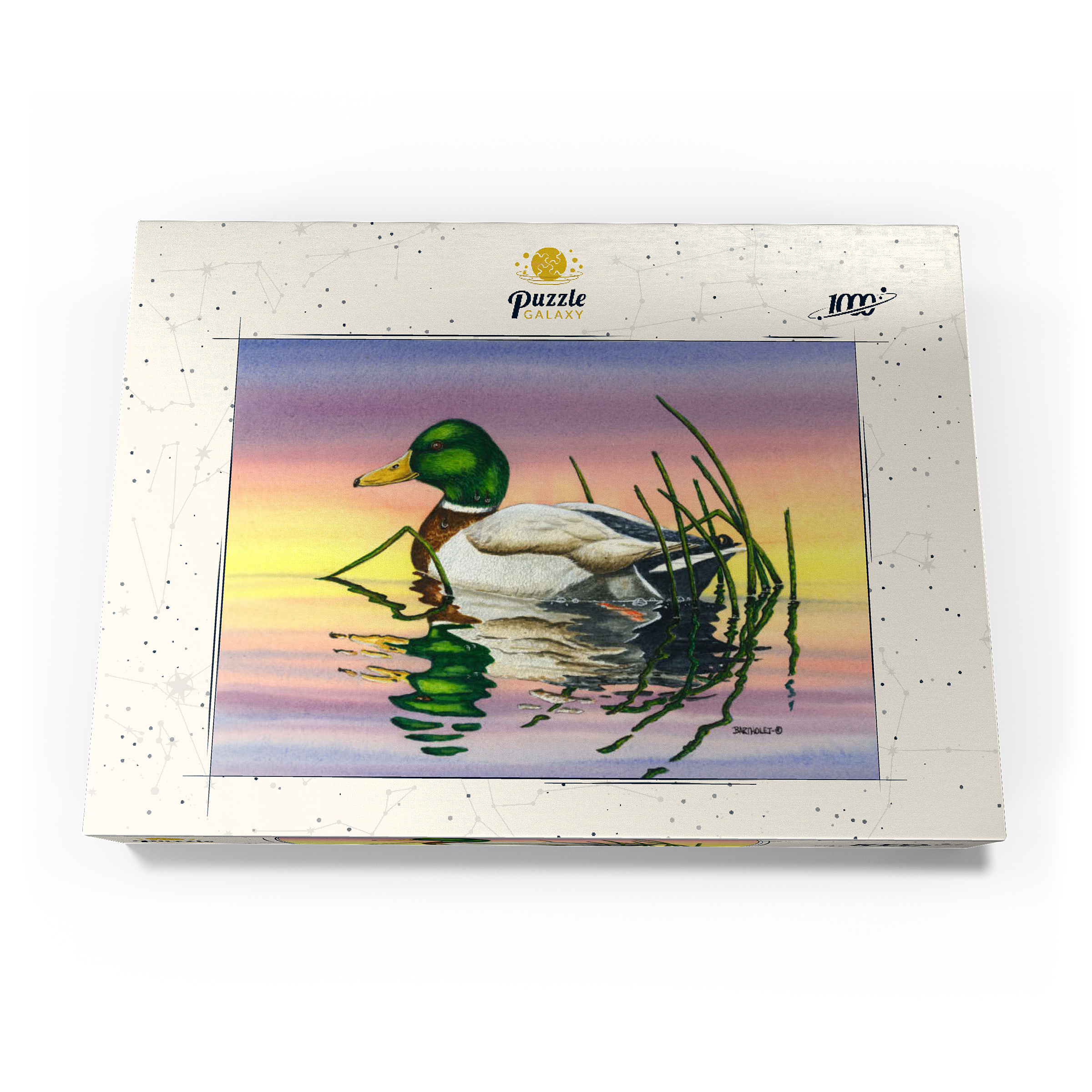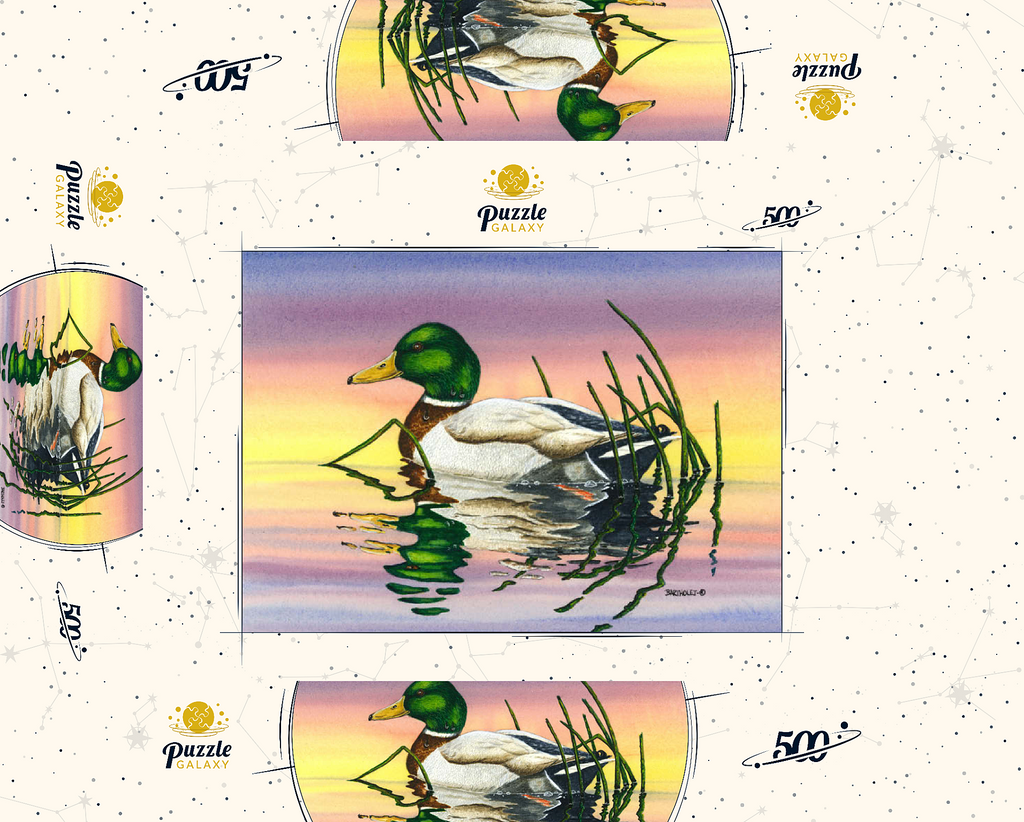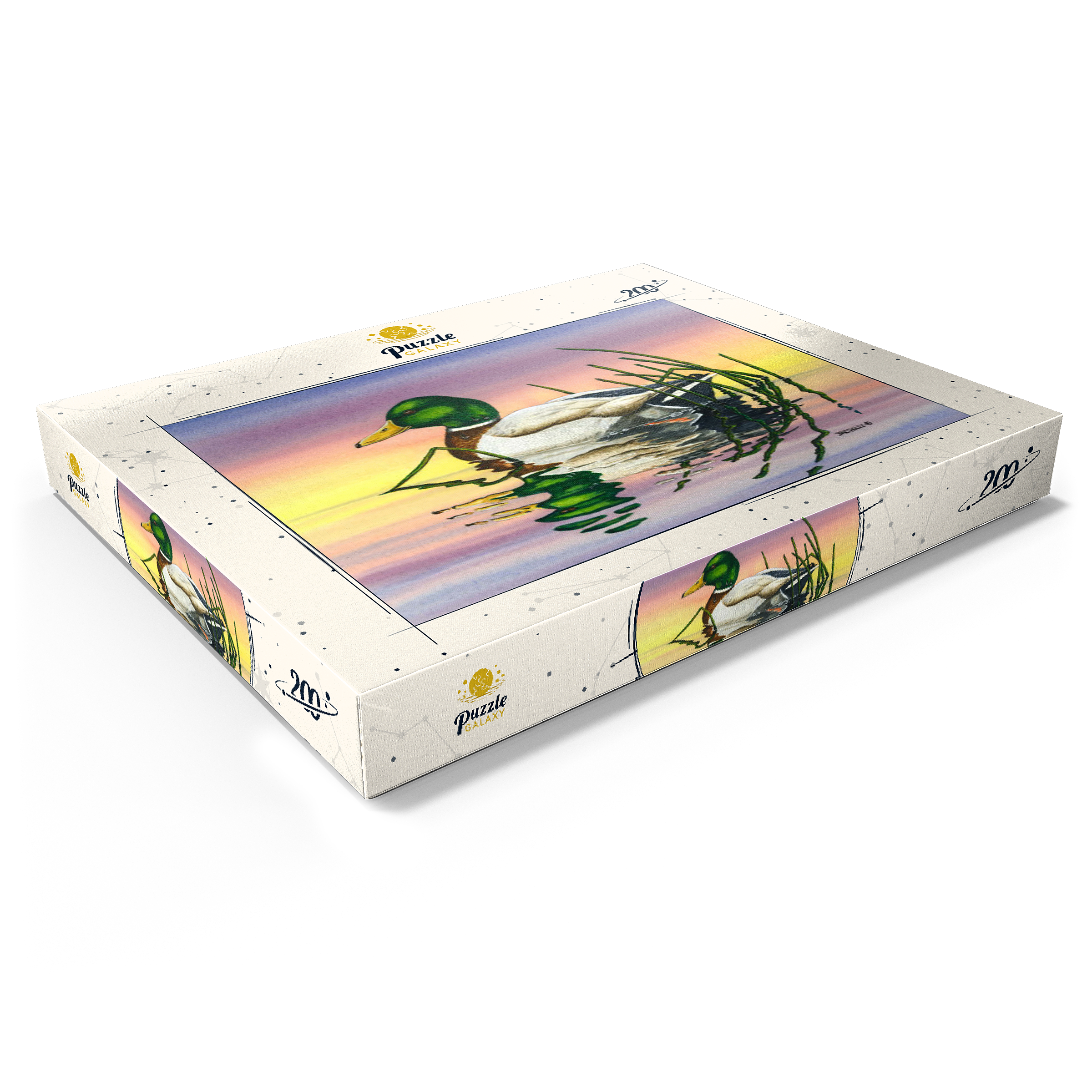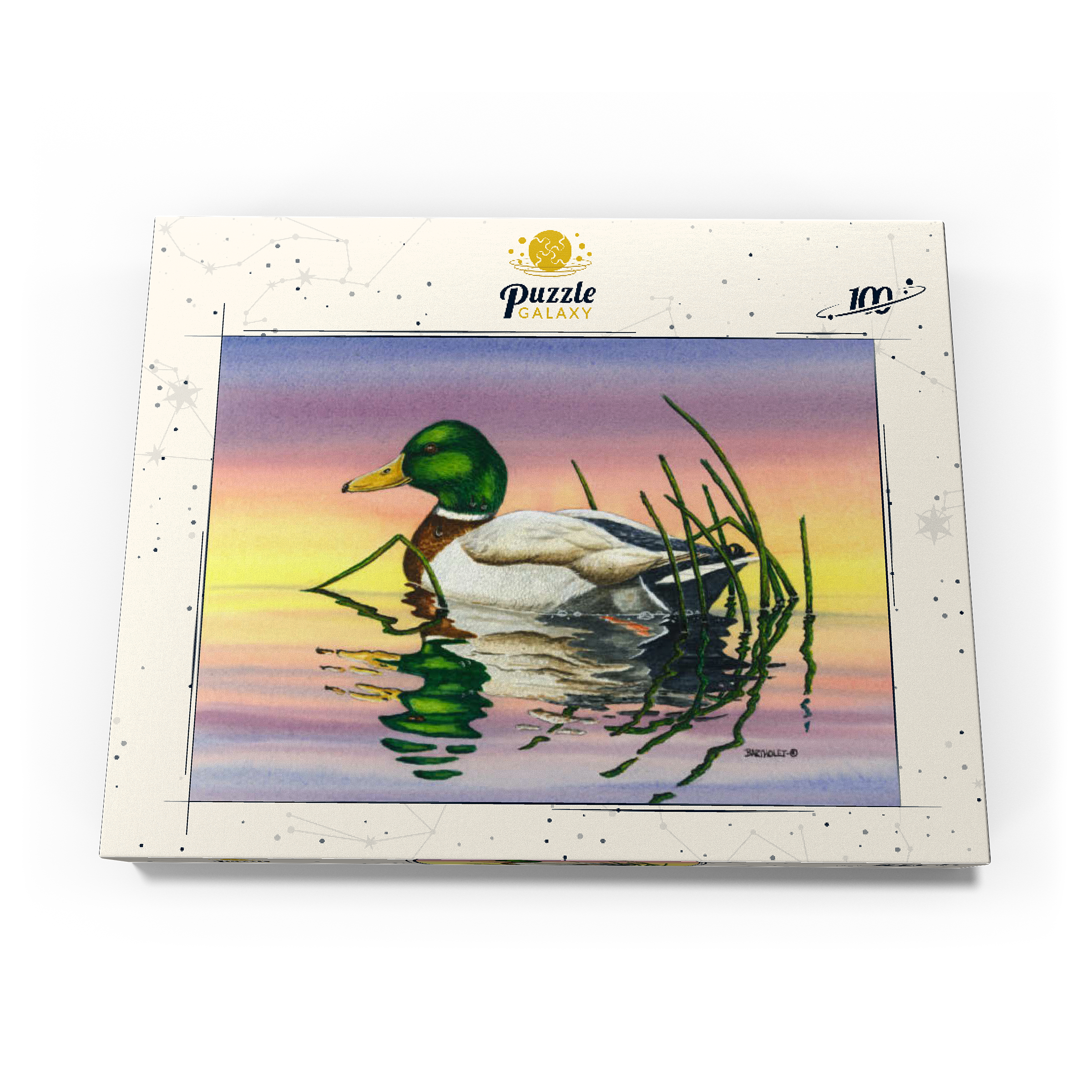 Eine ruhige Darstellung eines Stockentenerpels, der anmutig zwischen Schilf in ruhigem Wasser während eines lebhaften Sonnenuntergangs schwimmt. Der auffallend grüne Kopf und der gelbe Schnabel der Ente bilden einen schönen Kontrast zu den sanften Farbverläufen des Himmels in Rosa-, Orange- und Violetttönen, die sich im kräuselnden Wasser widerspiegeln. Das detaillierte Schilf verleiht der friedlichen Komposition Tiefe und unterstreicht die Ruhe eines ruhigen Abends auf dem Wasser.
