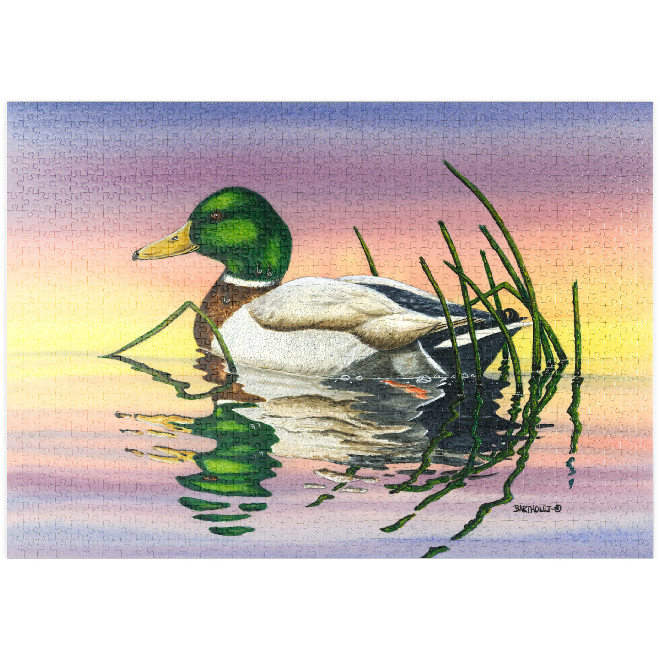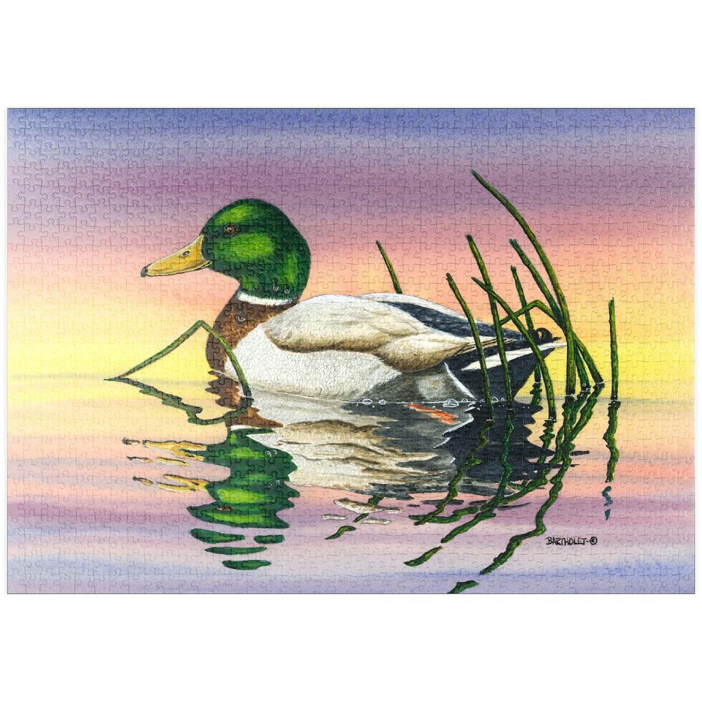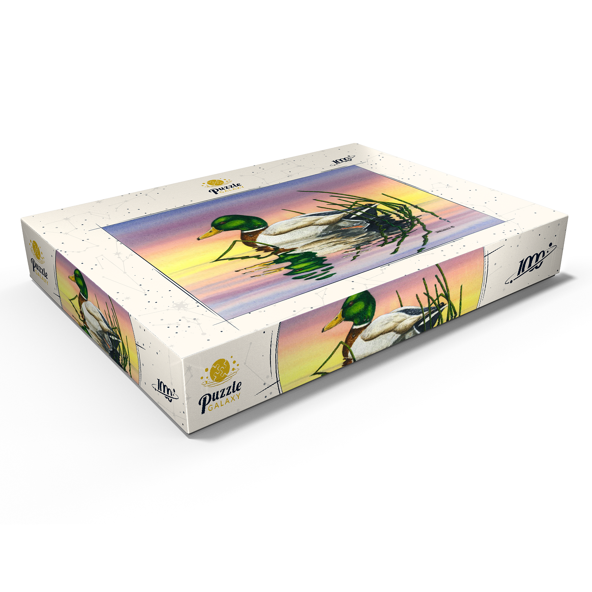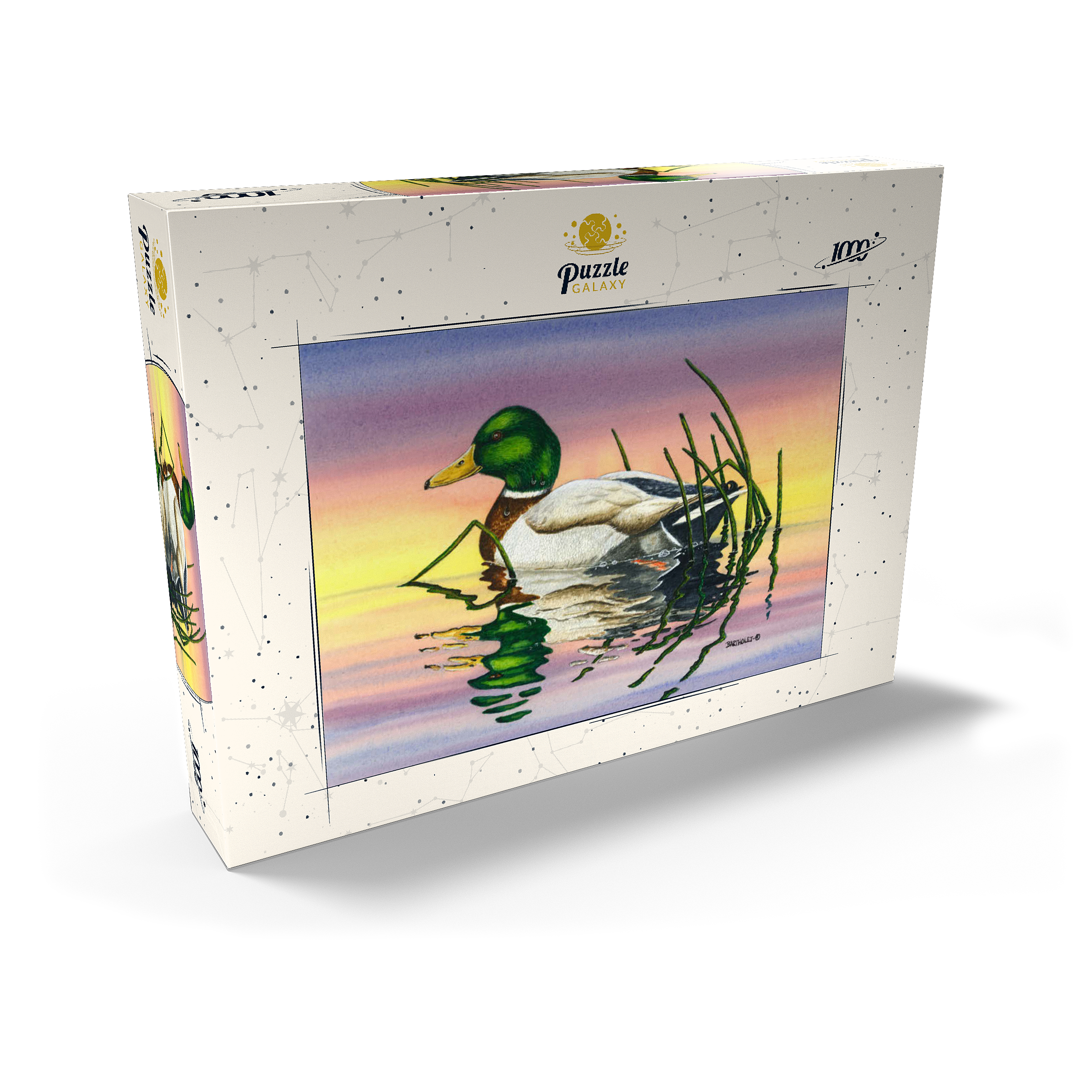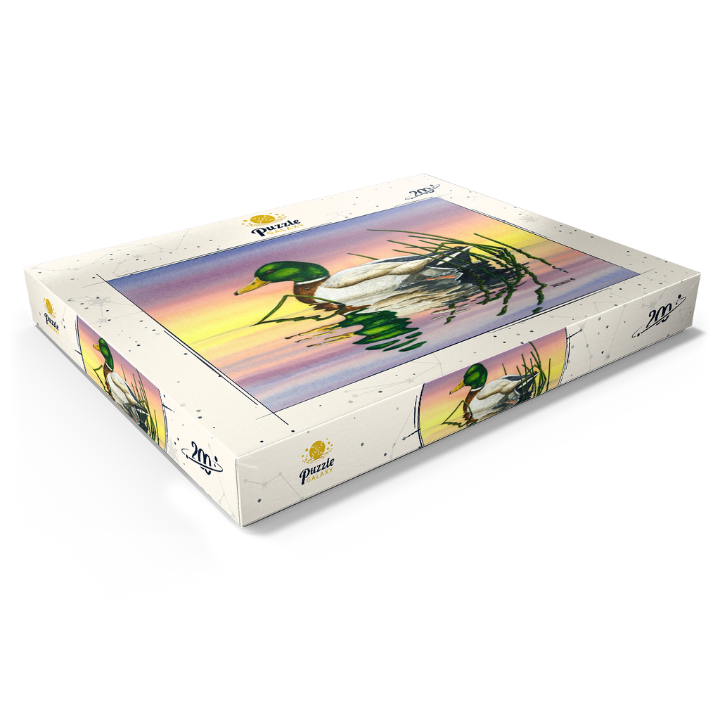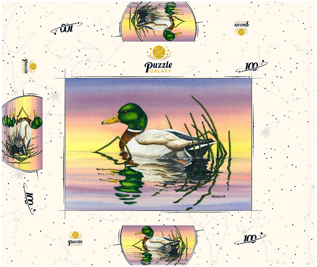 Eine ruhige Darstellung eines Stockentenerpels, der anmutig zwischen Schilf in ruhigem Wasser während eines lebhaften Sonnenuntergangs schwimmt. Der auffallend grüne Kopf und der gelbe Schnabel der Ente bilden einen schönen Kontrast zu den sanften Farbverläufen des Himmels in Rosa-, Orange- und Violetttönen, die sich im kräuselnden Wasser widerspiegeln. Das detaillierte Schilf verleiht der friedlichen Komposition Tiefe und unterstreicht die Ruhe eines ruhigen Abends auf dem Wasser.