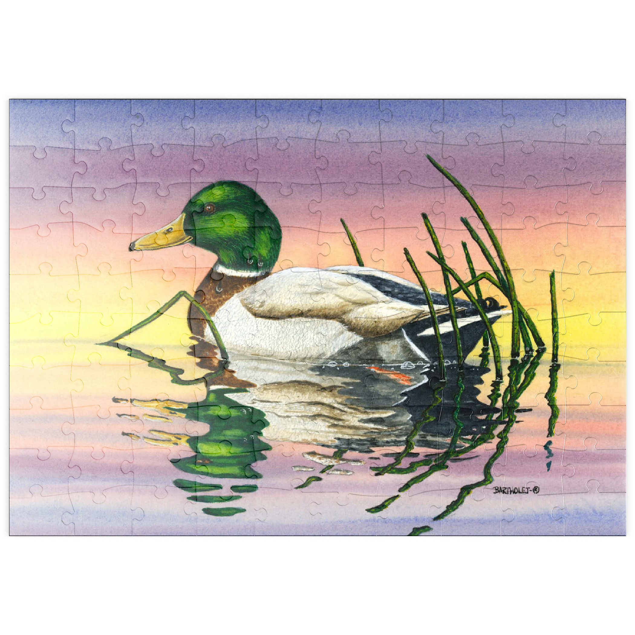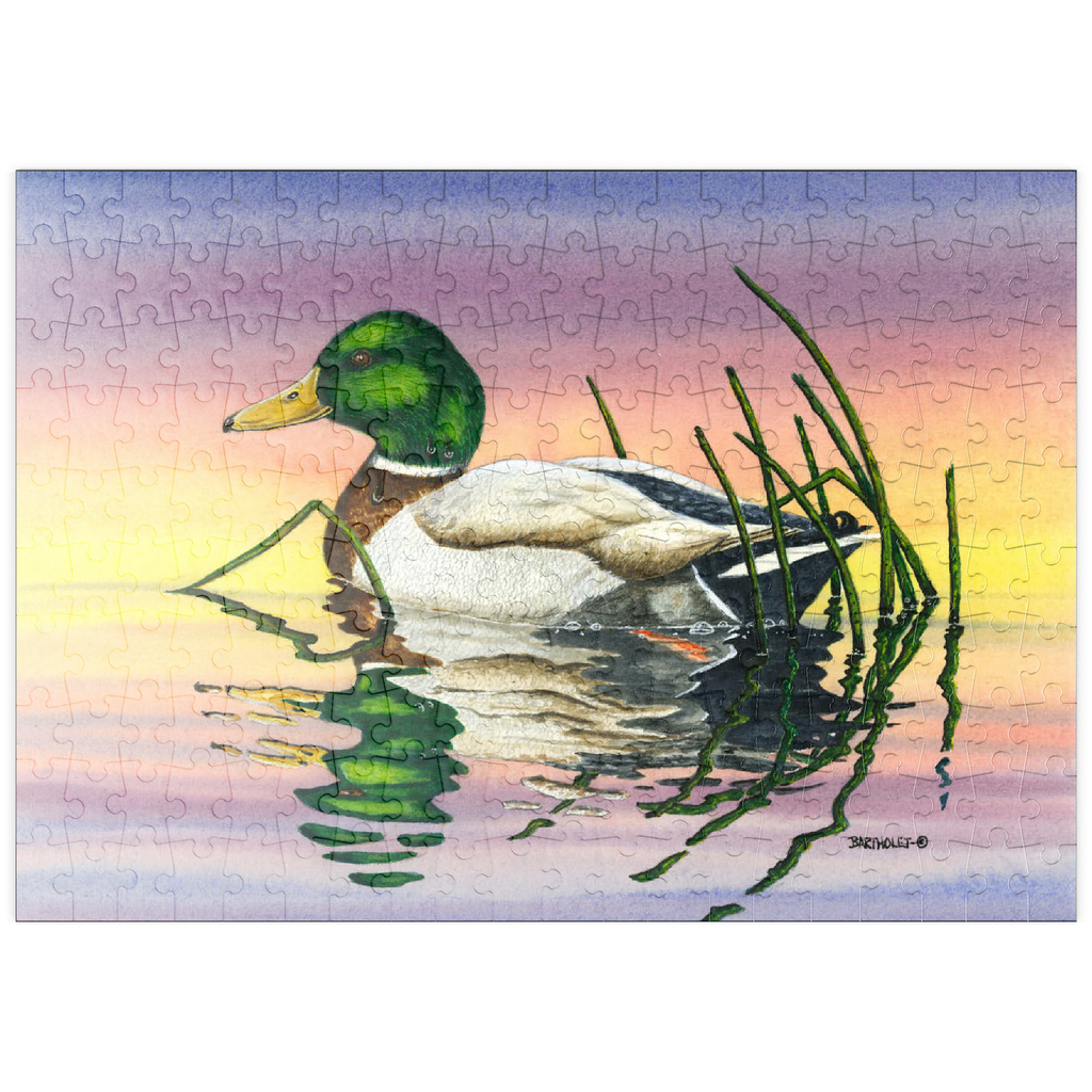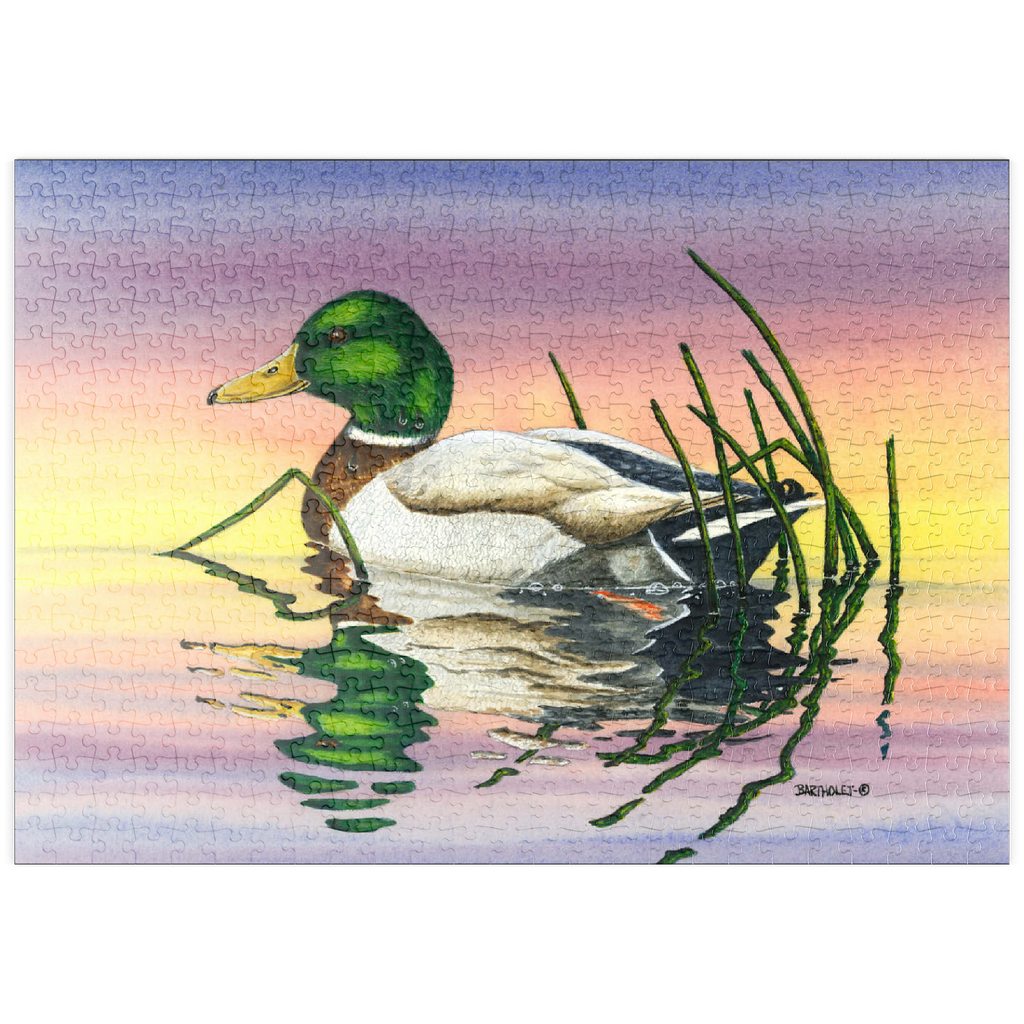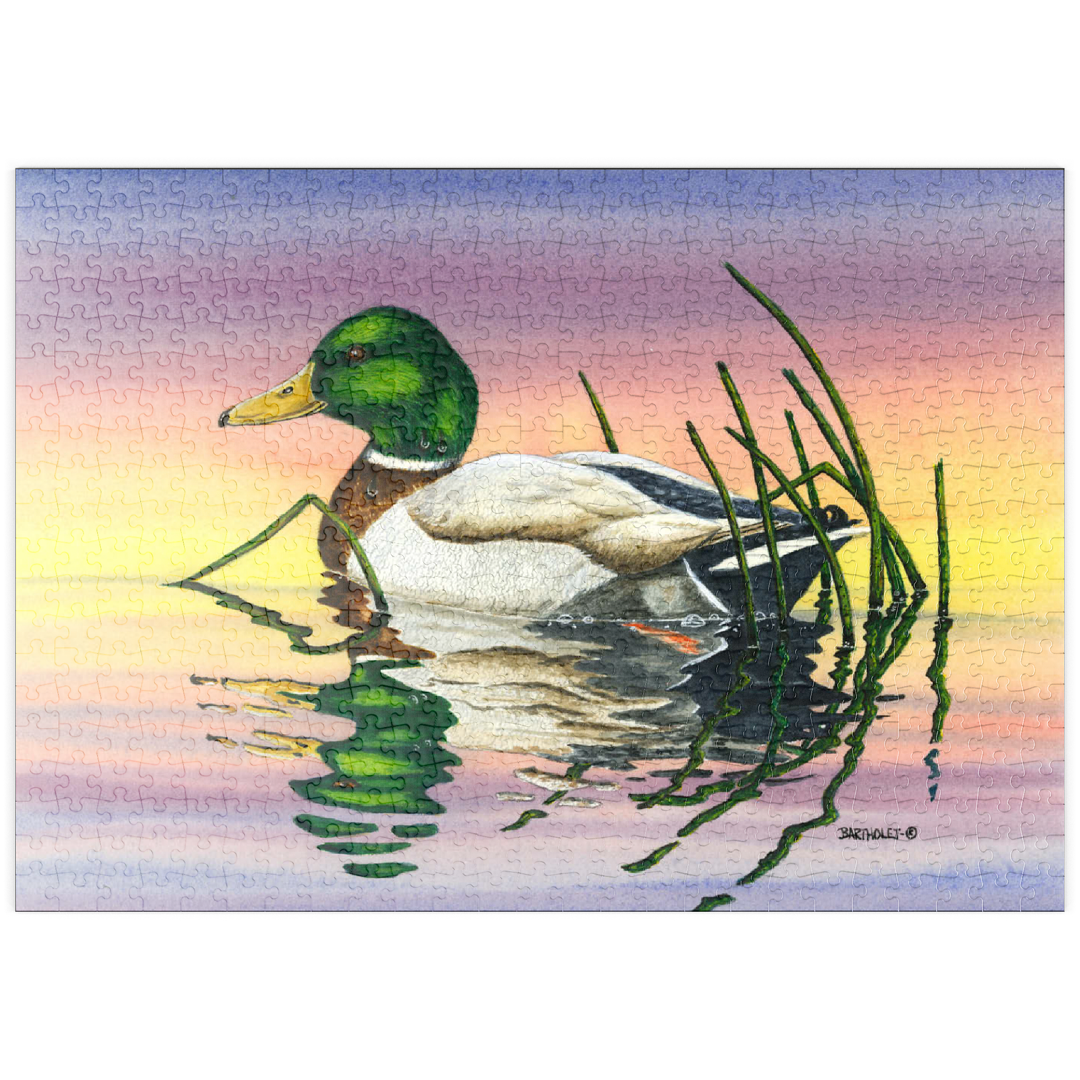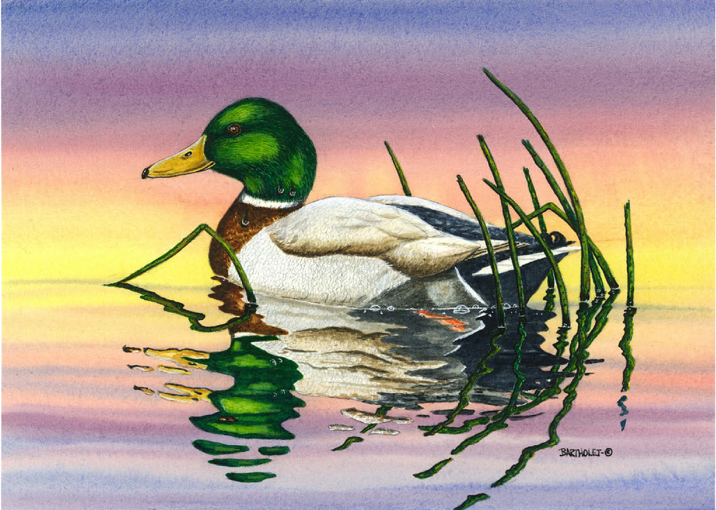 Eine ruhige Darstellung eines Stockentenerpels, der anmutig zwischen Schilf in ruhigem Wasser während eines lebhaften Sonnenuntergangs schwimmt. Der auffallend grüne Kopf und der gelbe Schnabel der Ente bilden einen schönen Kontrast zu den sanften Farbverläufen des Himmels in Rosa-, Orange- und Violetttönen, die sich im kräuselnden Wasser widerspiegeln. Das detaillierte Schilf verleiht der friedlichen Komposition Tiefe und unterstreicht die Ruhe eines ruhigen Abends auf dem Wasser.