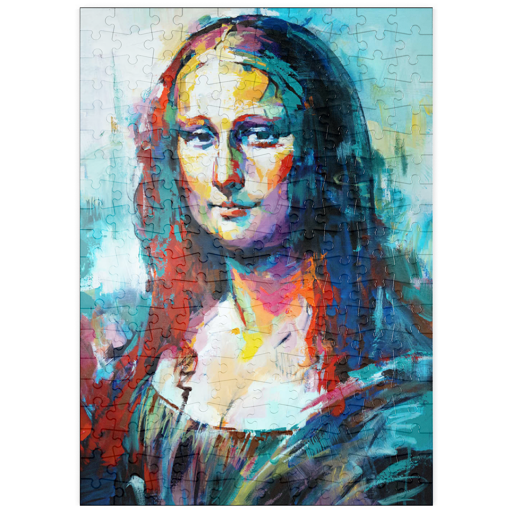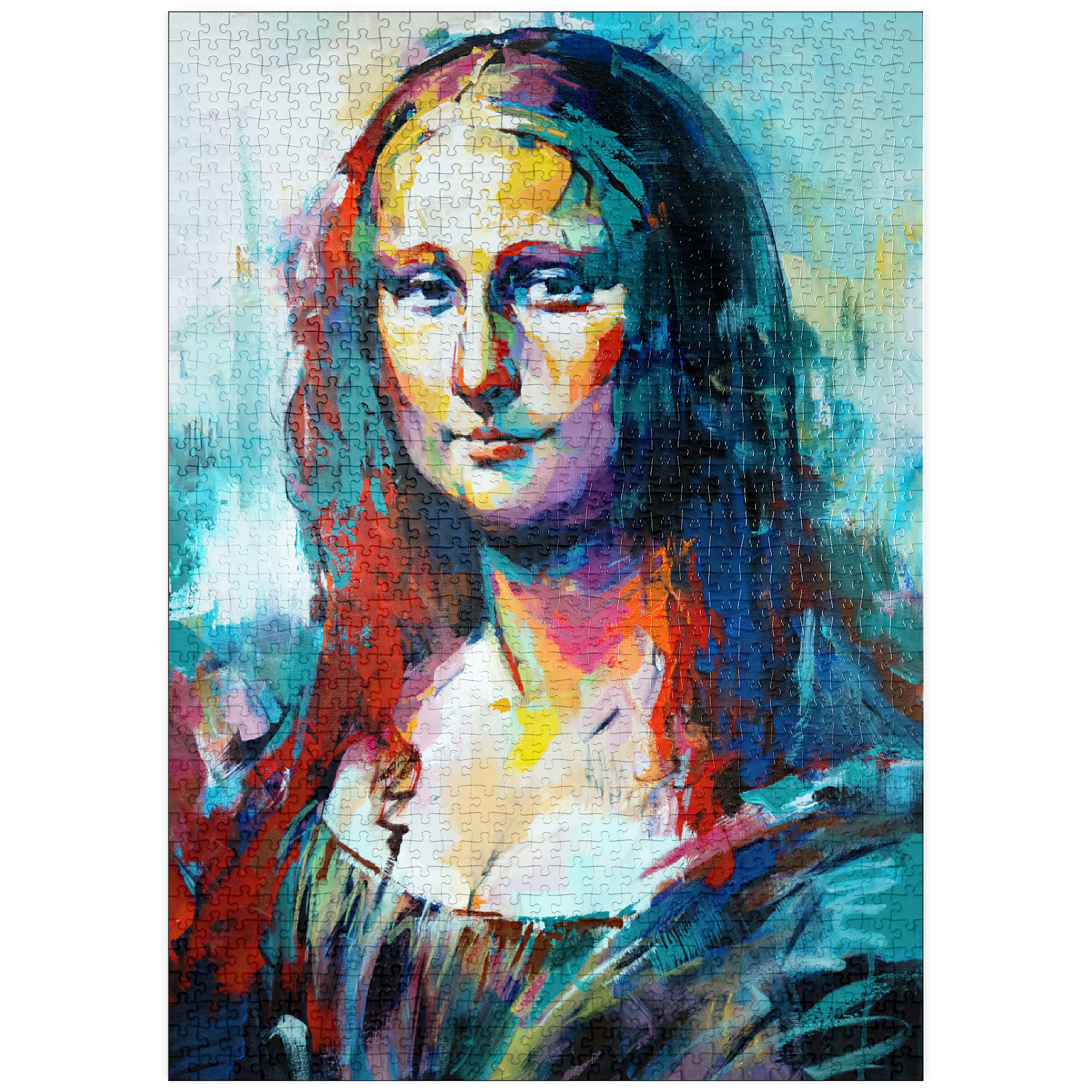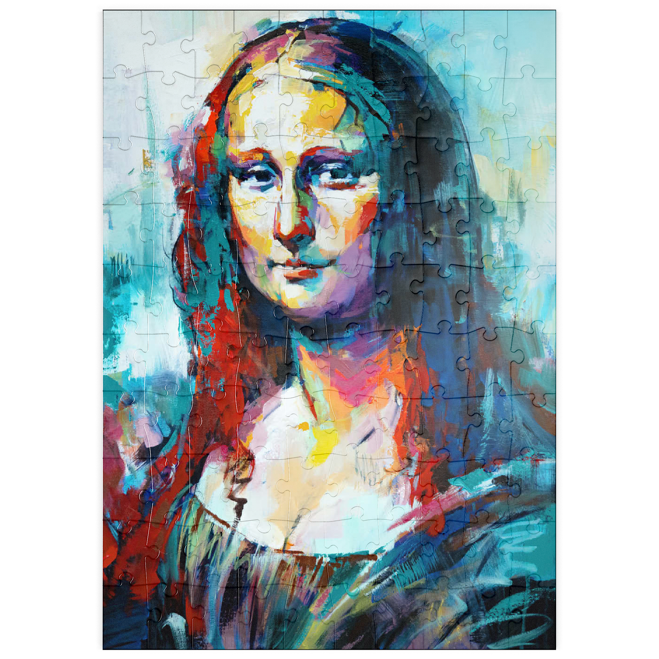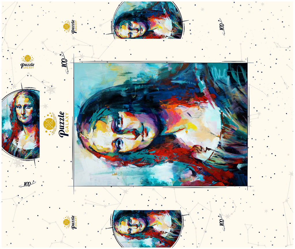 Dieses auffällige Porträt interpretiert ein klassisches Motiv in einem kühnen, abstrakten expressionistischen Stil neu, der sich durch lebendige Pinselstriche und kräftige, vielschichtige Farben auszeichnet. Das Gesicht der Figur verschmilzt warme Farbtöne wie Purpur, Gold und Orange mit kühlen Blau-, Türkis- und Violetttönen und schafft so einen starken emotionalen Kontrast und eine moderne Neuinterpretation. Der Hintergrund ist locker gemalt, was den geheimnisvollen Ausdruck des Motivs unterstreicht und gleichzeitig ein Gefühl von künstlerischer Freiheit und Bewegung vermittelt. Dieser zeitgenössische Ansatz fängt sowohl Intensität als auch Schönheit ein und ist ideal für Kunstliebhaber, die moderne Adaptionen zeitloser Figuren schätzen. Die ausdrucksstarke Farbpalette und die strukturierte Pinselführung machen dieses Werk zu einem herausragenden Akzent für jedes kunstorientierte Interieur.
