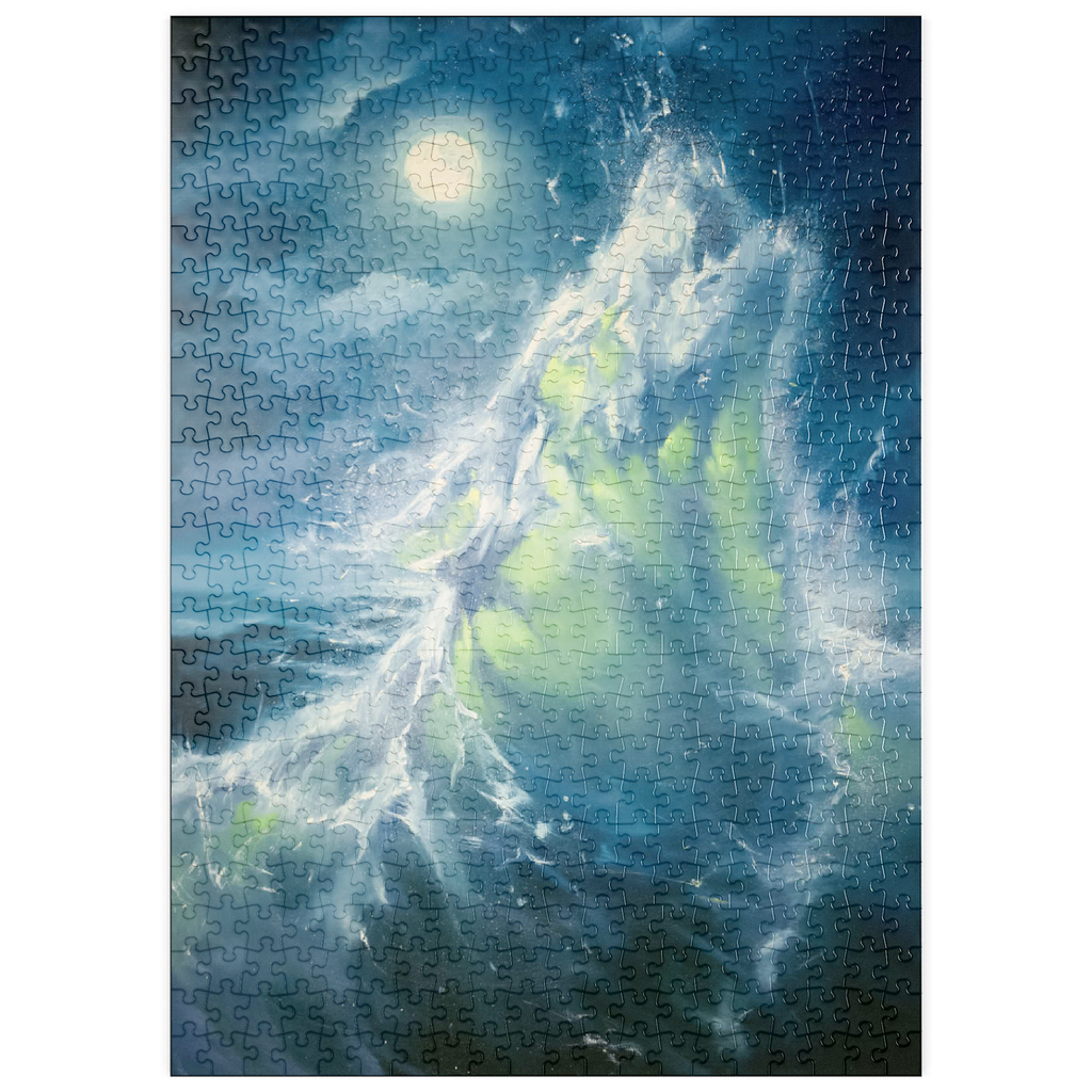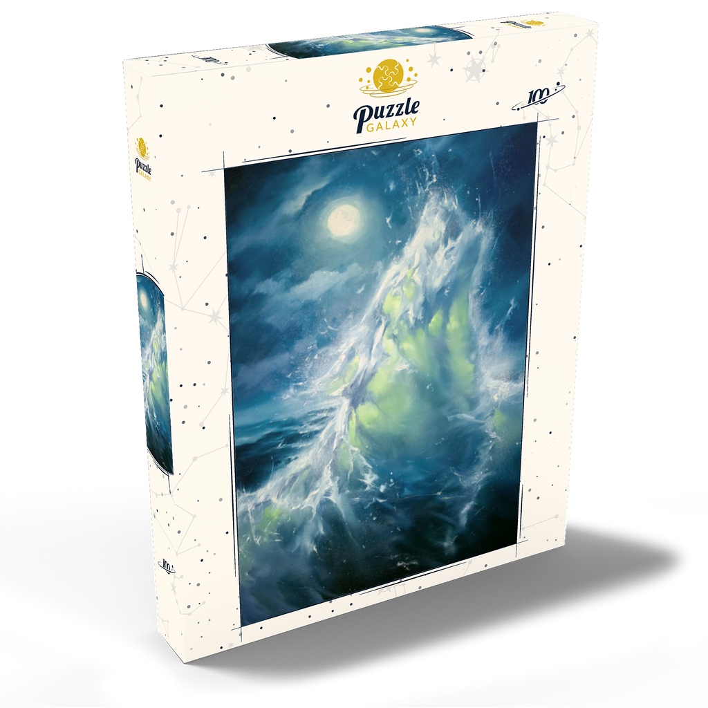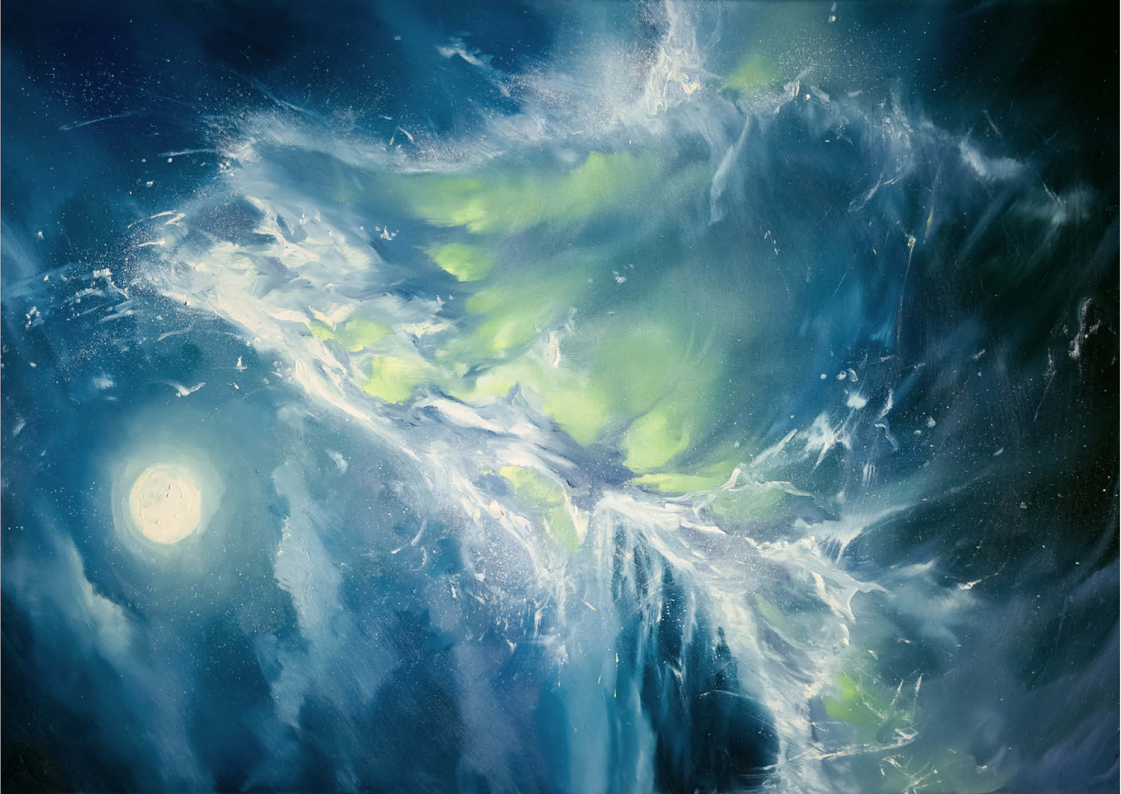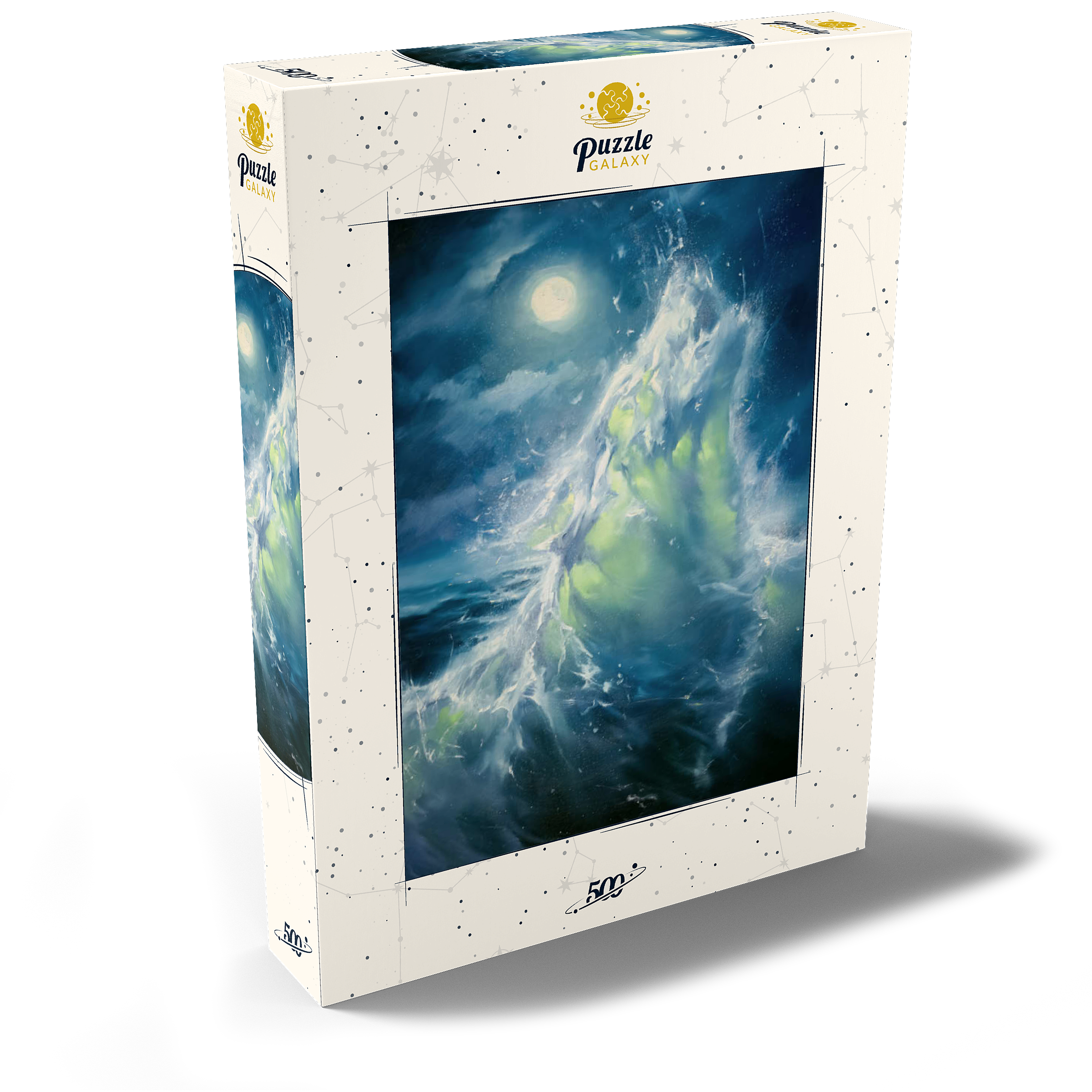 Dieses faszinierende Kunstwerk zeigt eine hoch aufragende Meereswelle, die von einem leuchtenden Vollmond beleuchtet wird. Das Gemälde verbindet Realismus mit Abstraktion und vermittelt mit schwungvollen Pinselstrichen und ätherischen Blau-, Grün- und Weißtönen die Energie und Fluidität des Meeres. Der Mond wirft ein sanftes Licht auf das turbulente Wasser und betont die durchscheinende Krone der Welle, die sich dramatisch erhebt. Die Szene ruft ein Gefühl von Staunen und roher Naturkraft hervor und ist ideal für Liebhaber von Meereslandschaften und himmlischen Stimmungen.