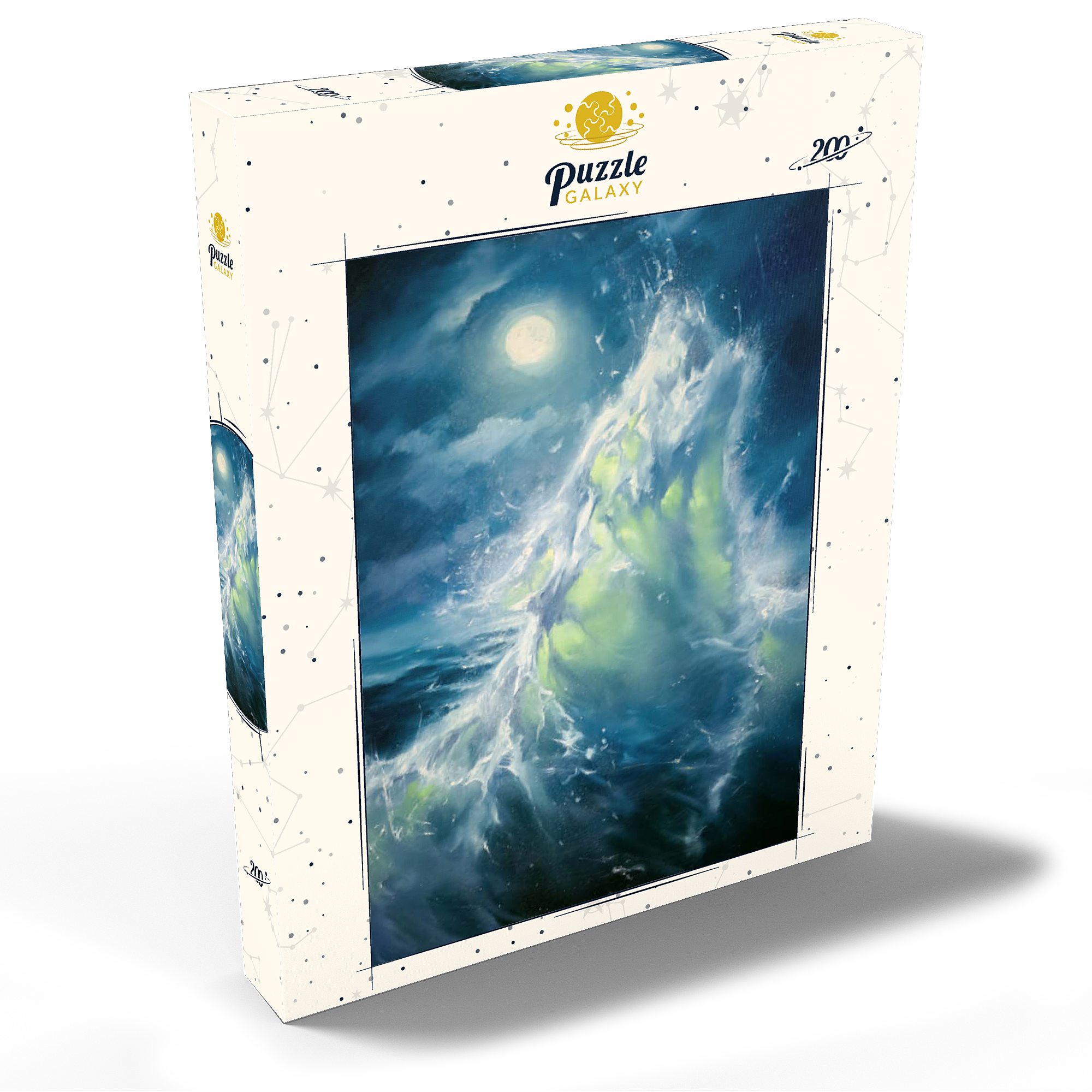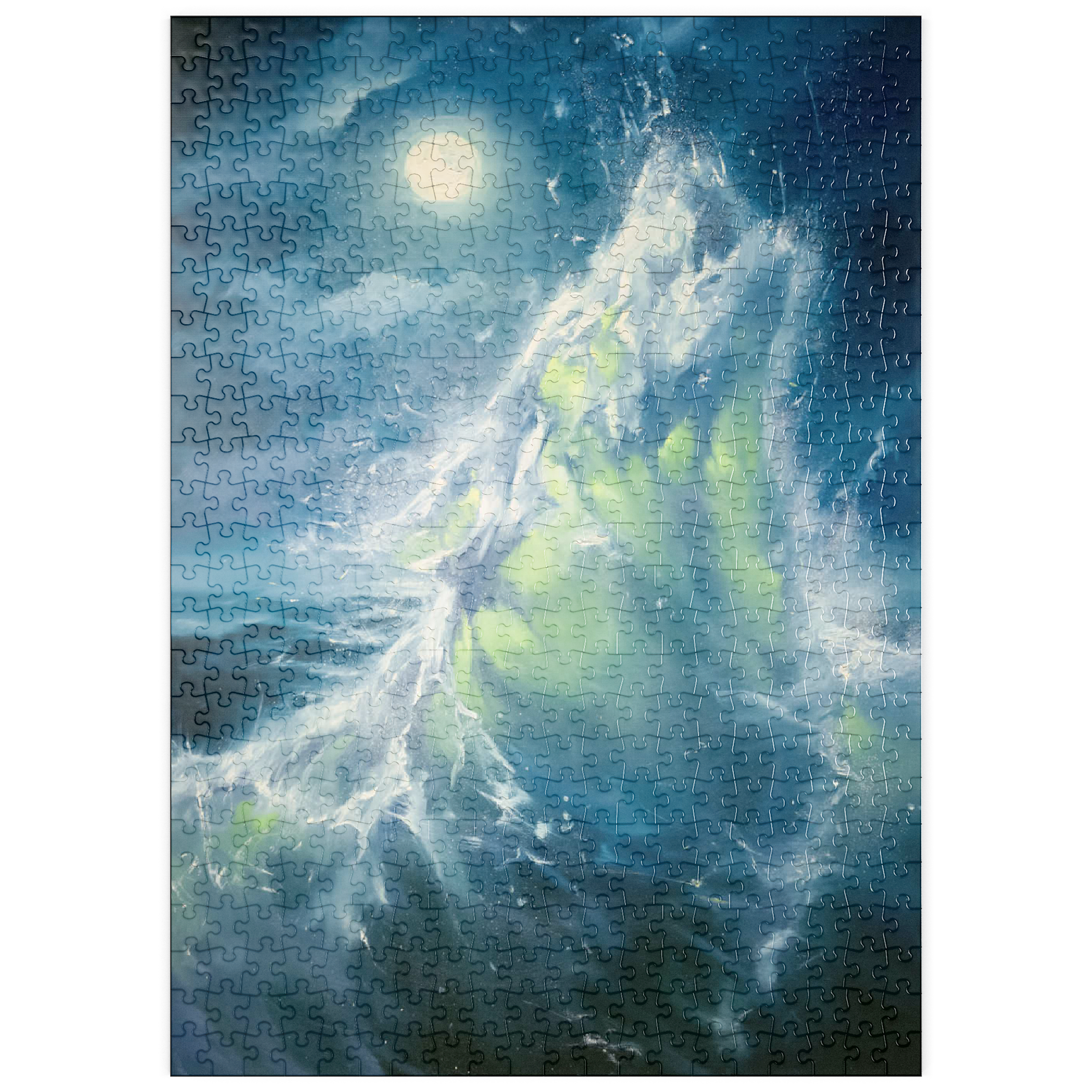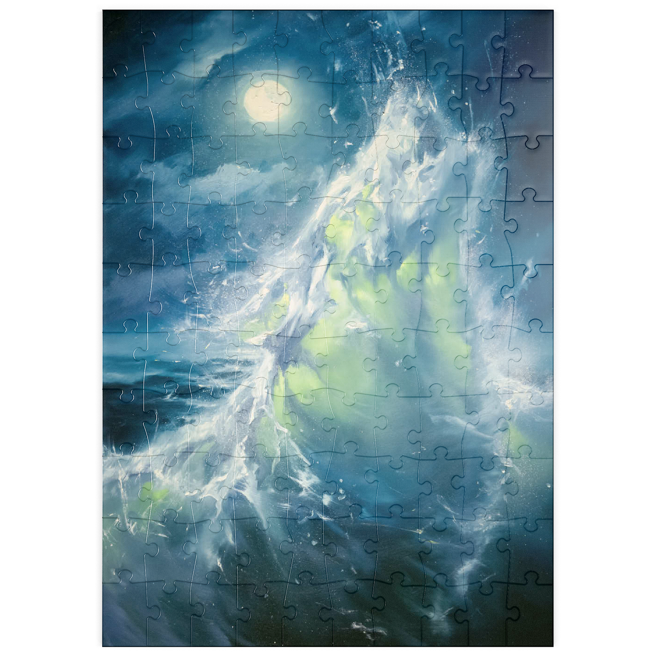 Dieses faszinierende Kunstwerk zeigt eine hoch aufragende Meereswelle, die von einem leuchtenden Vollmond beleuchtet wird. Das Gemälde verbindet Realismus mit Abstraktion und vermittelt mit schwungvollen Pinselstrichen und ätherischen Blau-, Grün- und Weißtönen die Energie und Fluidität des Meeres. Der Mond wirft ein sanftes Licht auf das turbulente Wasser und betont die durchscheinende Krone der Welle, die sich dramatisch erhebt. Die Szene ruft ein Gefühl von Staunen und roher Naturkraft hervor und ist ideal für Liebhaber von Meereslandschaften und himmlischen Stimmungen.