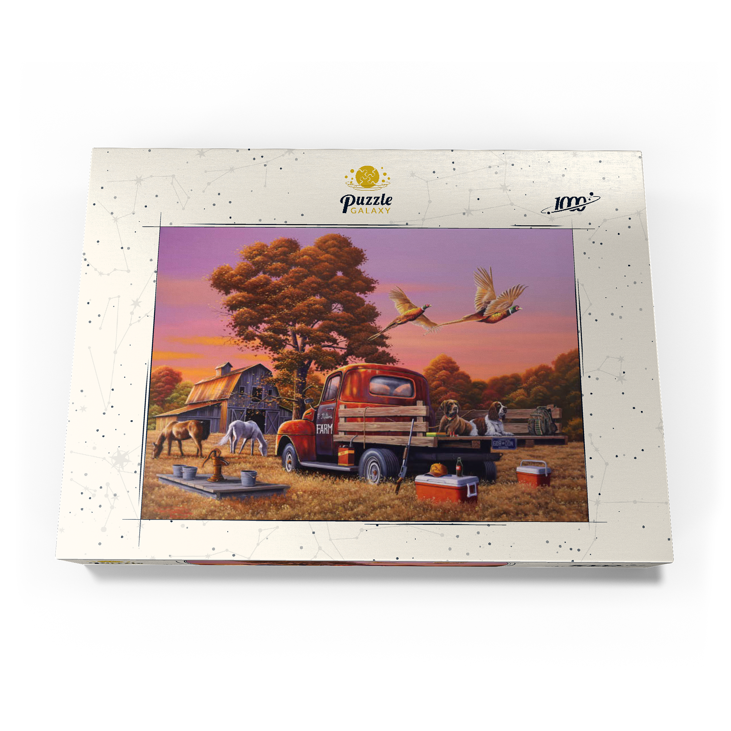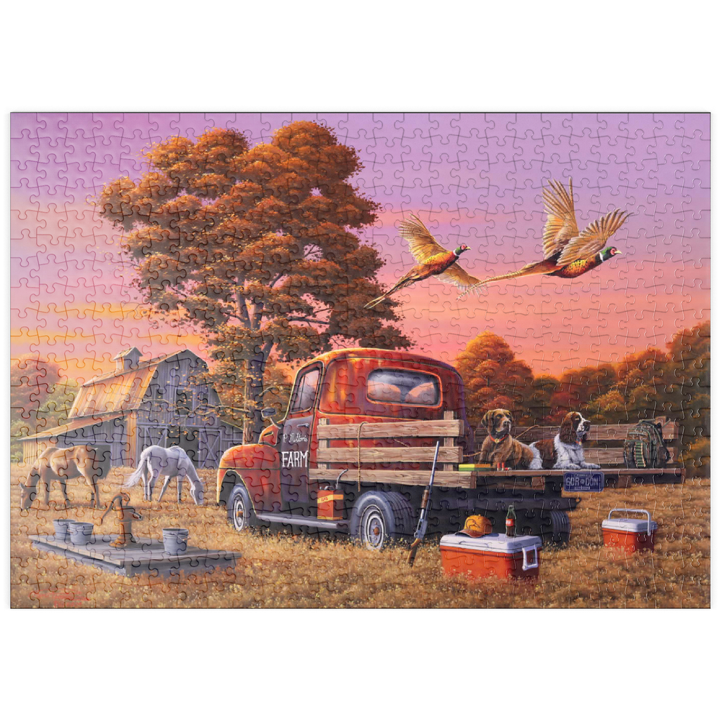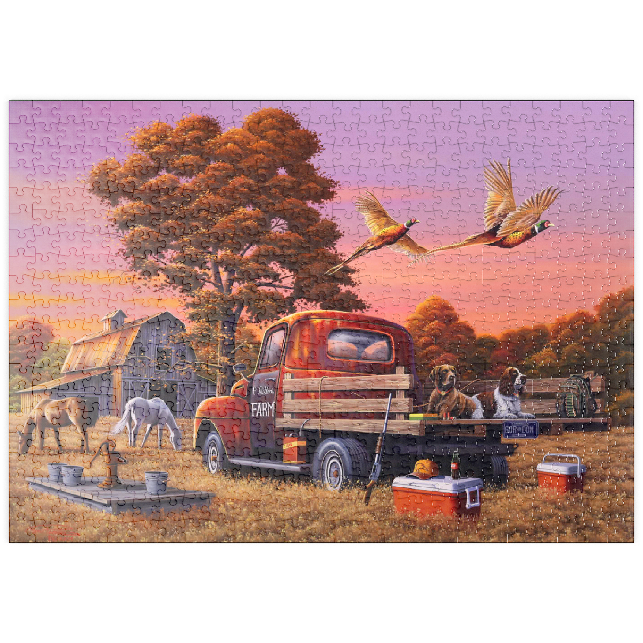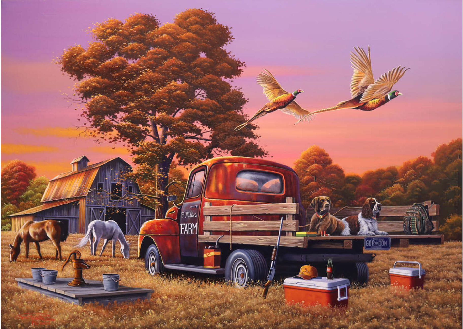 Eine nostalgische ländliche Szene mit einem klassischen roten Bauernhof-Lkw, der auf goldenem Herbstgras geparkt ist, mit zwei Jagdhunden auf der Ladefläche und über ihnen fliegenden Fasanen. Die rustikale Scheune, grasende Pferde und die umliegenden Bäume mit leuchtendem Herbstlaub schaffen eine warme und einladende Atmosphäre. Eine traditionelle Wasserpumpe und verstreute Jagdausrüstung tragen zum Charme dieser ländlichen Umgebung bei. Der leuchtende Sonnenuntergangshimmel unterstreicht die Schönheit der Landschaft und fängt die Essenz eines friedlichen Abends auf dem Bauernhof ein.