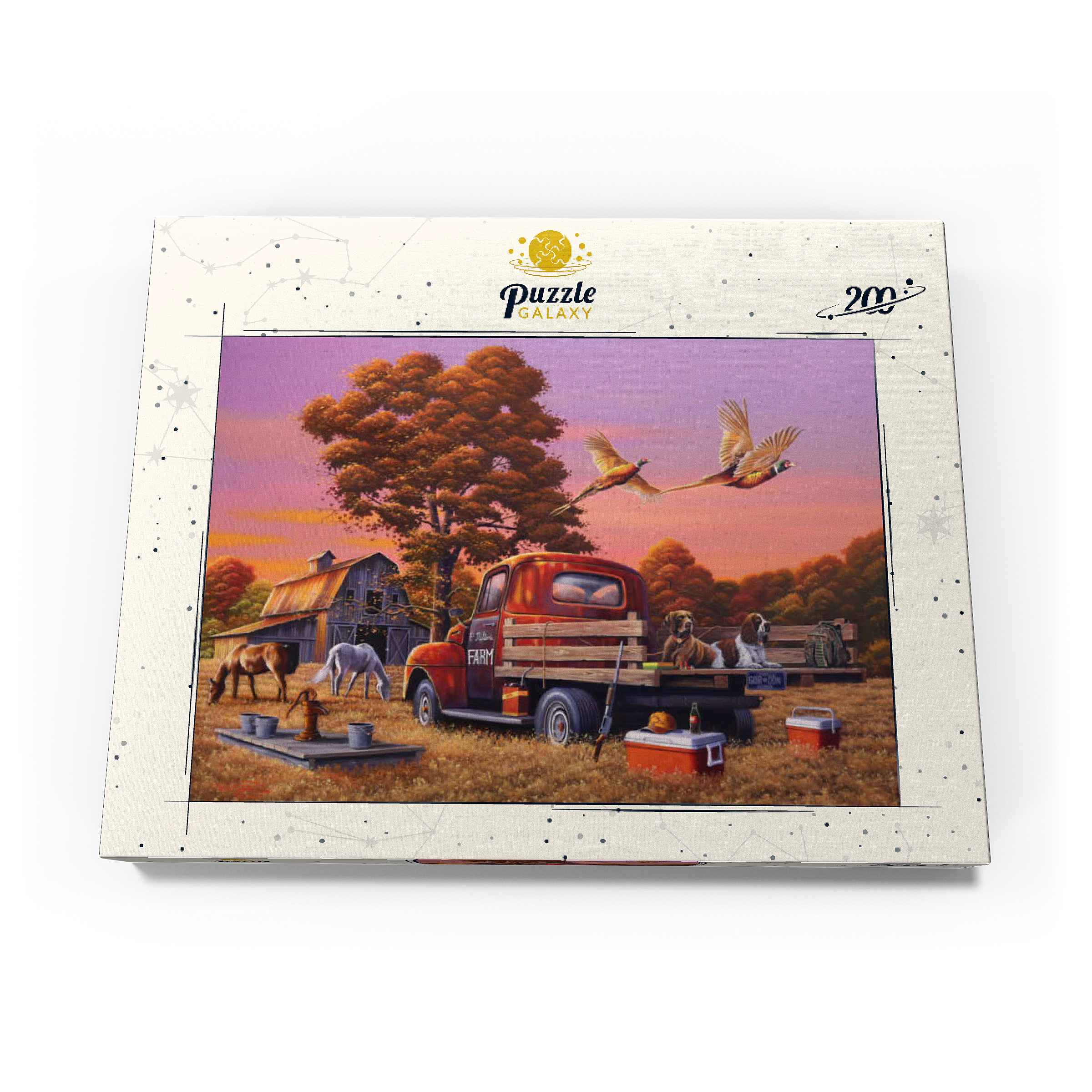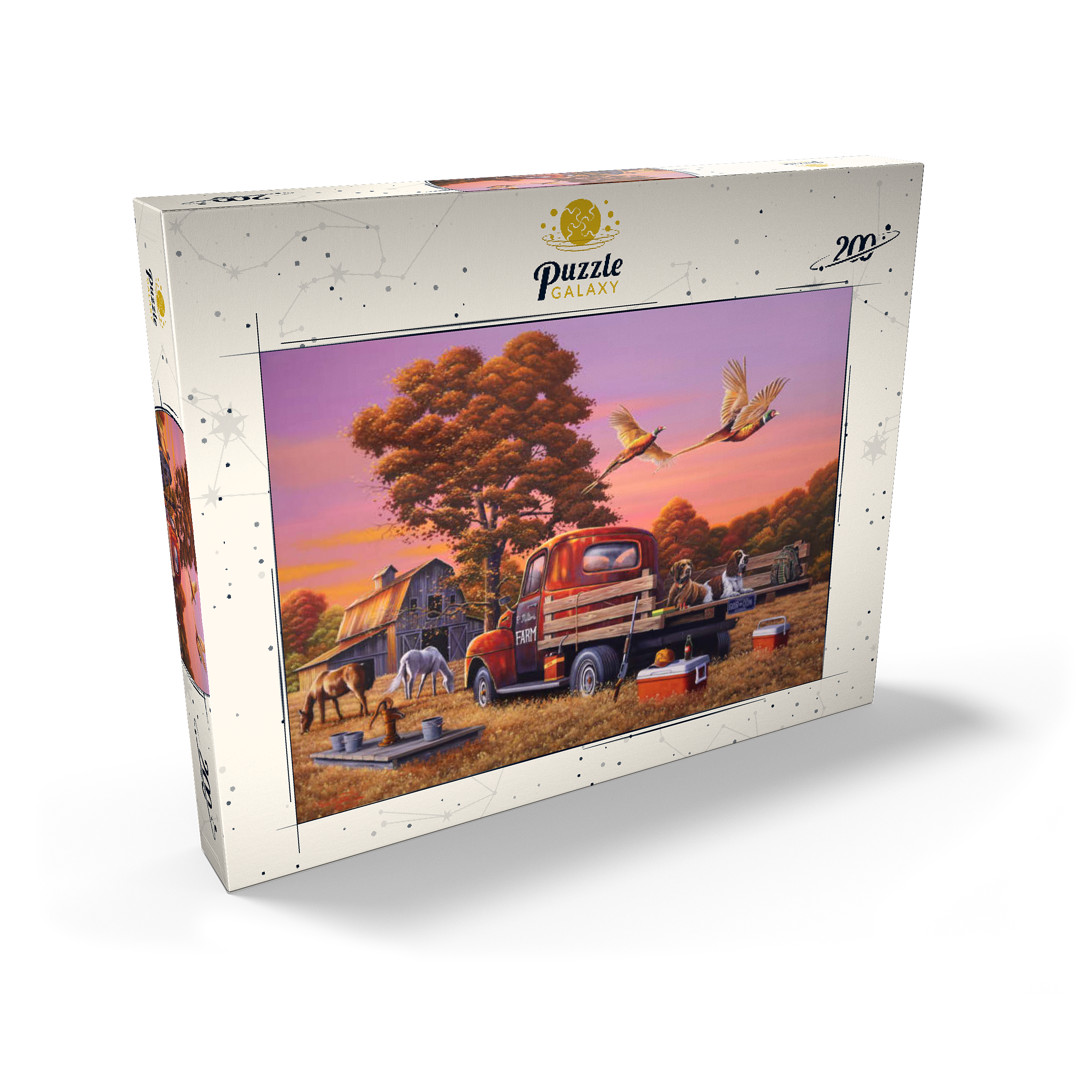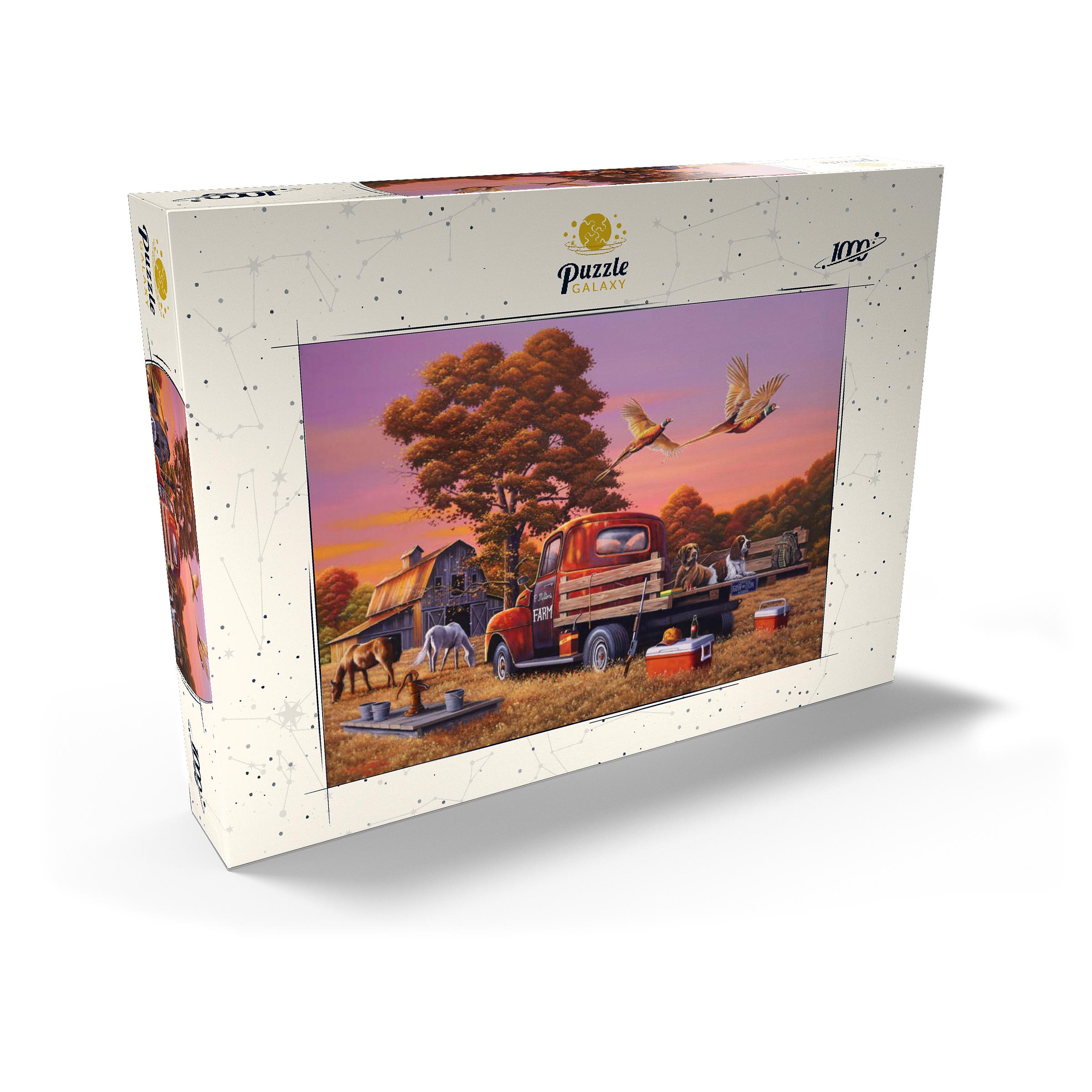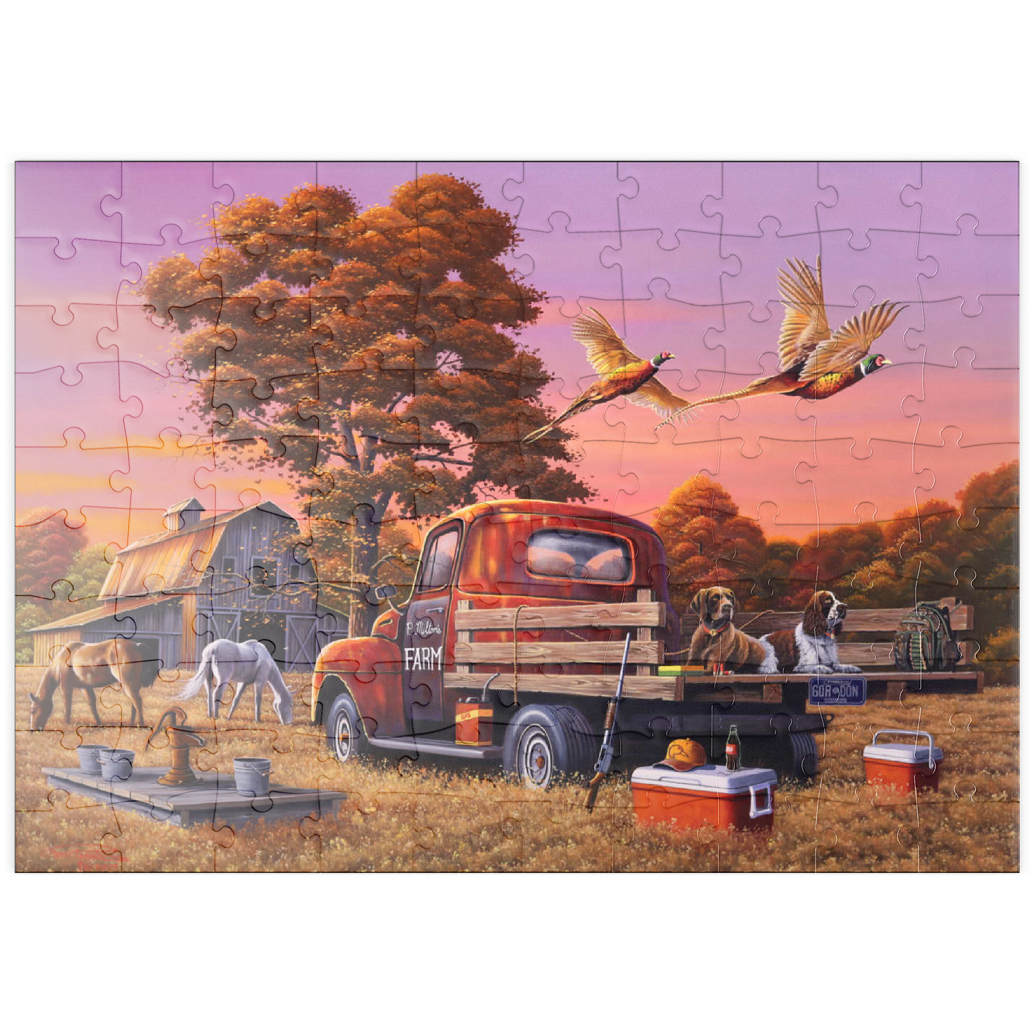 Eine nostalgische ländliche Szene mit einem klassischen roten Bauernhof-Lkw, der auf goldenem Herbstgras geparkt ist, mit zwei Jagdhunden auf der Ladefläche und über ihnen fliegenden Fasanen. Die rustikale Scheune, grasende Pferde und die umliegenden Bäume mit leuchtendem Herbstlaub schaffen eine warme und einladende Atmosphäre. Eine traditionelle Wasserpumpe und verstreute Jagdausrüstung tragen zum Charme dieser ländlichen Umgebung bei. Der leuchtende Sonnenuntergangshimmel unterstreicht die Schönheit der Landschaft und fängt die Essenz eines friedlichen Abends auf dem Bauernhof ein.