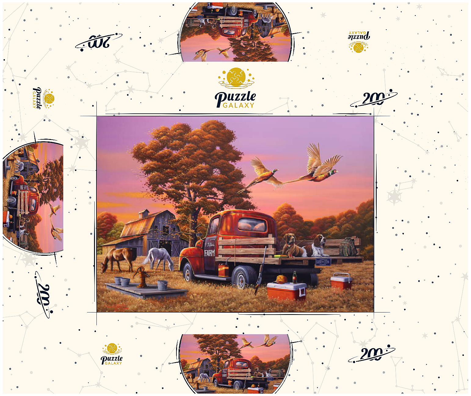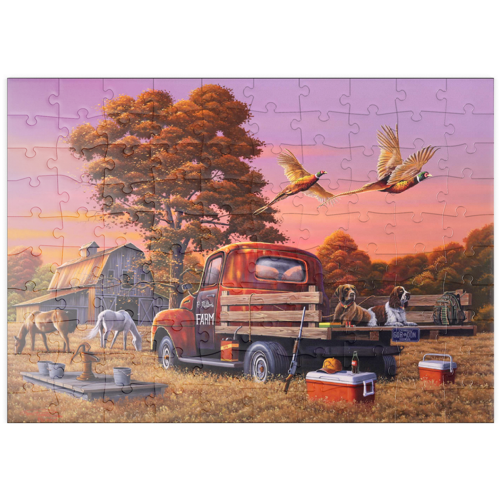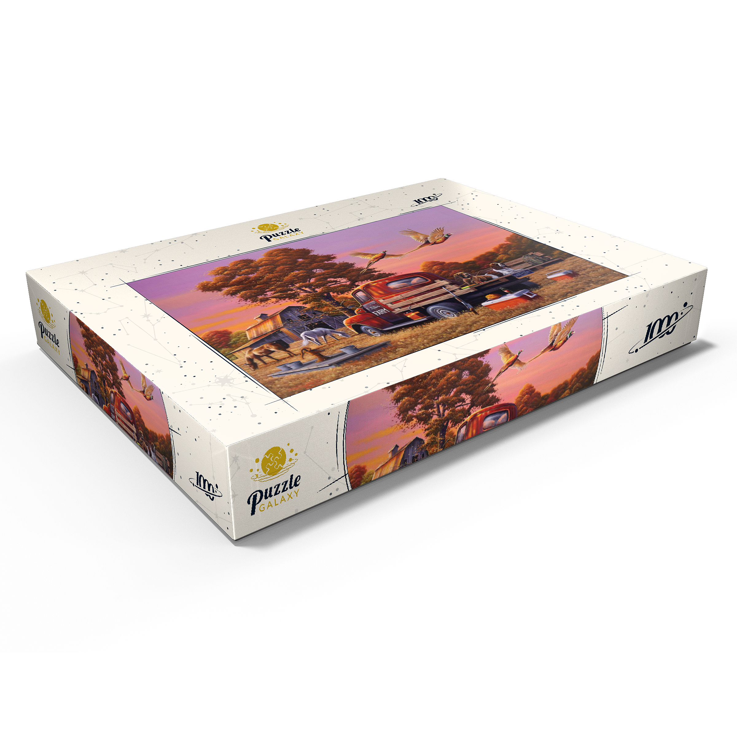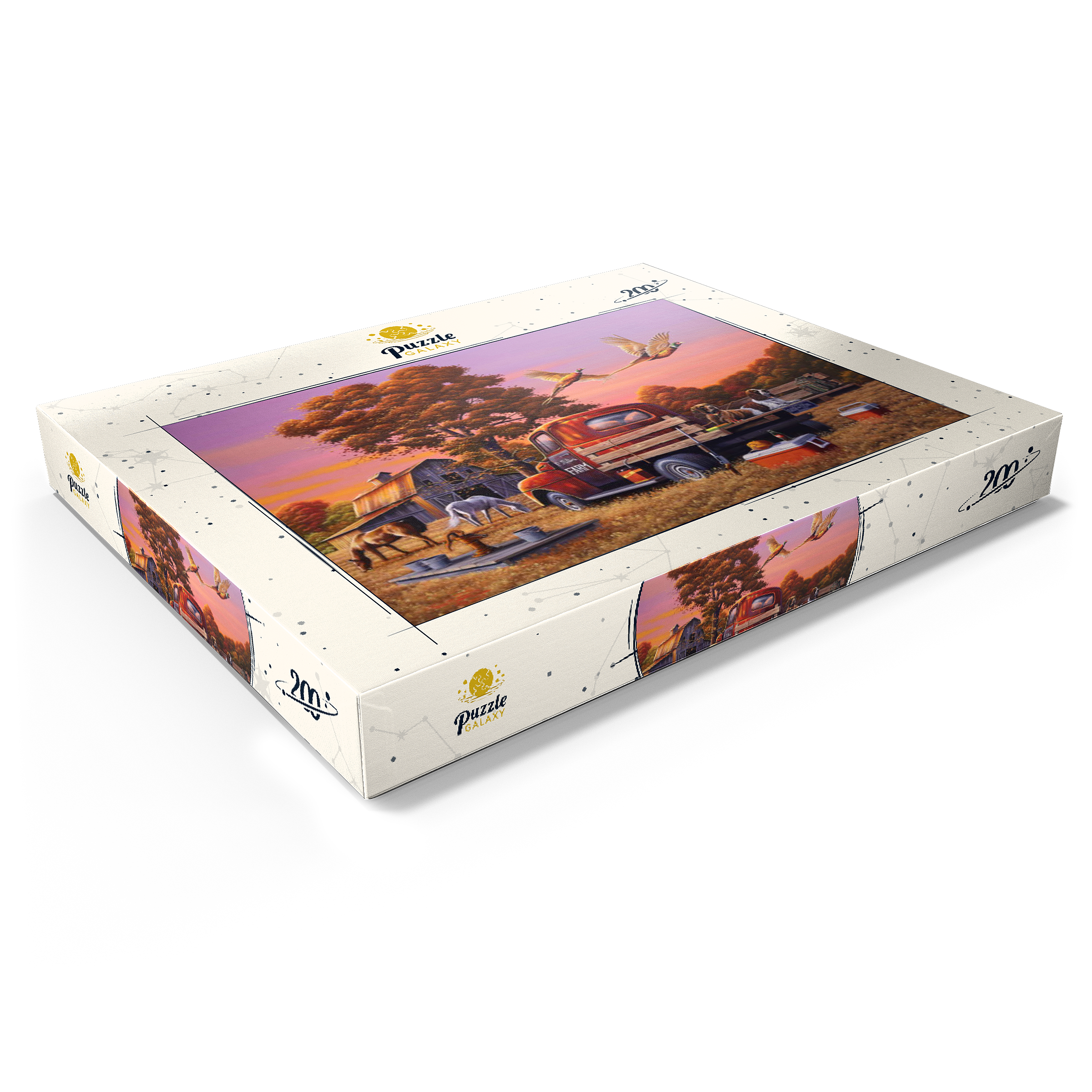 Eine nostalgische ländliche Szene mit einem klassischen roten Bauernhof-Lkw, der auf goldenem Herbstgras geparkt ist, mit zwei Jagdhunden auf der Ladefläche und über ihnen fliegenden Fasanen. Die rustikale Scheune, grasende Pferde und die umliegenden Bäume mit leuchtendem Herbstlaub schaffen eine warme und einladende Atmosphäre. Eine traditionelle Wasserpumpe und verstreute Jagdausrüstung tragen zum Charme dieser ländlichen Umgebung bei. Der leuchtende Sonnenuntergangshimmel unterstreicht die Schönheit der Landschaft und fängt die Essenz eines friedlichen Abends auf dem Bauernhof ein.