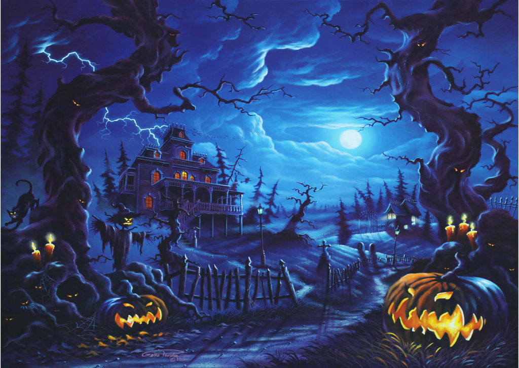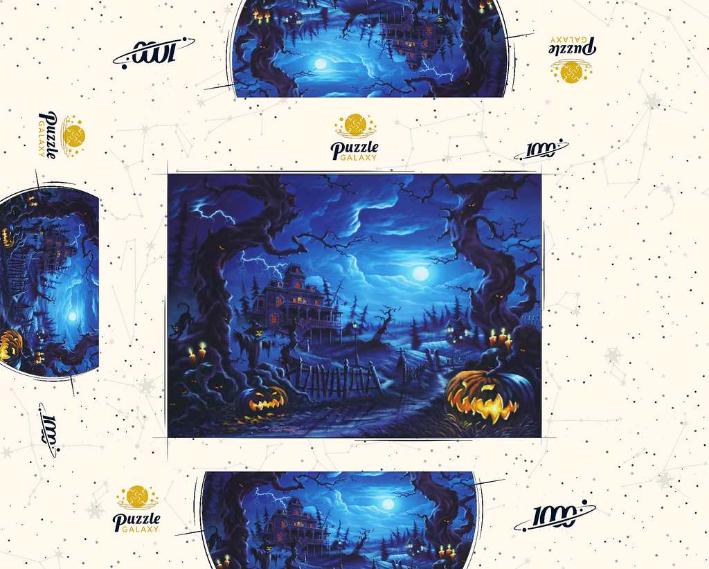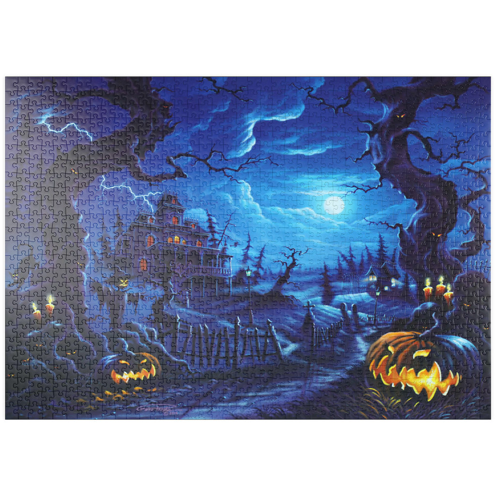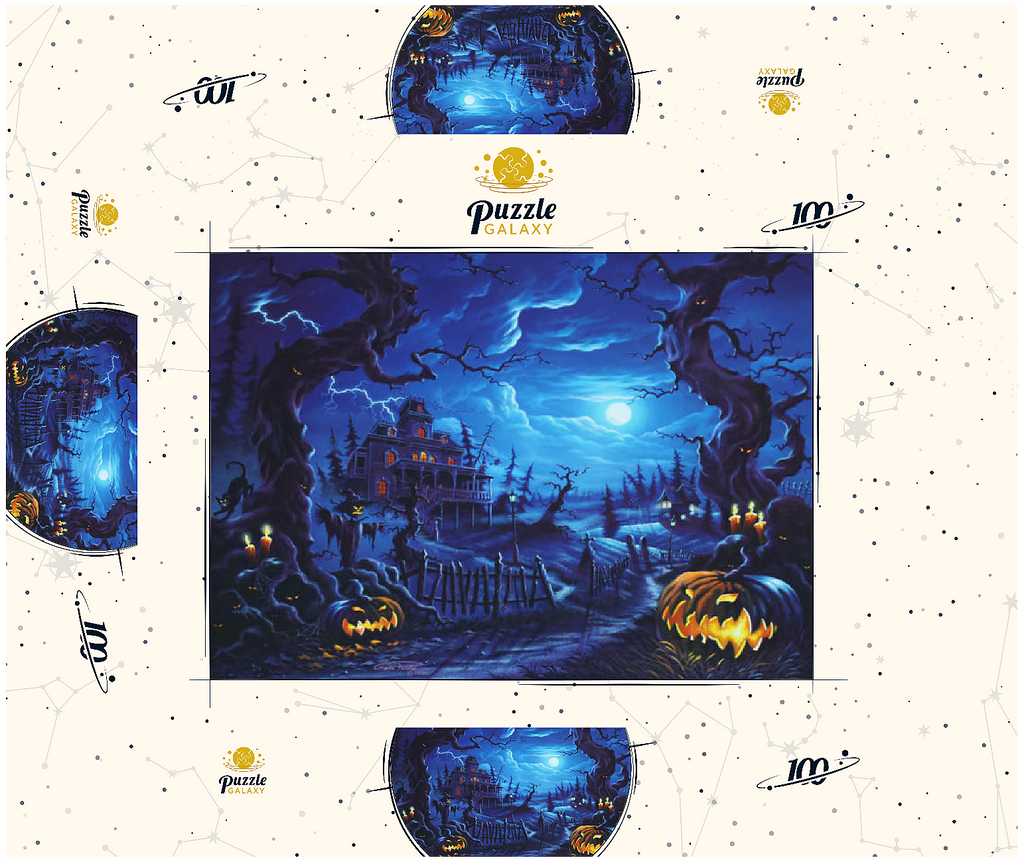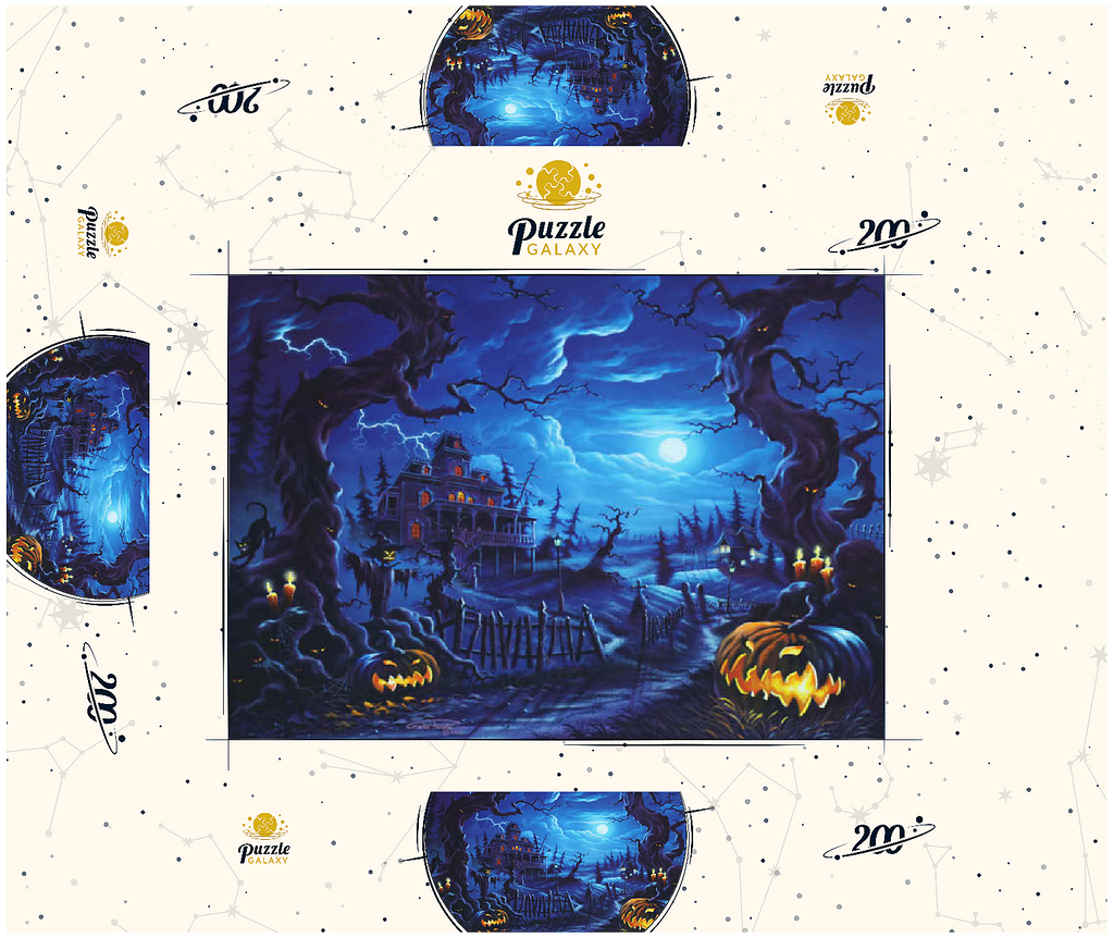 Eine gruselige Szene spielt sich unter einem leuchtenden Vollmond ab, wo am Ende eines verwundenen, schattigen Pfades ein Spukhaus aufragt. Blitze zucken über den Himmel, während leuchtende Kürbislaternen, unheimliche Vogelscheuchen und kerzenbeleuchtete Bäume eine Atmosphäre übernatürlicher Spannung schaffen. Knorrige, bedrohliche Bäume rahmen die Szene ein, ihre Gesichter spähen aus der Dunkelheit, während schwarze Katzen und flackernde Laternen das klassische Spukbild vervollständigen. Mit einem Friedhof und gespenstischen Elementen im Hintergrund fängt dieses Kunstwerk die perfekte Mischung aus Halloween-Mystik und gotischer Fantasie ein.