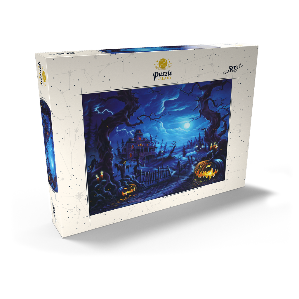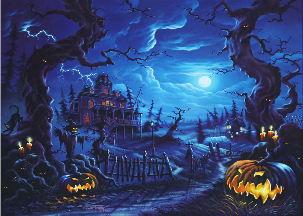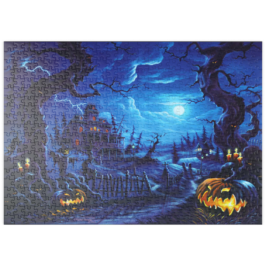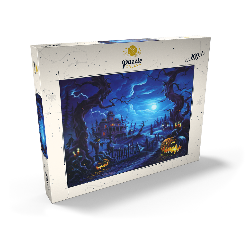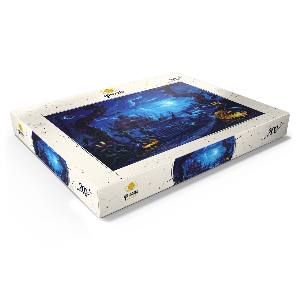 Eine gruselige Szene spielt sich unter einem leuchtenden Vollmond ab, wo am Ende eines verwundenen, schattigen Pfades ein Spukhaus aufragt. Blitze zucken über den Himmel, während leuchtende Kürbislaternen, unheimliche Vogelscheuchen und kerzenbeleuchtete Bäume eine Atmosphäre übernatürlicher Spannung schaffen. Knorrige, bedrohliche Bäume rahmen die Szene ein, ihre Gesichter spähen aus der Dunkelheit, während schwarze Katzen und flackernde Laternen das klassische Spukbild vervollständigen. Mit einem Friedhof und gespenstischen Elementen im Hintergrund fängt dieses Kunstwerk die perfekte Mischung aus Halloween-Mystik und gotischer Fantasie ein.