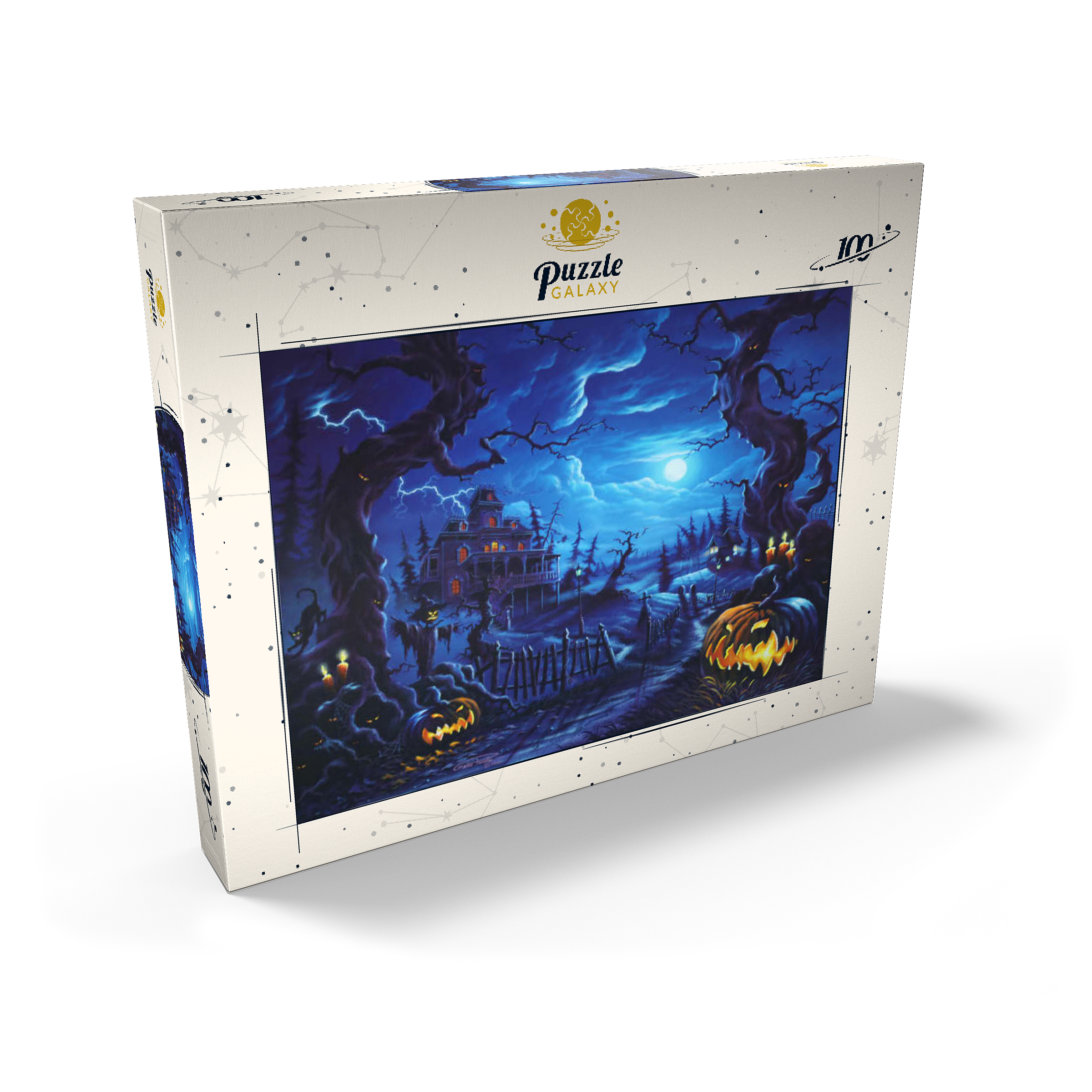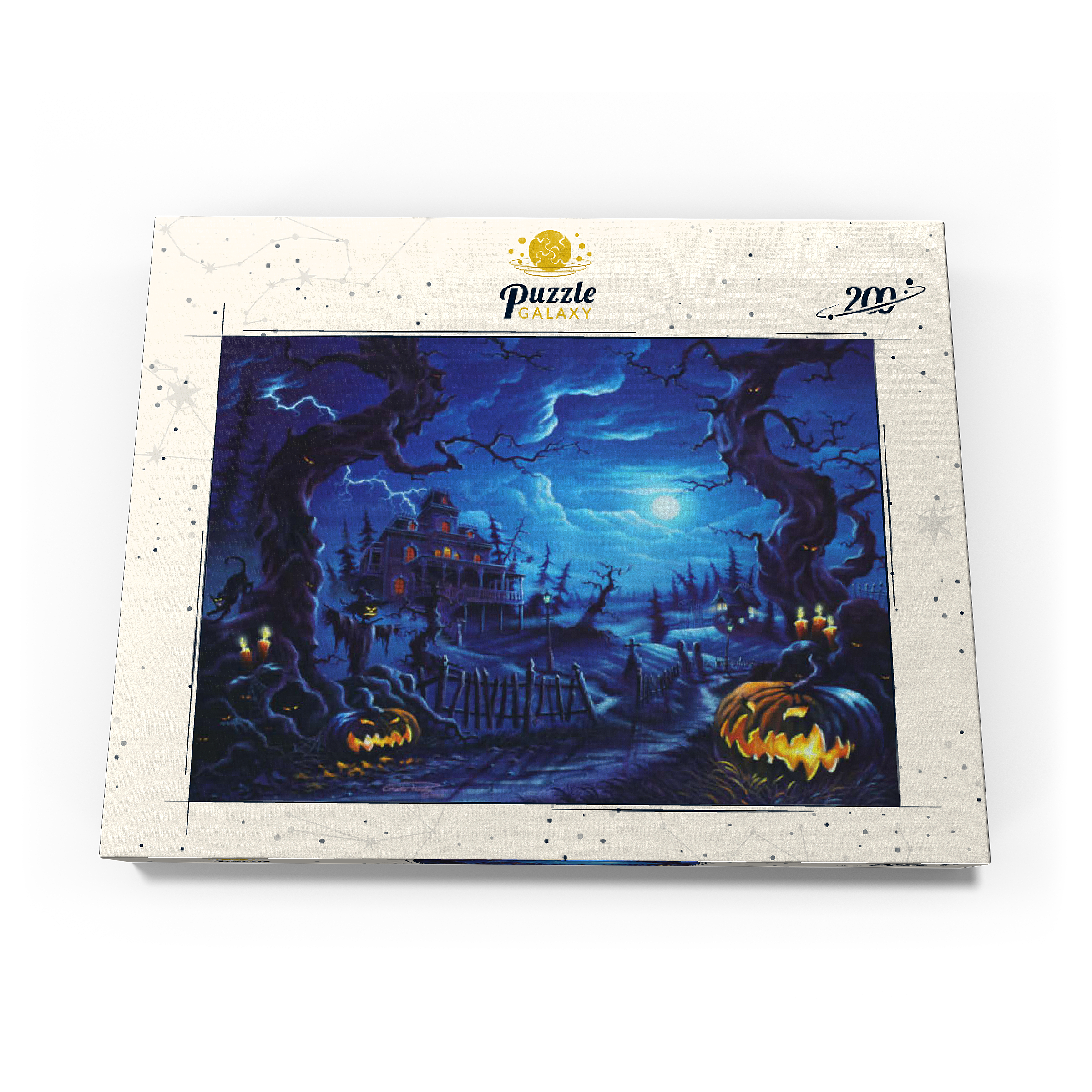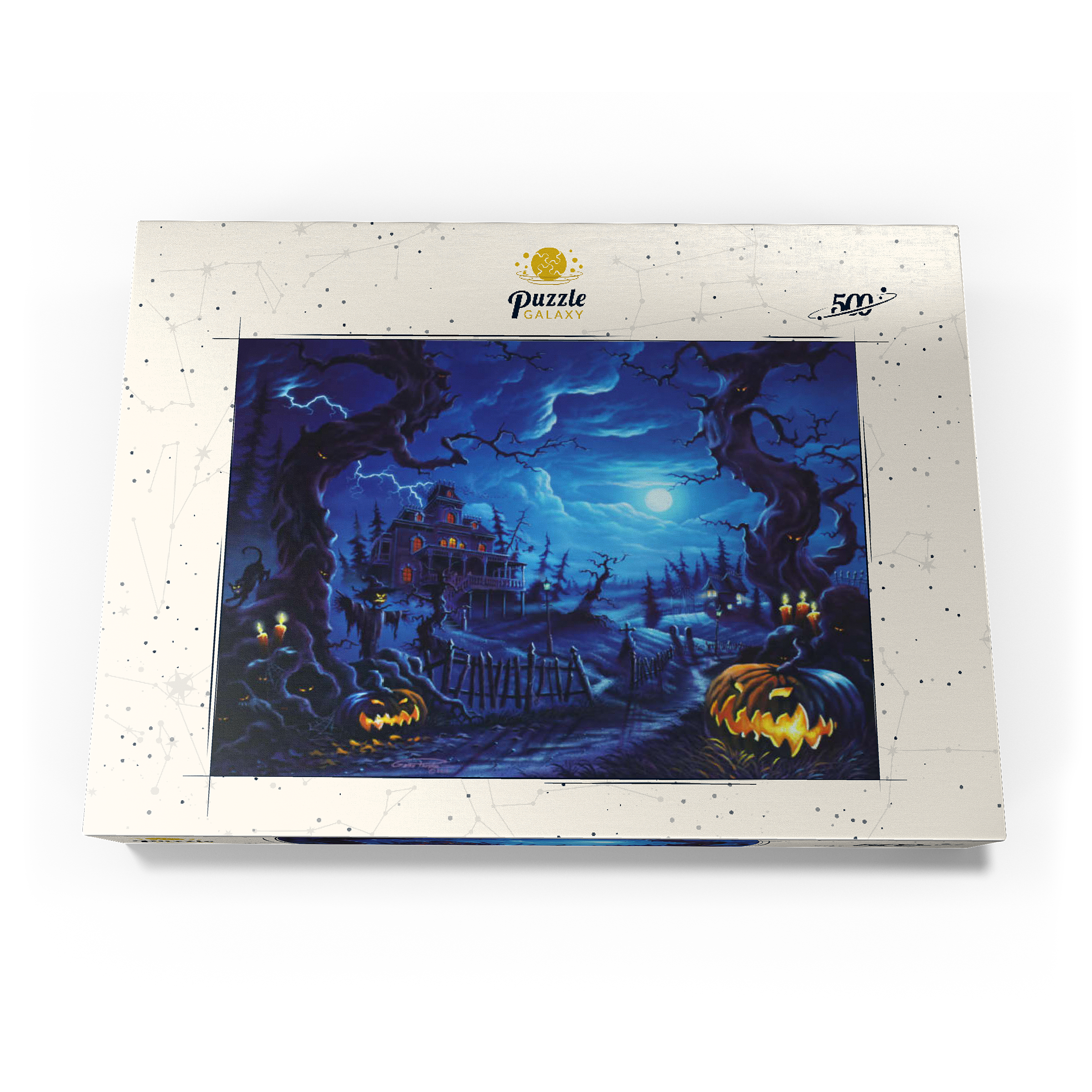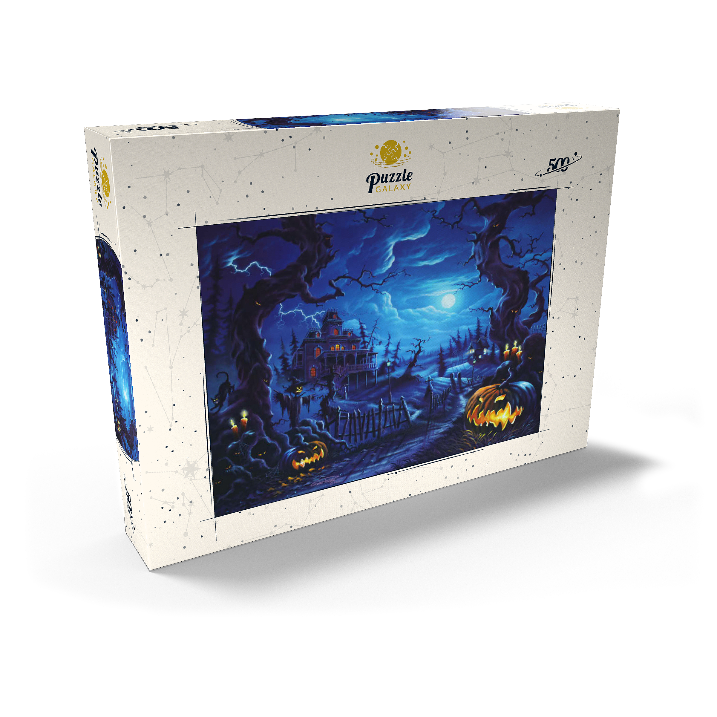 Eine gruselige Szene spielt sich unter einem leuchtenden Vollmond ab, wo am Ende eines verwundenen, schattigen Pfades ein Spukhaus aufragt. Blitze zucken über den Himmel, während leuchtende Kürbislaternen, unheimliche Vogelscheuchen und kerzenbeleuchtete Bäume eine Atmosphäre übernatürlicher Spannung schaffen. Knorrige, bedrohliche Bäume rahmen die Szene ein, ihre Gesichter spähen aus der Dunkelheit, während schwarze Katzen und flackernde Laternen das klassische Spukbild vervollständigen. Mit einem Friedhof und gespenstischen Elementen im Hintergrund fängt dieses Kunstwerk die perfekte Mischung aus Halloween-Mystik und gotischer Fantasie ein.