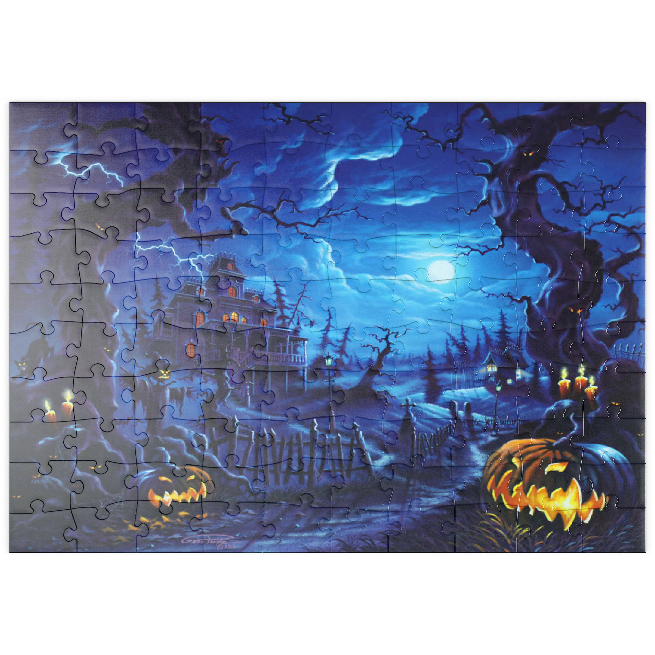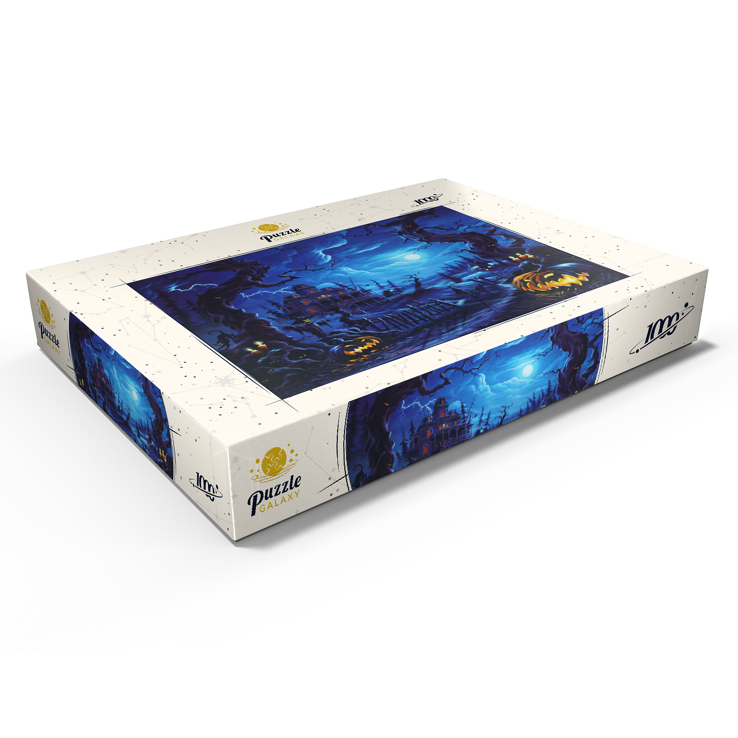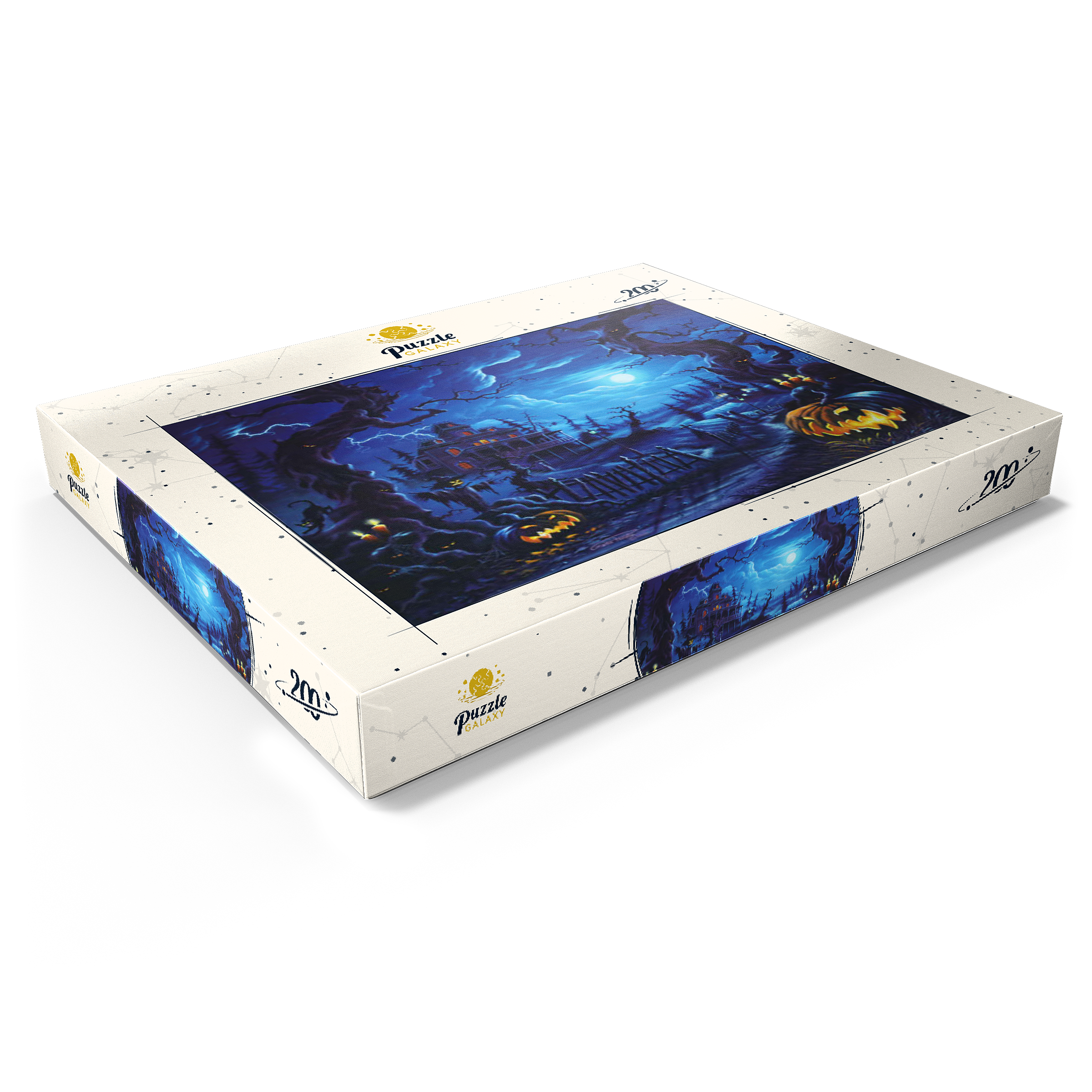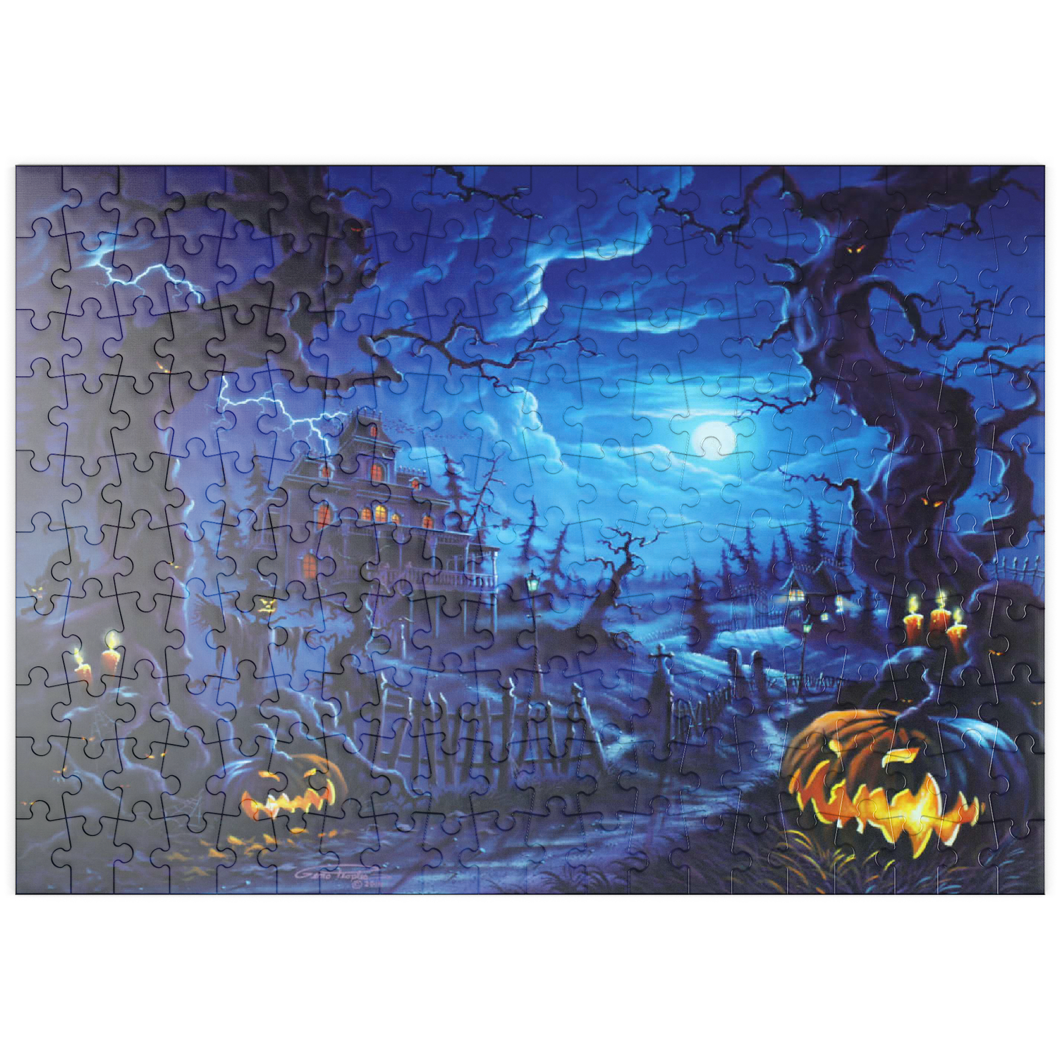 Eine gruselige Szene spielt sich unter einem leuchtenden Vollmond ab, wo am Ende eines verwundenen, schattigen Pfades ein Spukhaus aufragt. Blitze zucken über den Himmel, während leuchtende Kürbislaternen, unheimliche Vogelscheuchen und kerzenbeleuchtete Bäume eine Atmosphäre übernatürlicher Spannung schaffen. Knorrige, bedrohliche Bäume rahmen die Szene ein, ihre Gesichter spähen aus der Dunkelheit, während schwarze Katzen und flackernde Laternen das klassische Spukbild vervollständigen. Mit einem Friedhof und gespenstischen Elementen im Hintergrund fängt dieses Kunstwerk die perfekte Mischung aus Halloween-Mystik und gotischer Fantasie ein.